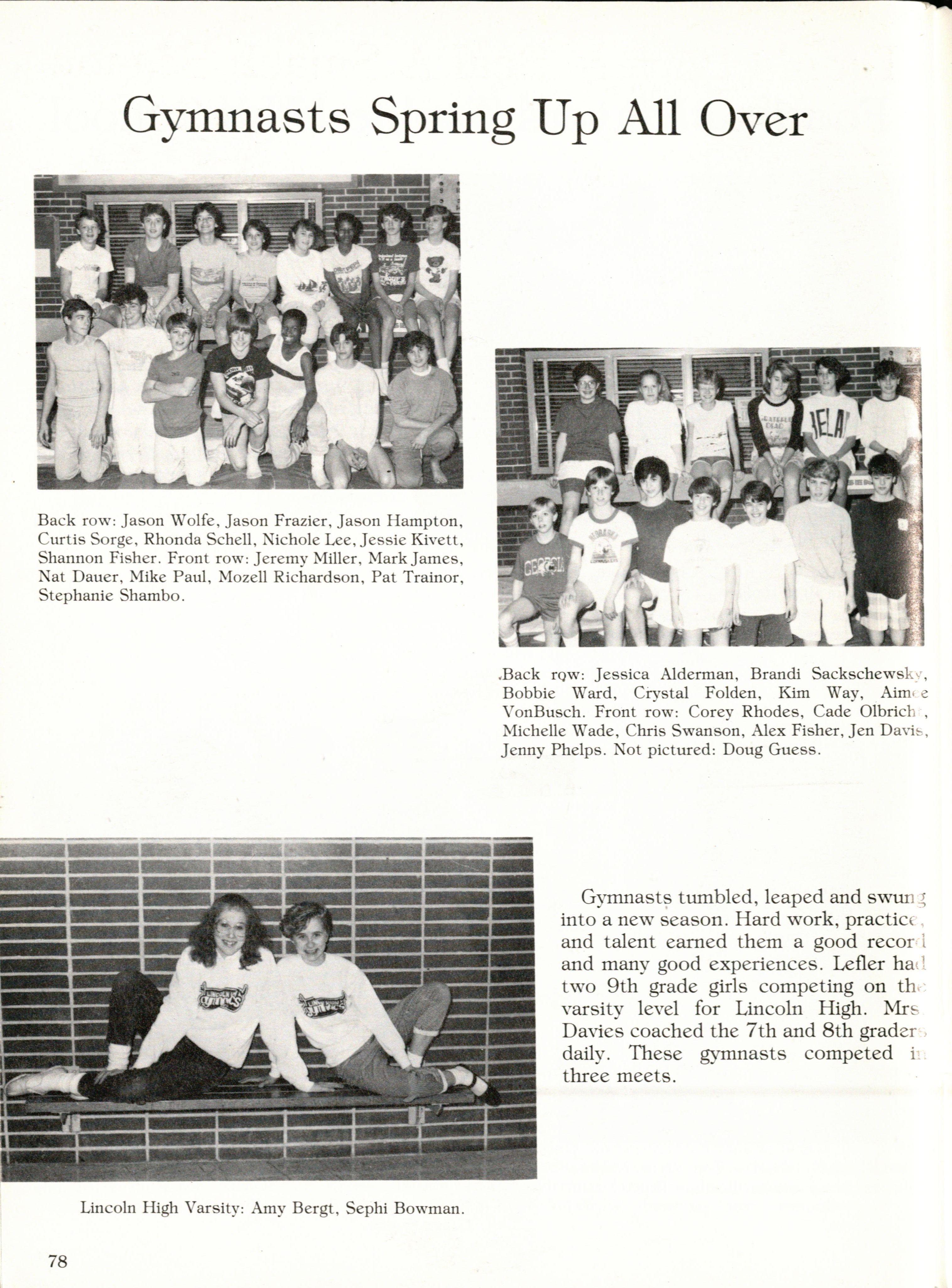 Gymnasts tumbled, leaped and sw into a new season. Hard work, p ra ctic ( and talent earned them a good reco r i and many good experiences. Le fl e r ha .~ two 9th grade girls competing o n th varsity level for Lincoln High . Mr Davies coached the 7th and 8th gr ad er daily. These gymnasts competed L three meets.