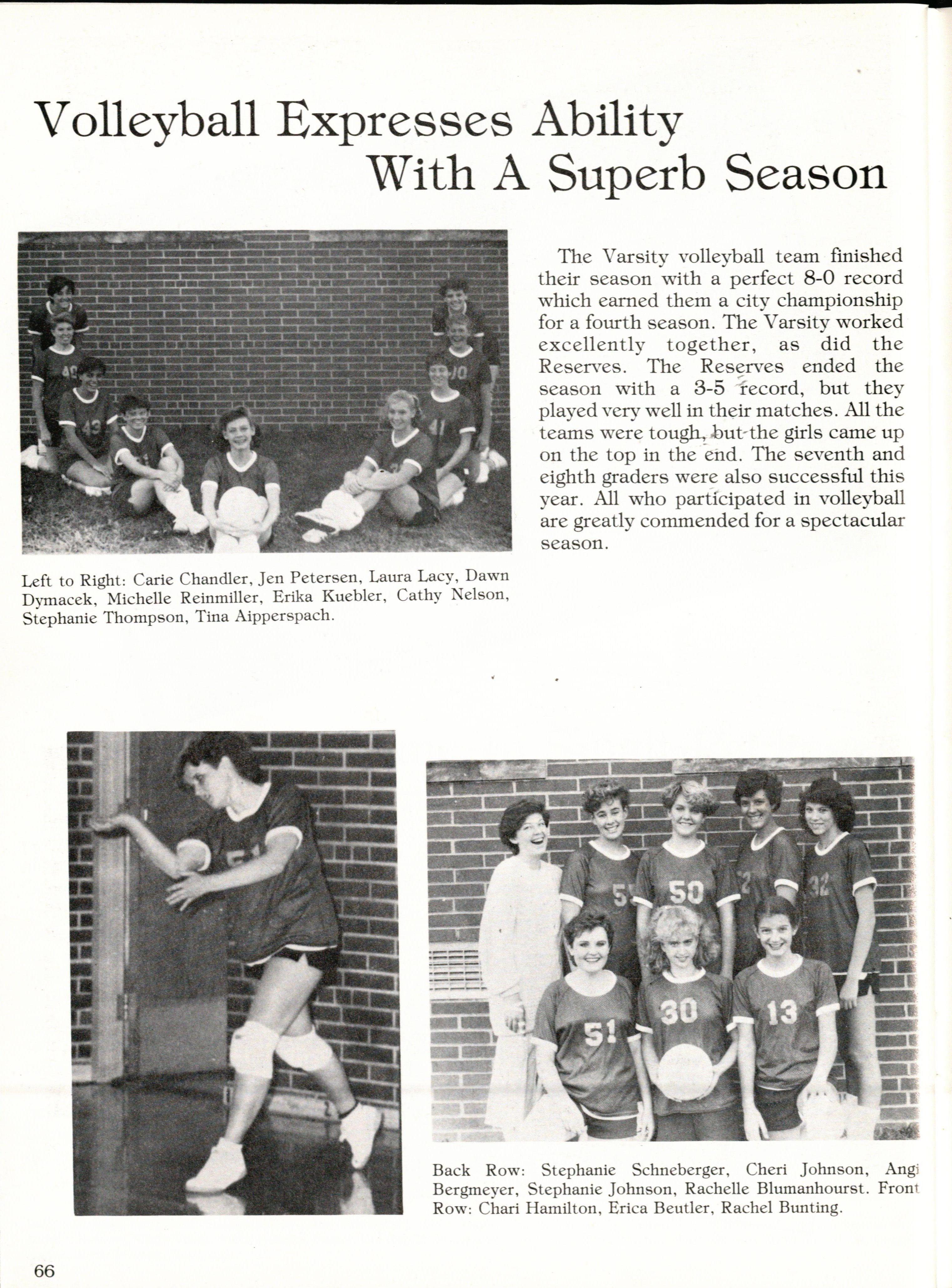 The Varsity volleyball te am finished their season with a pe rfect 8-0 recor d which earned them a city c hampionshi p for a fourth season . T he V arsi ty worked excellently togethe r , as did th e Reserves. The R eserves e nded th e season with a 3-5 f ec ord , but the y played very well in th~ ir m a tc h e s. All th e teams were tough,. .hut- the girls came u p on the top in the end. The sev en t h an d eighth gra ders were also s uc ce ssful thi s year. All who participated in v olleyb all are greatly commended for a s p e c t acul ar season.