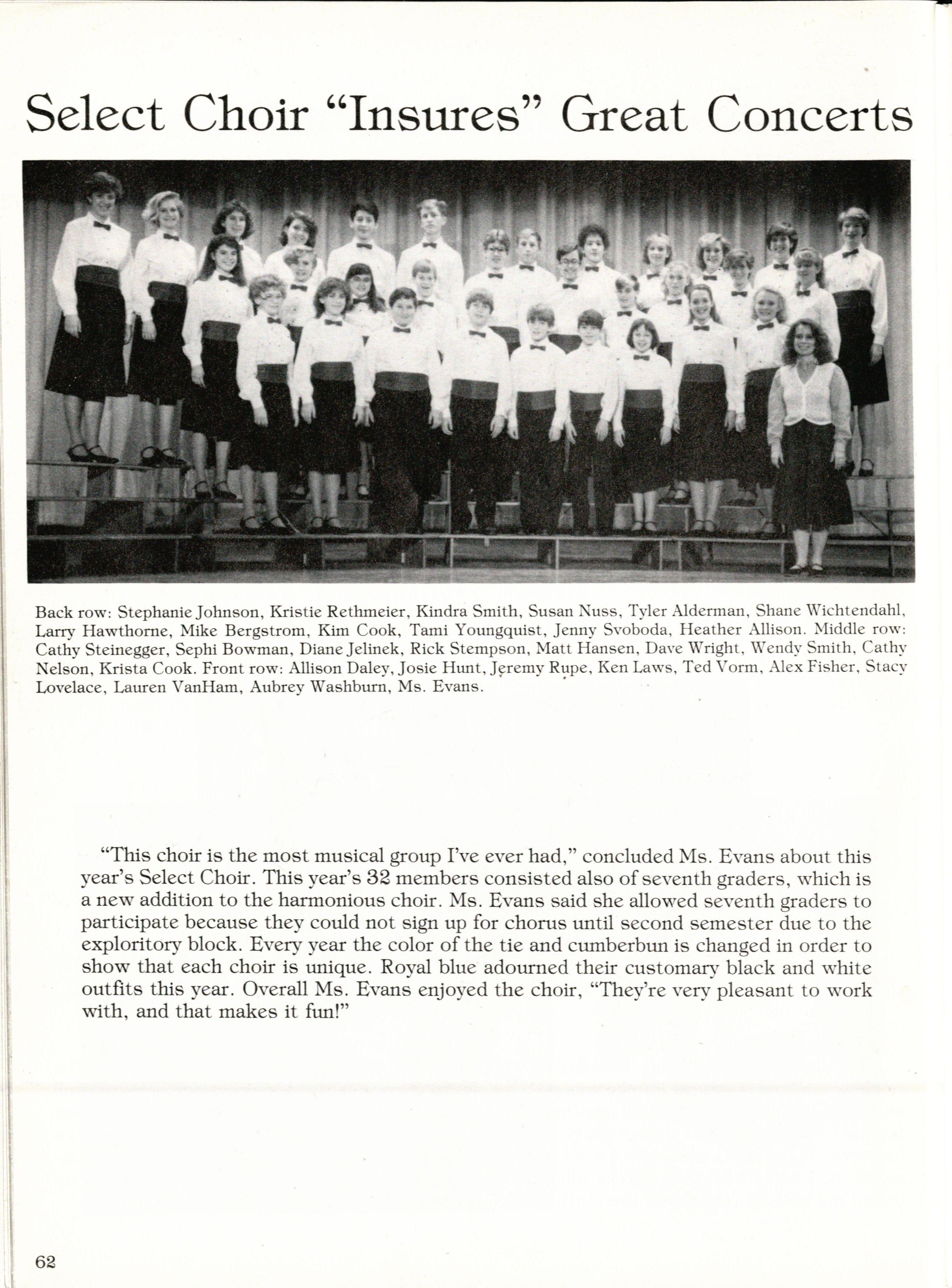 "This choir is the most musical group I've ever had ," concluded Ms. Evans about thi year's Select Choir. This year's 32 members con isted also of seventh graders, which is a new addition to the harmonious choir. Ms. Evans said she allowed seventh graders to participate because they could not sign up for chorus until second semester due to the exploritory block. Every year the color of the tie and cumberbun is changed in order to show that each choir is unique. Royal blue adourned their customary black and white outfits this year. Overall Ms. Evans enjoyed the choir, "They're very pleasant to work with and that makes it fun!"