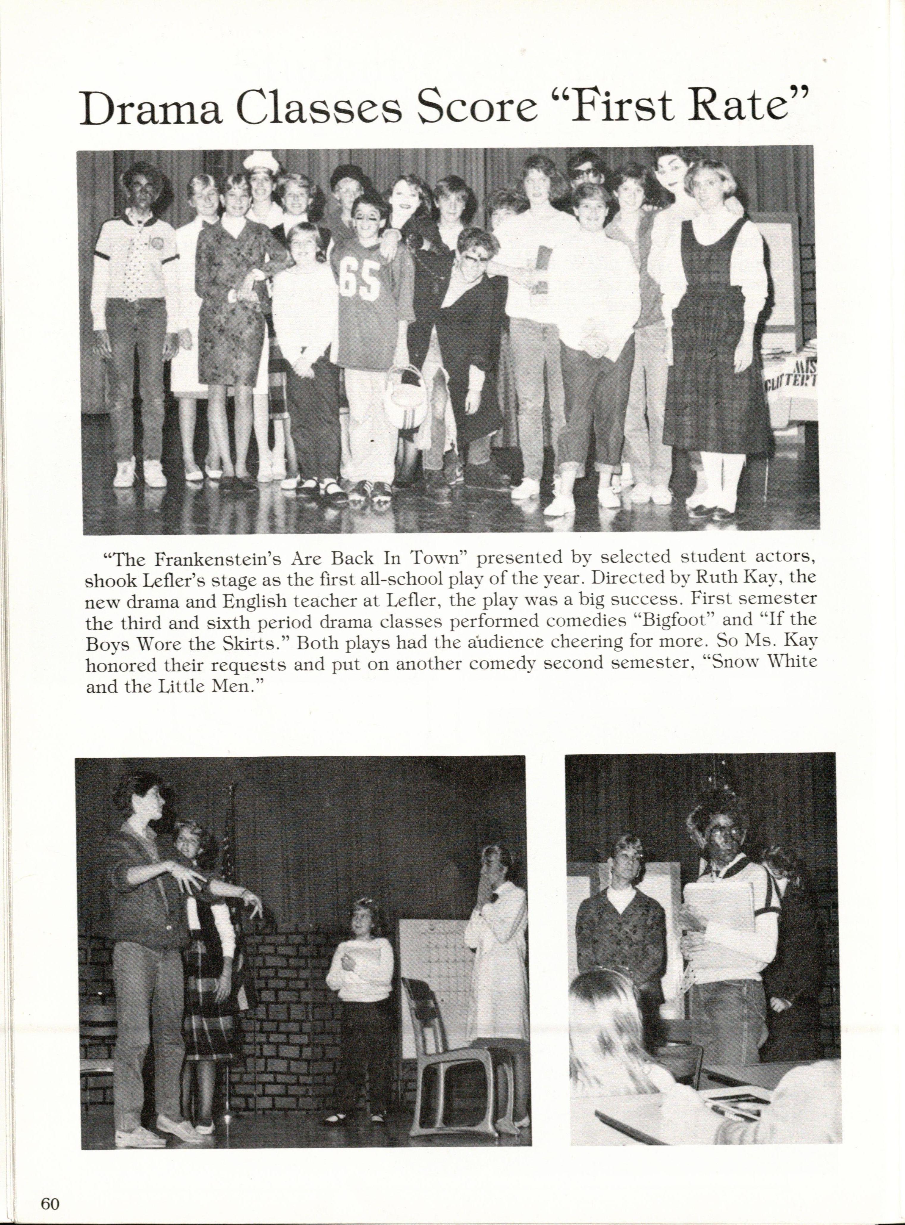 "The Frankenstein's Are Back In Town" presented by selected student actors, shook Lefler's stage as the first all-school play of the year. Directed b) Ruth Kay, the new drama and English teacher at Lefler , the play was a big success. First semeste r the third and sixth period drama classes performed comedies "Bigfoot" and "If the Bo ys Wore the Skirts." Both plays had the audience cheering for more. So Ms. Kay honored their requests and put on another comedy second semester, "Snow White and the Little Men."