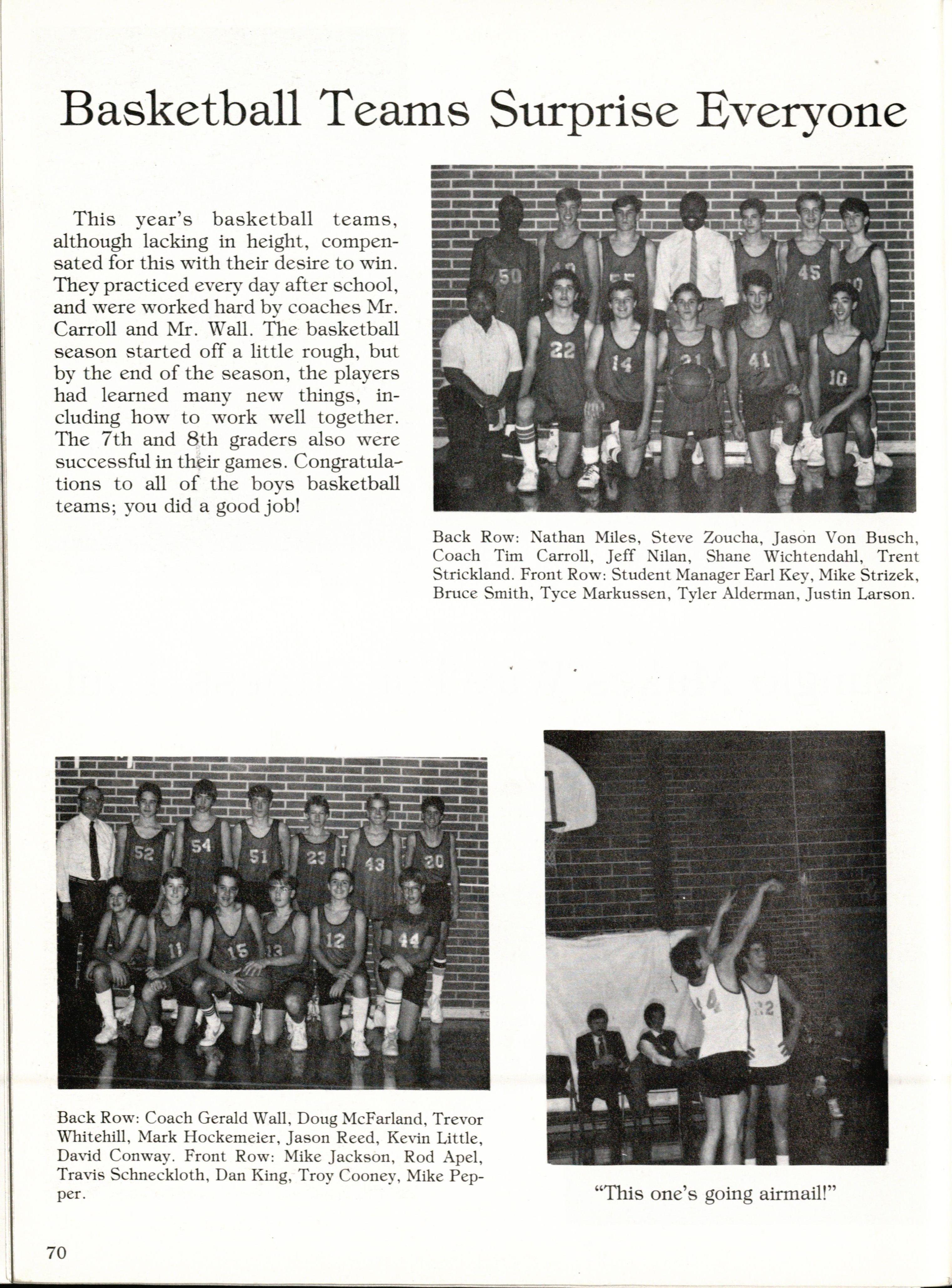 This year's basketball teams, although lacking in height, compens a ted for this with their desire to win. Th ey practiced every day after school, and we r e worked hard by coaches Mr. Carr oll and Mr. Wall. The basketball season started off a little rough, but by the end of the season, the players had learned many new things, including how to work well together. The 7th and 8th graders also were s u ccessful in their games. Congratulations to all of the boys basketball teams; you did a good job!