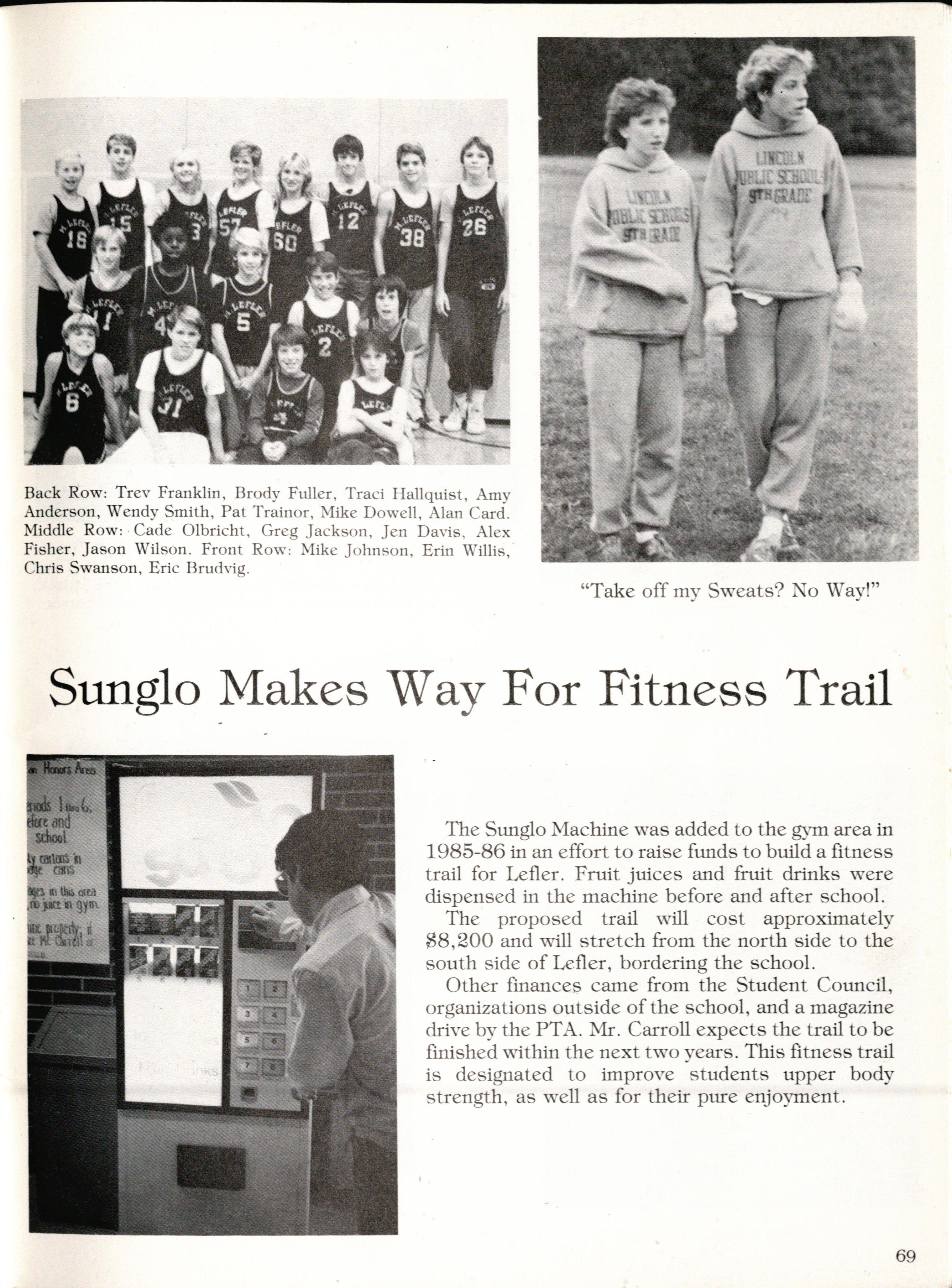 The Sunglo Machine wa added to the gym area in 1985-86 in an effort to raise funds to build a fitness trail for Lefler. Fruit juices and fruit drinks we r e dispensed in the machine before and after schoo l.