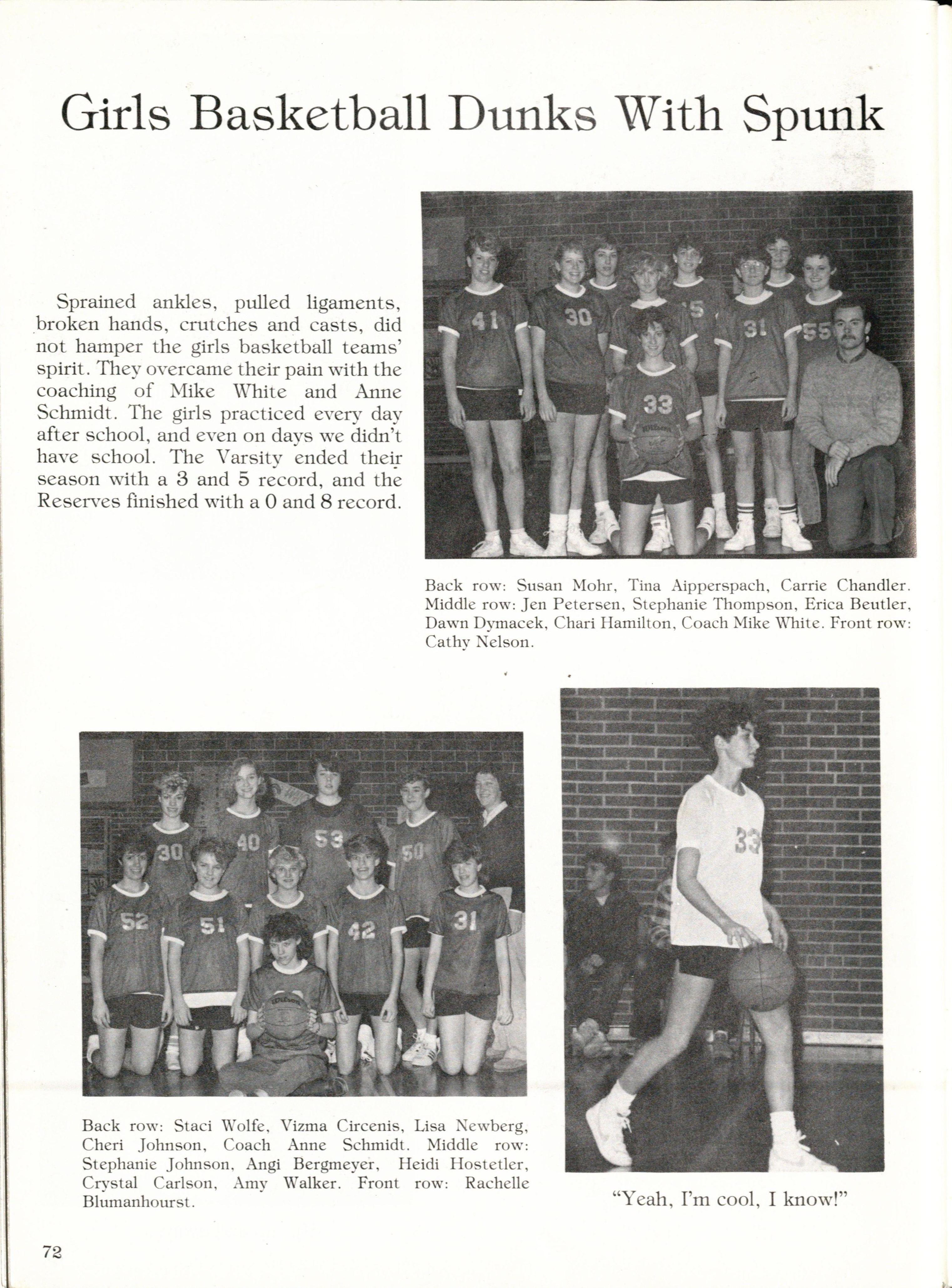 Sprain ed ankles, pulled ligaments, broken hands , crutches and casts, did not hampe r the girls basketball teams' spirit. They overcame their pain with the coaching of Mike White and Anne Schmidt. The girls practiced every day after school, and even on days we didn't have school. The Varsity ended thei! season with a 3 and 5 record, and the R eserves finished with a O and 8 record.