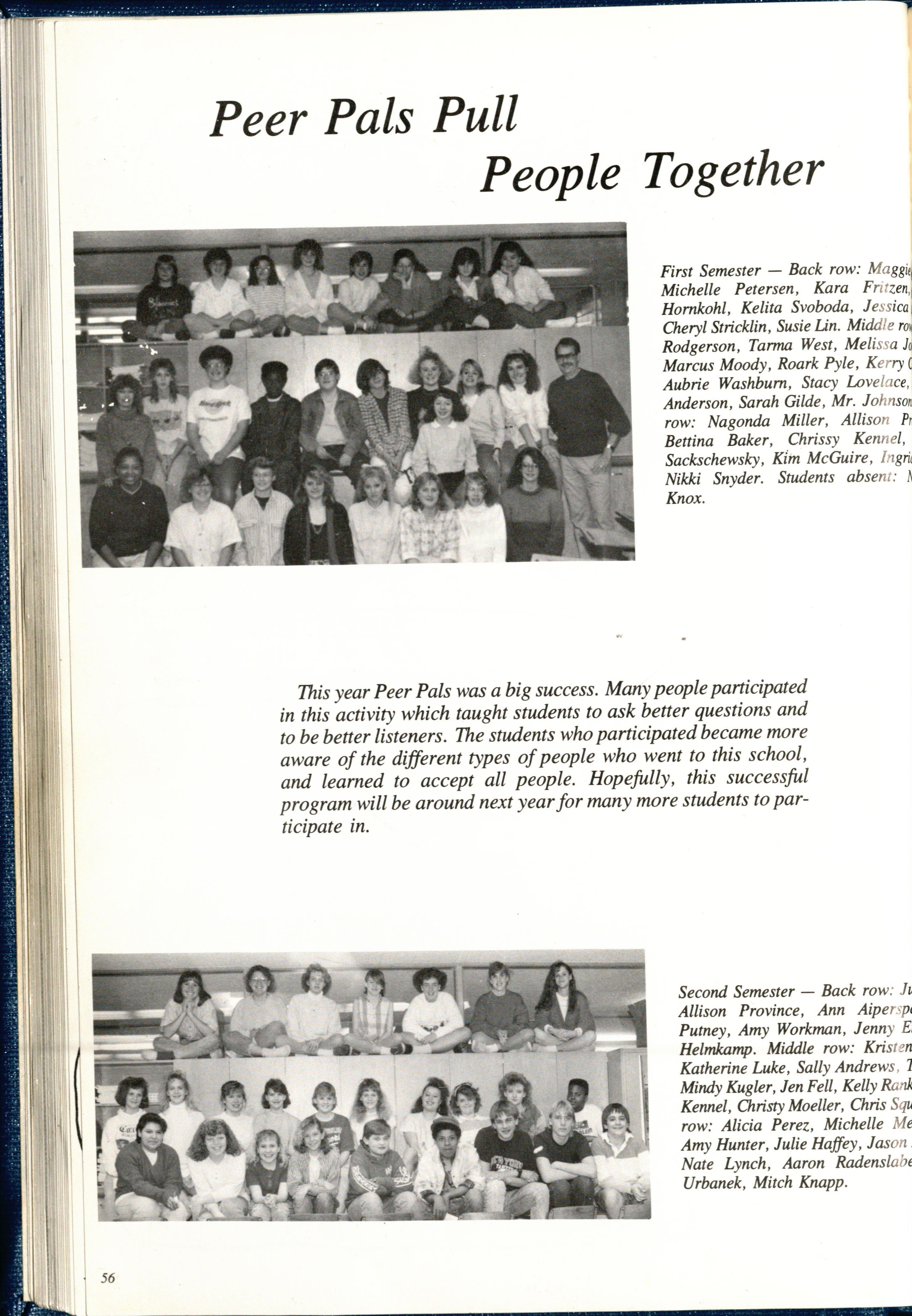 This year Peer Pals was a big success. Many people participated in this activity which taught students to ask better questions and to be better listeners. The students who participated became more aware of the different types of people who went to this school, and learned to accept all people. Hopefully, this successful program will be around next year for many more students to participate in.
