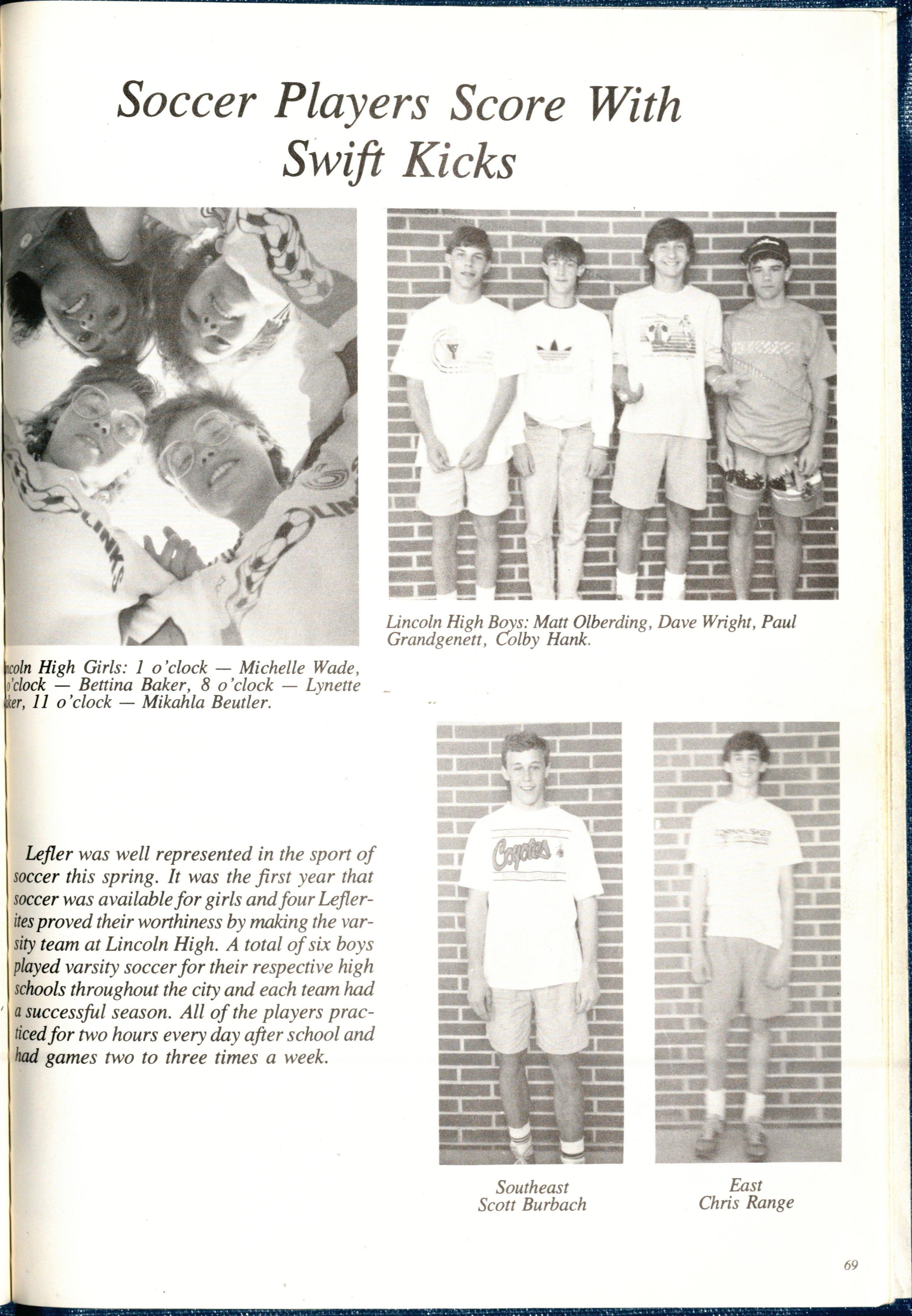 Lefler was well represented in the sport of soccer this spring. It was the first year that soccer was available for girls and four Leflerites pro ved their worthiness by making the varsi ty tea m at Lincoln High. A total of six boys played varsity soccer for the ir respective high schools throughout the city and each team had ' a succe ssful season. All of th e players practi ced for two hours every day after school and had ga mes two to three time s a week.
