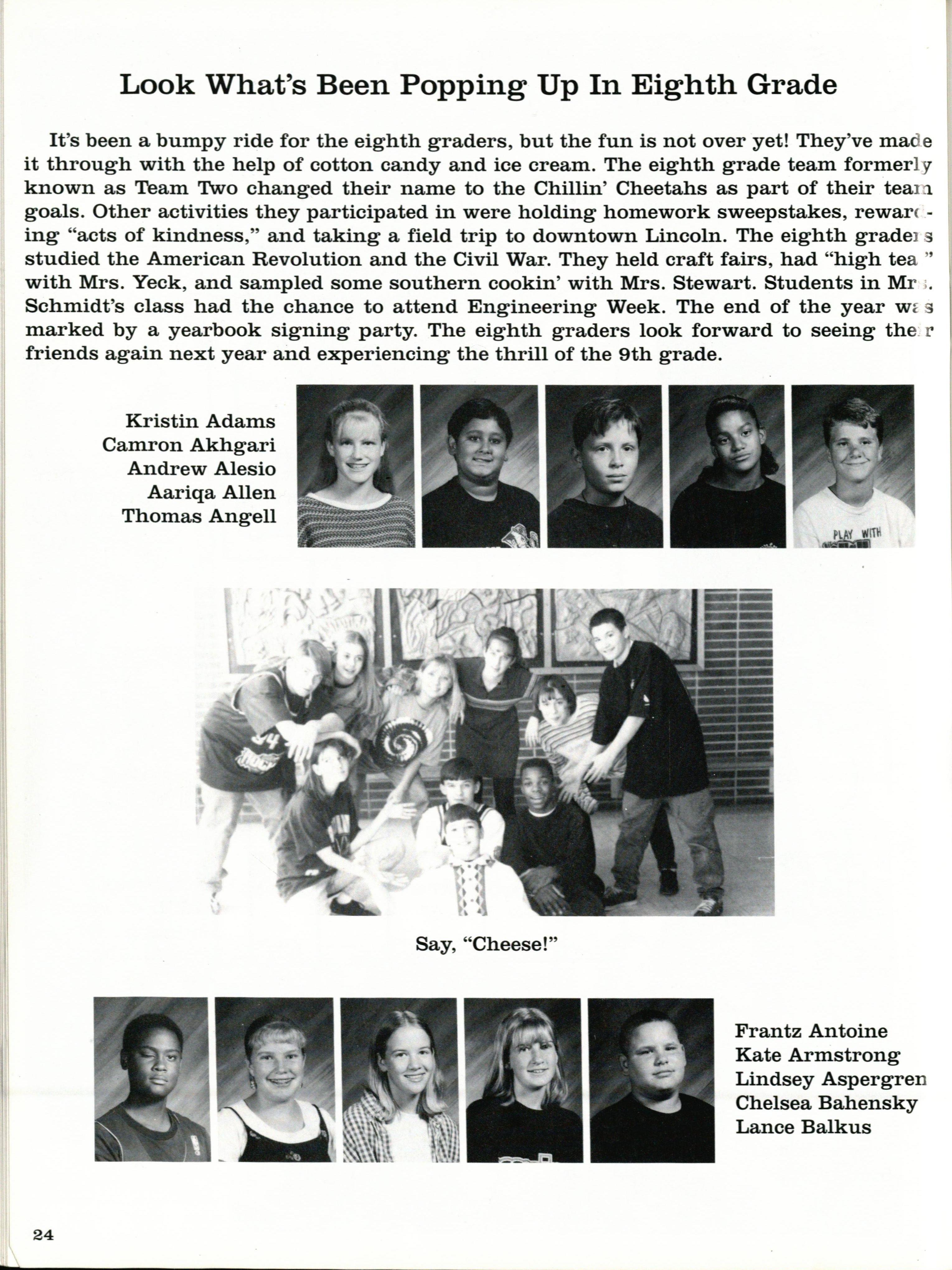 It's been a bumpy ride for the eighth graders, but the fun is not over yet! They've ma e it through with the help of cotton candy and ice cream. The eighth grade team former l known as Team 'Iwo changed their name to the Chillin' Cheetahs as part of their tea _ goals. Other activities they participated in were holding homework sweepstakes, rewar cing "acts of kindness," and taking a field trip to downtown Lincoln. The eighth grade1 studied the American Revolution and the Civil War. They held craft fairs, had "high te a " with Mrs. Yeck, and sampled some southern cookin' with Mrs. Stewart. Students in M r : Schmidt's class had the chance to attend Engineering Week. The end of the year w f marked by a yearbook signing party. The eighth graders look forward to seeing the , friends again next year and experiencing the thrill of the 9th grade.