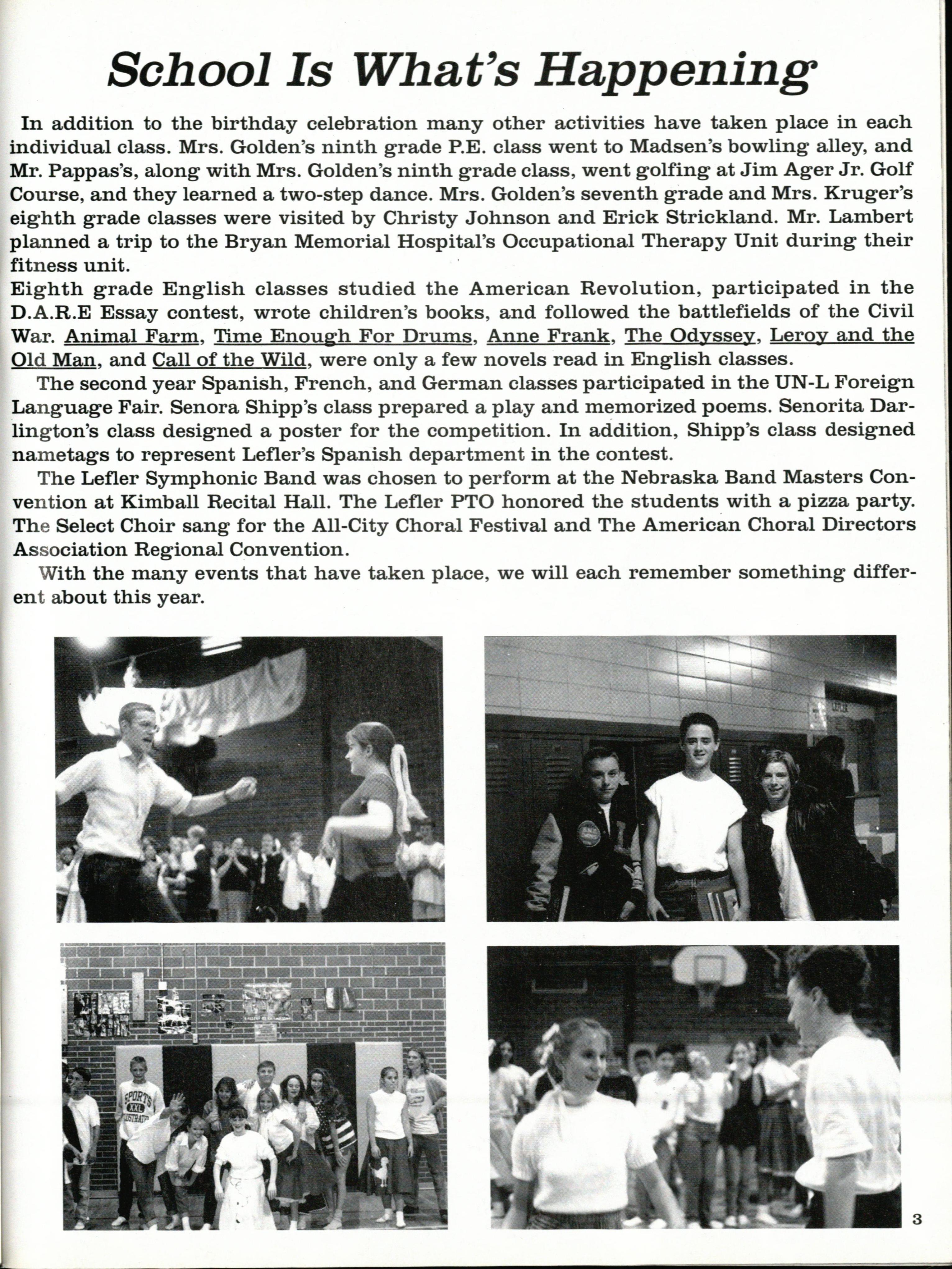 I n addition to the birthday celebration many other activities have taken place in each individual class. Mrs. Golden ' s ninth grade P.E. class went to Madsen ' s bowling alley, and M r. Pappas's, along with Mrs. Golden 's ninth grade class , went golfing at Jim Ager Jr. Golf Co urse, and they learned a two-step dance. Mrs. Golden ' s seventh grade and Mrs . Kruger's ei ghth grade classes were visited by Christy Johnson and Erick Strickland. Mr. Lambert