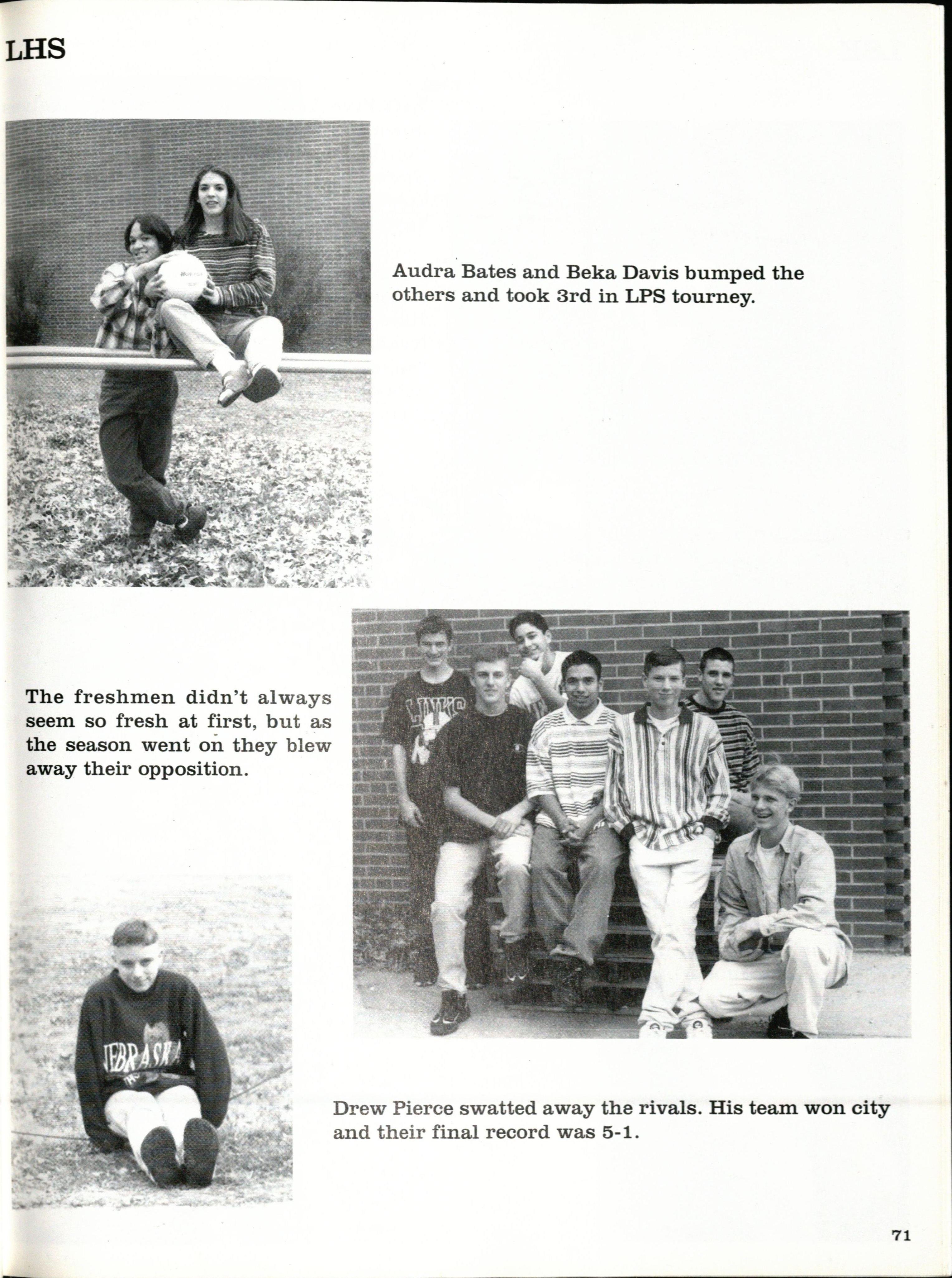 Tricia Heidemann and Breanna Gerlach played on the Lincoln High Tennis team. Heidemann was the only Freshman on J. V. "It was a lot of fun and we had a really good team." Breanna aided LHS by "serving" on the Reserves. From Left to Right: Breanna Gerlach and Tricia Heidemann