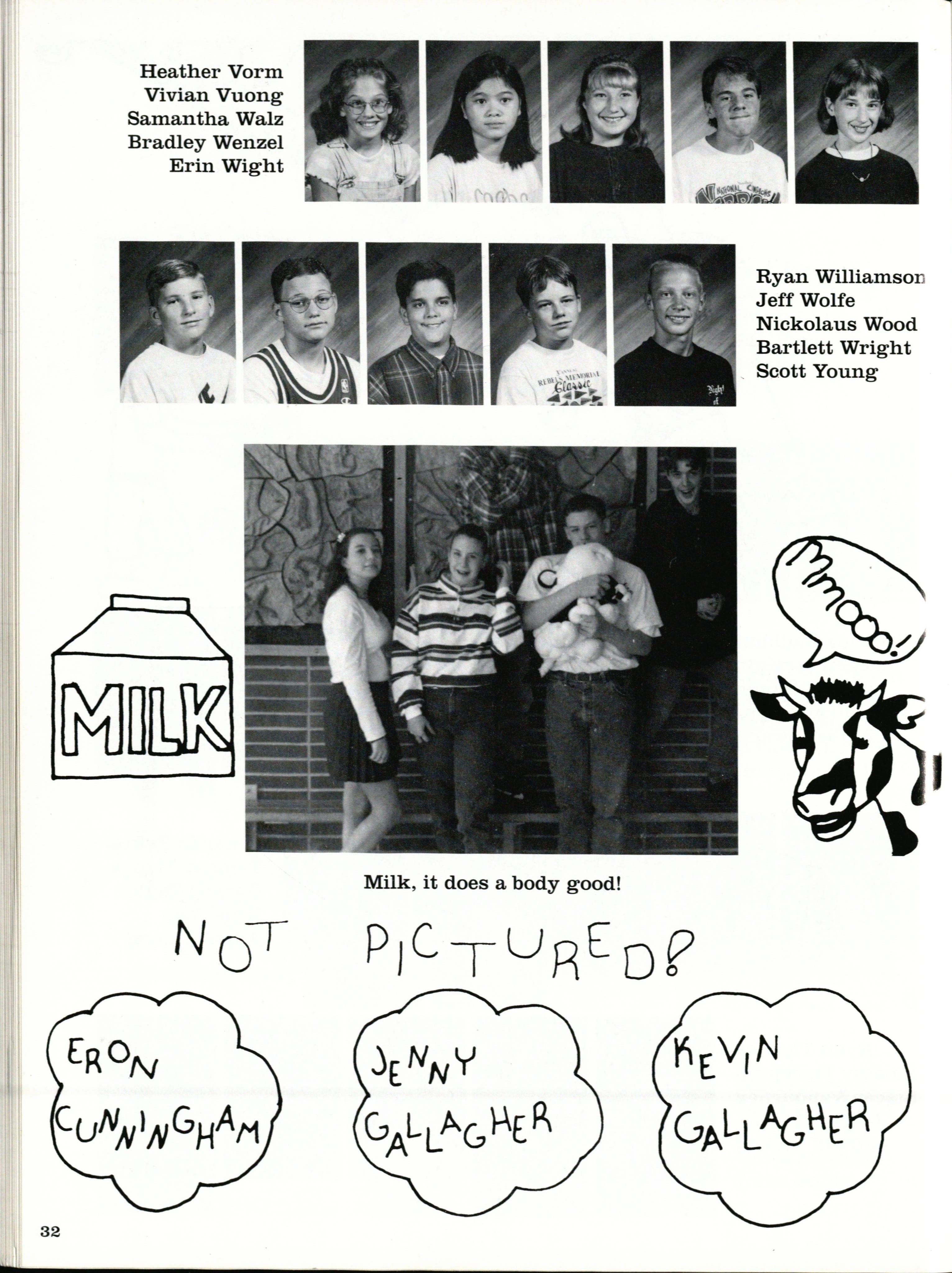 Seventh and Eighth Cross Country (girls): Front Row: Mary Manning-Kechley, Nicole Linke, Andrea Abel, Christine Schomaker, Erin Benham Back Row: Coach Smith, Kristen Adams, Jacinda Welsch, Sarah Herrick, Ivy Statler-Assistant Coach, Coach Dawson