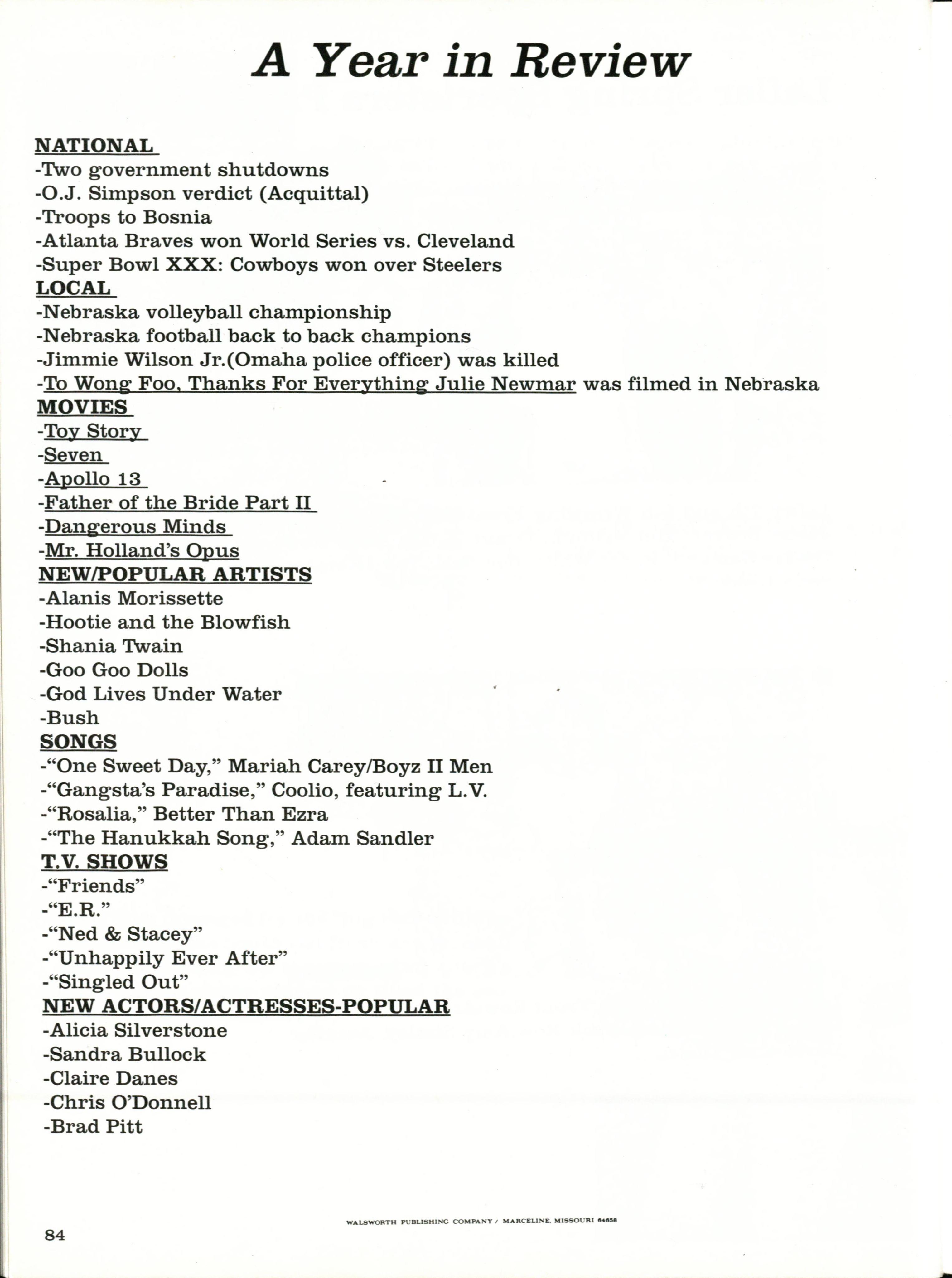 As we reflect back on the school year of 1995-1996 we remember the classes, frie r good and bad days, and the goofy things we did. As memories flash through our mind think of the most memorable events that have occurred this year. _