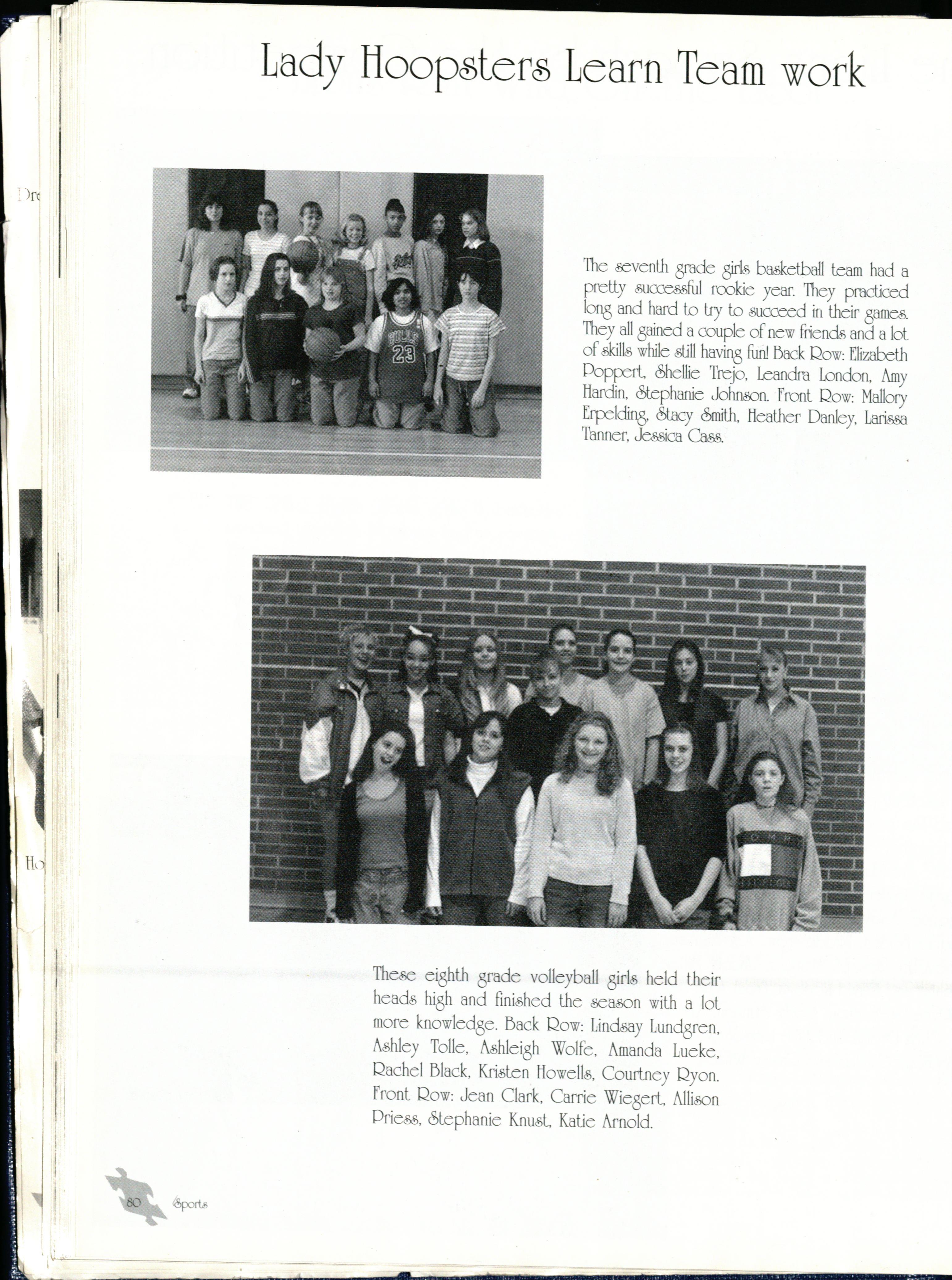 The seventh 8rade &I ba ketball team had a pretty UCX2eS3ful rookie year. They practiced lof18 and hard to try to succeed in their 8~They all 8ained a couple of new friends and a lot of kills while still havif18 fun] Back Qow: Eliwbeth Poppert 6hellie Trejo, Leandra London, Amy ttardin, 61:ephanie John n. front Qow: Mallory Erpeldrn& &.acy 6mith, Heather Danley, Larissa Tonner Jessica Ca