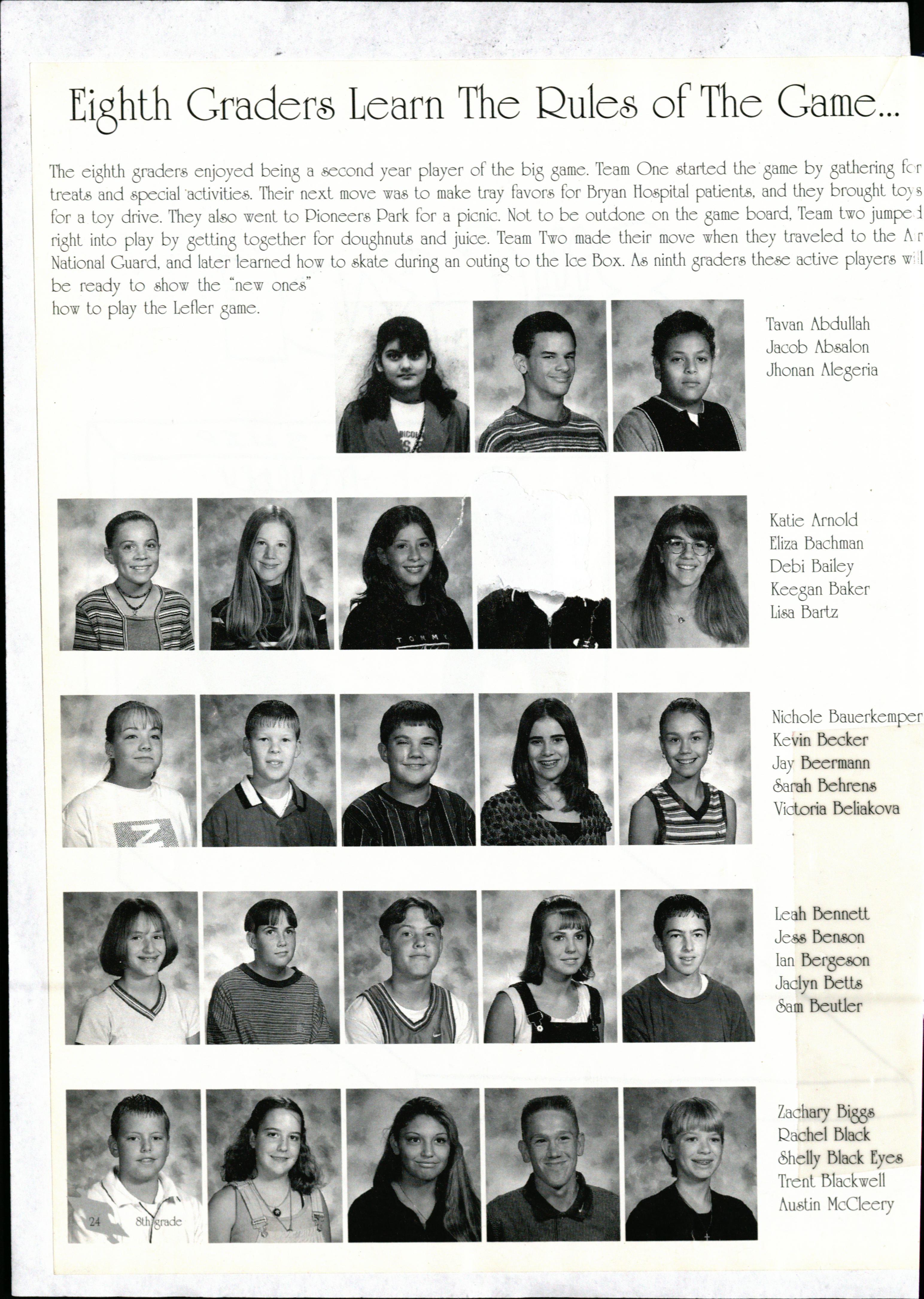 The ei8hlh 8rader enjoyed bei08 a second year player of the bi8 8ame. Team One tarted the 8ame by 8atheri08 fc r lreals and pecial ·aclivilies. Their nexl move wa lo make lray favor for Bryan ttospilal palienls, and lhey brolJ8hl lo) 3 for a loy drive. They also wenl lo Pionee1: Park for a picnic . ol lo be ouldone on the 8ame board, Team lwo jumpe ::i ri8hl inlo play by 8elli08 lo8ether for dolJ8hnuls and juice. Team Two made lheir move when they lraveled lo lhe A r alionaJ Guard , and laler learned how lo skale duri08 an ouli08 lo the Ice Box. As ninth 8raders lhese active players w;· l