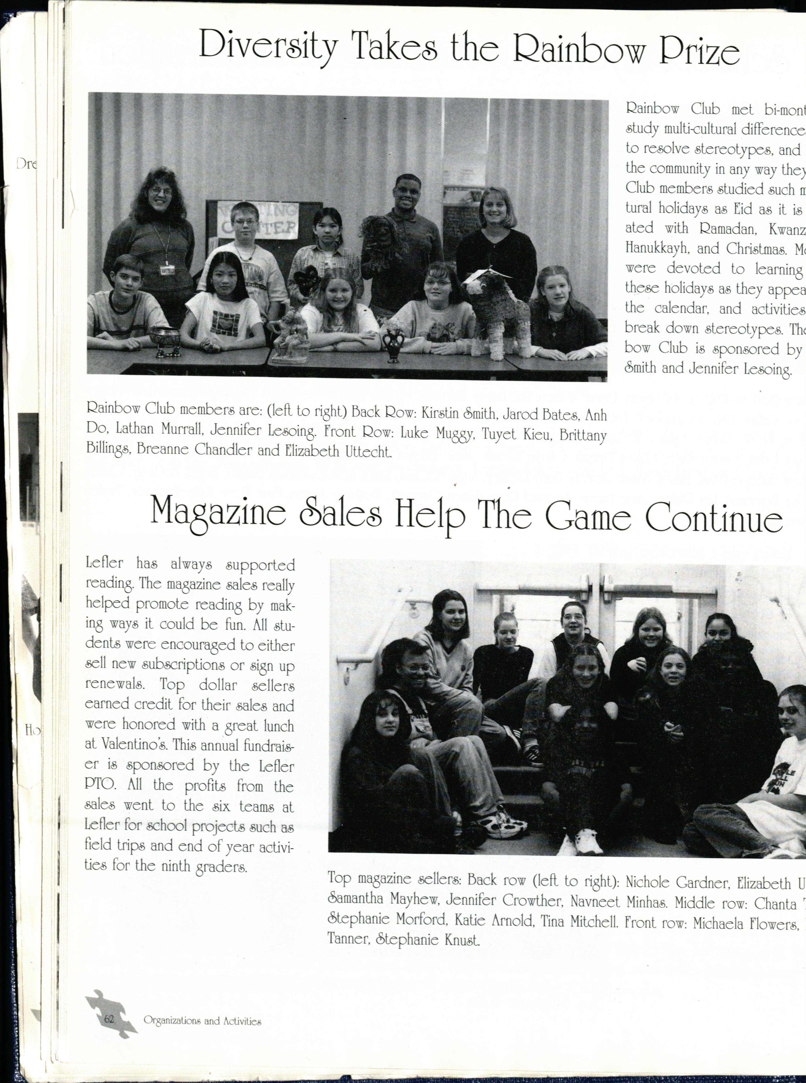 he Lefler MulliCultural Collllllittee sponsored sevral events durif18 the year to celebrate a variety ,f cultures. Arlifacts, book , research projects, ,ookmarks, and music told the alive American tory in ovember. Black tlistory Month was cele>rated in a March assembly featuri£18 the "Voices >f D esliny" choir from Lincoln lii8h &hool. Qev )onald Coleman addressed the 8roup and essay ui nners, A hley Hopkins and Me8an Plith, present~d their wrilif18S. Other honorees reco8nized vere Quth Kohtz, Carly Franson, Chasity tlildreth, Jy 8uyen, tliruth ttaile, and Jennifer Crowther. lbe Asian American and Hispanic cultures were -eco8nized in the spri£18 with colorful costumes 1.rtifacts, and special posters.