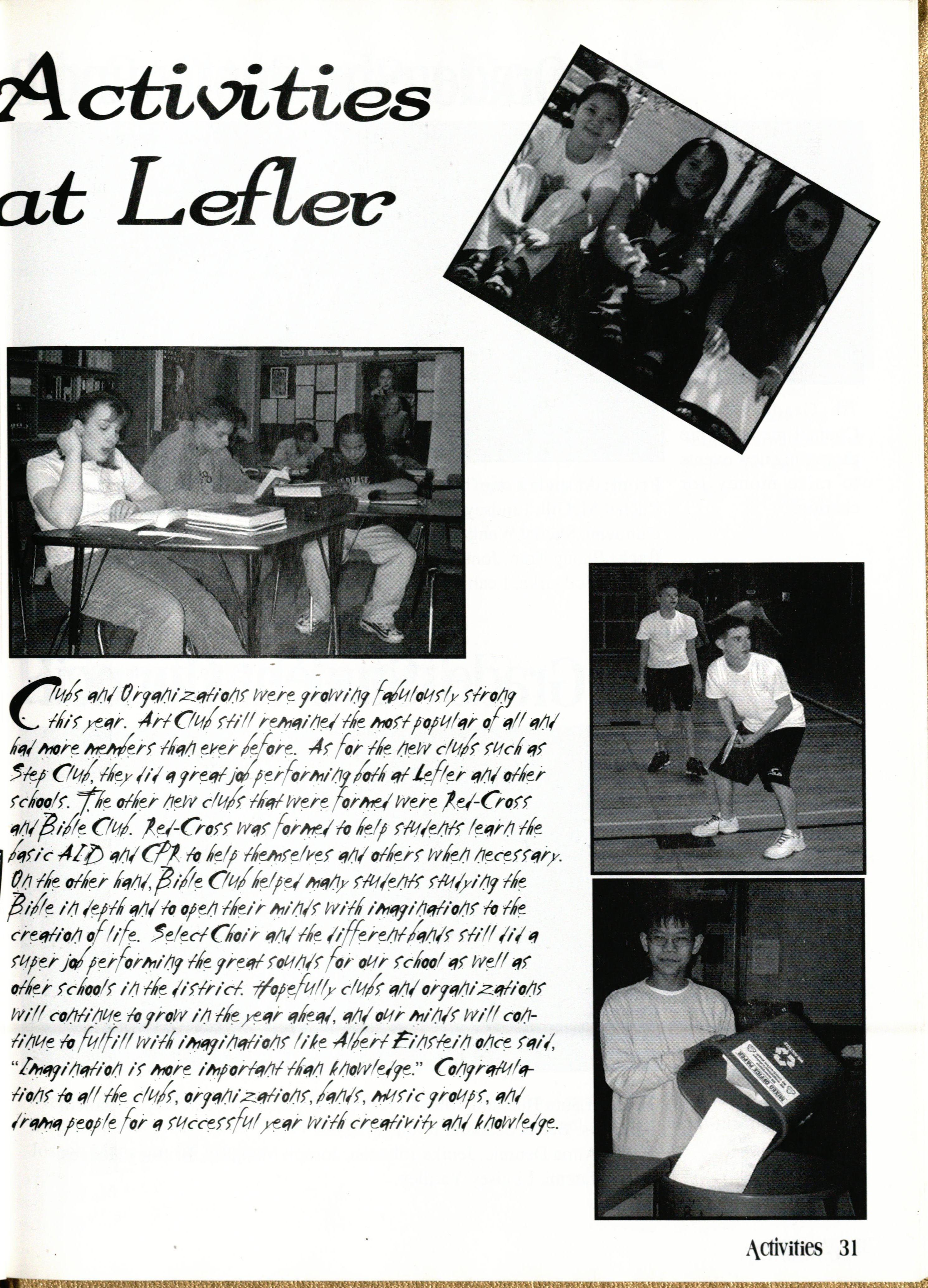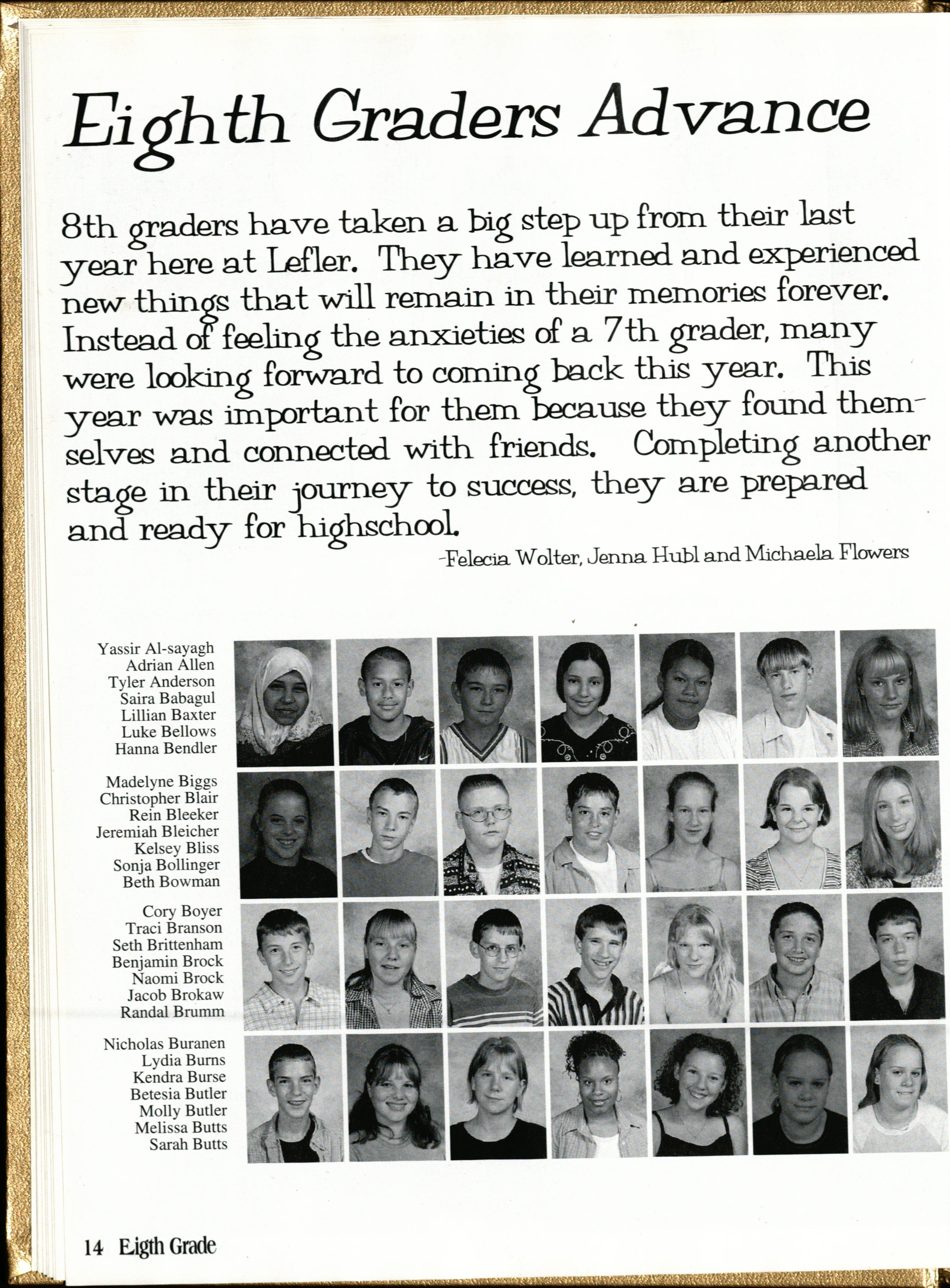 ever Before have we been faced with the problems, and challenges that our high school, and lives have put before us. We all know that some day we may want to look back, but we also know in our hearts and minds that we must look forward to the great times, and the great people that we have ahead of us! We may face hard times among other things, but we all know one thing and that is that we will get through them! As we all know some of us will move, some will go to different schools therefore, we will get spilt up and then we will be able to look back on our last days at Lefler. These people that we have met here will be apart of our past, future, and beyond!!
