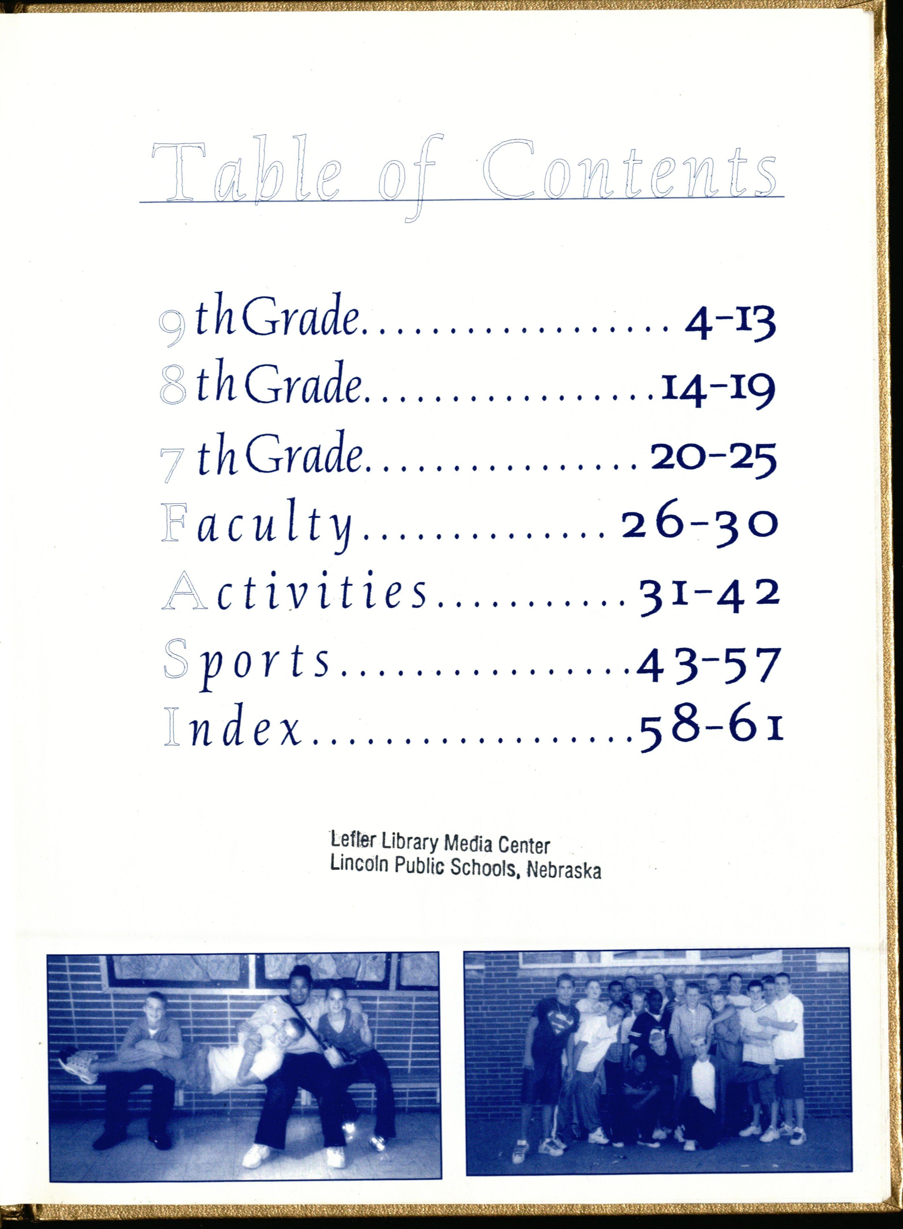 7 th Grade . ............... 20-25 F acult-y .............. 26-:-30 A . . . Ct 1 V 1 t 1 e S ........... 31-4 2 S p o r t s ................ 4 3-5 7 I ndex .................. 58-61 'Lefter library Media Center . Lincoln Public Schools. Nebraska