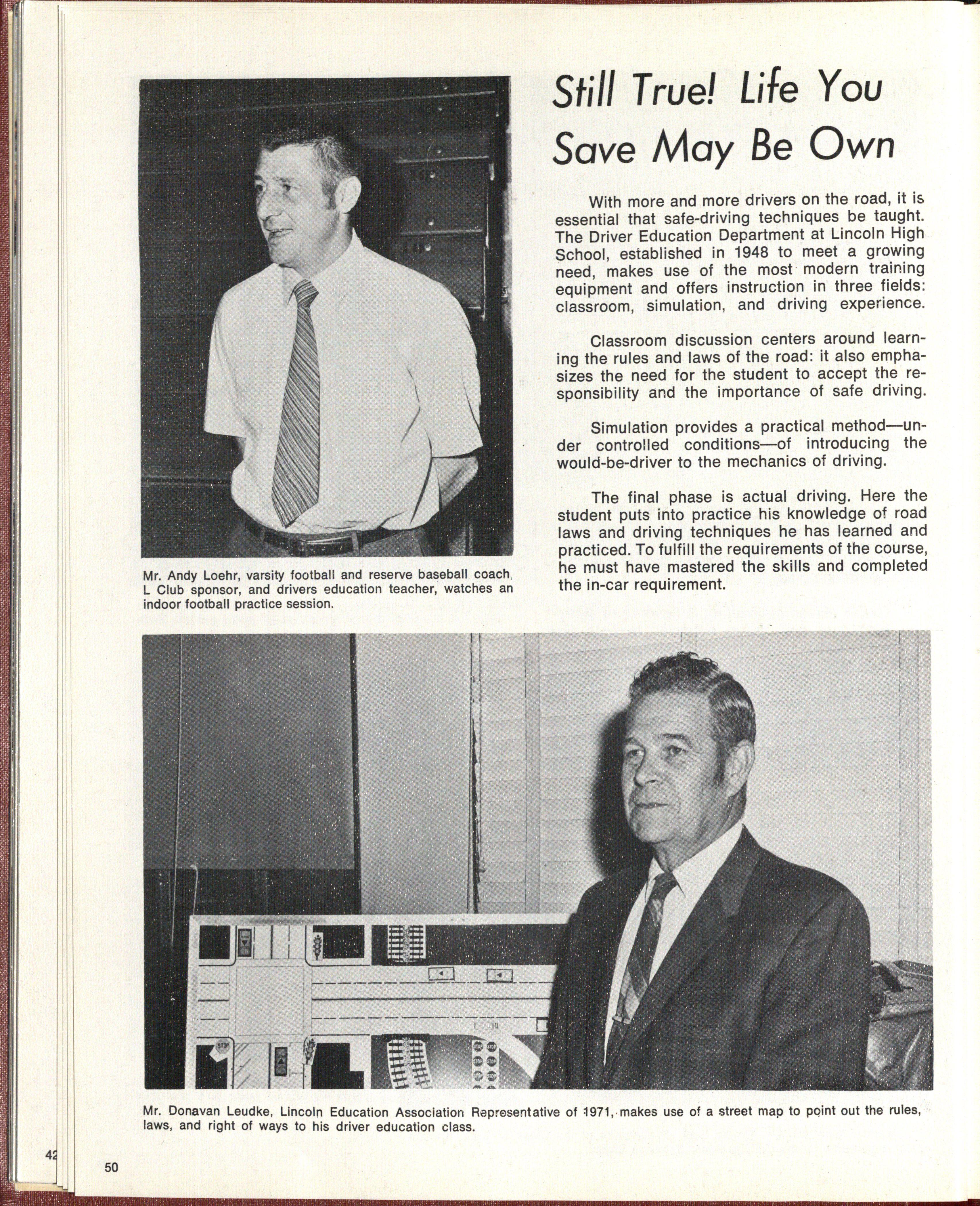Rather than dwelling on past events this afternoon wou Id prefer to talk about the attributes and characteristics of Lincoln High School which impart to it a truly unique character Undoubtedly the single factor that in the past and still today sets Lincoln High apart from other secondary schools is and has been the unusual capabilities and devotion of the fine men and women who have constituted its faculty and administration. They early sensed and have perpetuated the spirit and desire of that little prairie community that decided one hundred years ago that its children should not want for a good education. From the very beginning, these skilled teachers and administrators have fostered a tradition of excellence that has challenged successive generations of students. Despite too often meager pay and inadequate facilities, they have maintained the high teaching standards that make learning a demanding, enriching, and fulfilling experience. Originally the school's curriculum was composed primarily of the classical subjects; but with changing times and our evolving technological society, the curriculum was ex• panded to include instruction in the vocational trades and industrial arts. Particularly today, our highly technical economy needs the skills of those who have been trained in the vocational specialties. The contribution of Lincoln High School to satisfying this demand is as important as is its function in preparing a part of its student body for college or university. Quite as productive as the formal instruction received in the classroom has been Lincoln High School's well-developed program of extracurricular activities. Beginning almost with the founding of the school and flowering as the institution grew, these extracurricular activities have helped mature Lincoln High graduates into well-rounded young people. We think, for instance of the purposes of the Student Council · as outlined in the preamble of its constitution which states that "The purpose of the Student Council is to bring the interest of the students before the faculty, to provide opportunity for student cooperation, to promote a sentiment for law and order and the general welfare of the school." Through such activities as the Council, the student at Lincoln High School early finds an outlet for creative social responsibility and gains an appreciation that accomplishment comes best through organization governed by !aw.