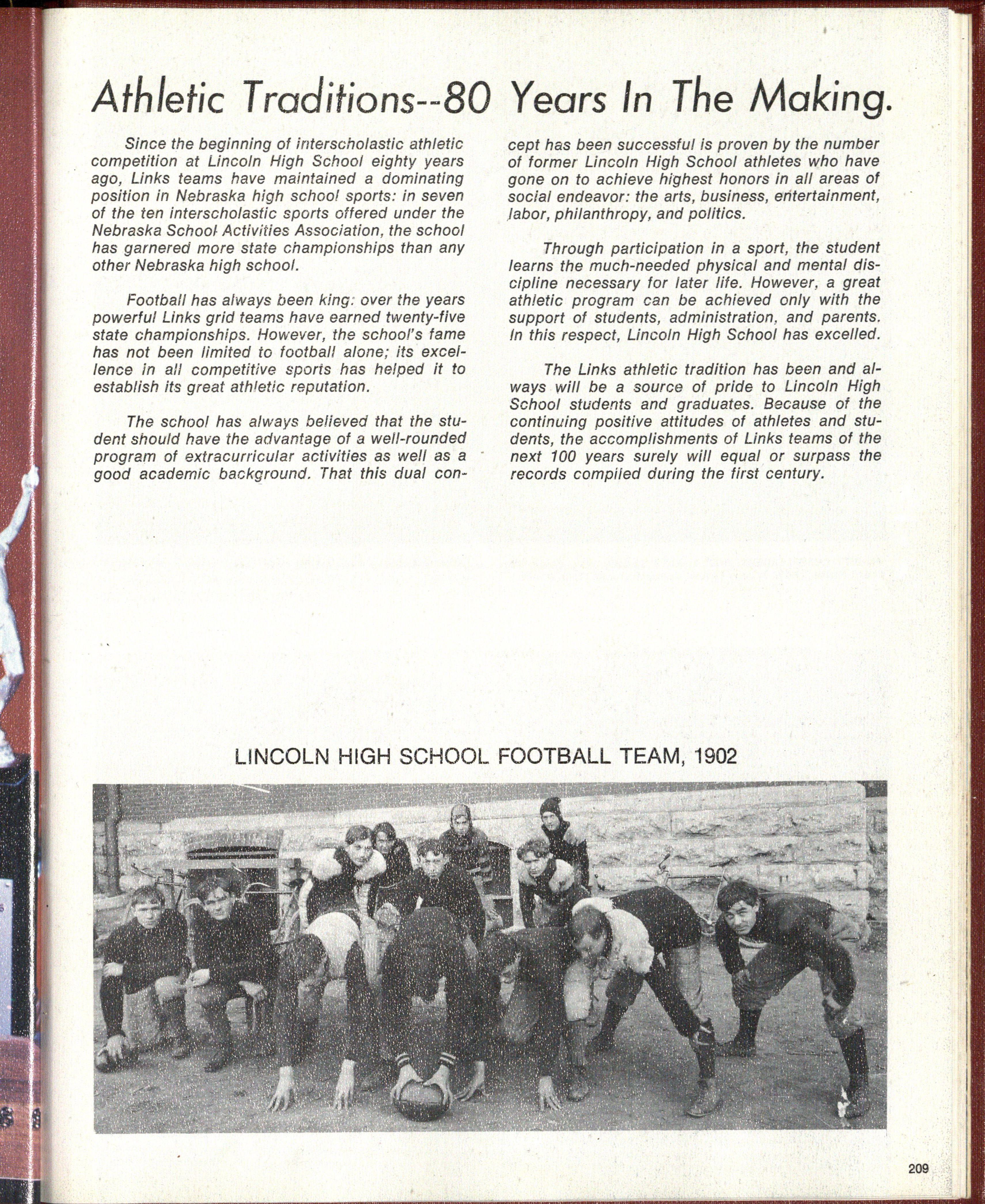 Sports have played a large part in the development and growth of spirit, pride, and unity in Lincoln High School in the last 100 years. Recorded sports history began in 1891 with the first football team which was formed by a no-coach, sandlot group of sports-minded boys.