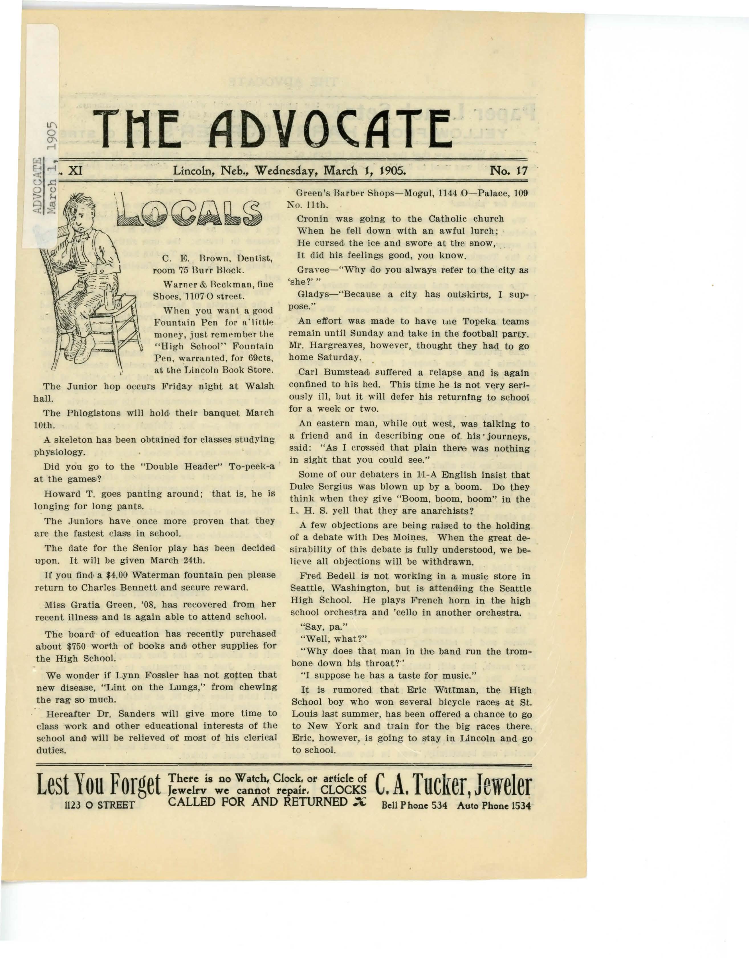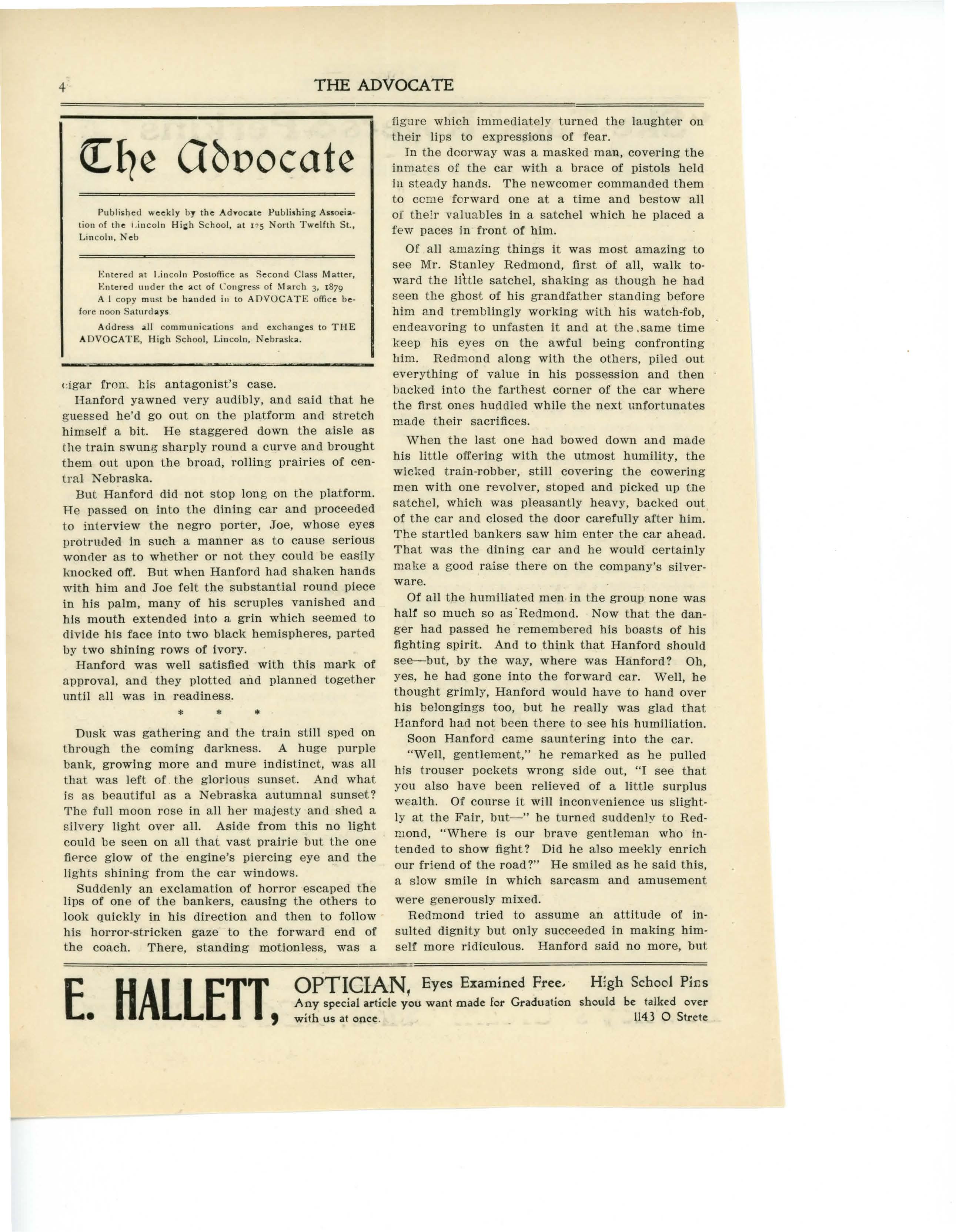 WITH the present issue, begins the Eleventh Volume of THE ADVOCATE and is with pleasure, marred somewhat by the responsibility we feel, that we take up our new duties as editor. It shall be our earnest endeavor to give our readers a bright, newsy high school magazine, and in doing this we need the hearty co-operation of the entire student body. At least three-fourths of the students should subscribe to THE ADVOCATE. THE ADvocATE is not published for three or four hundred students, but is published for every member of the Matter for publication will be gratefully received by the editor. It will be our policy not to increase or decrease the size of the paper, but to improve the quality.