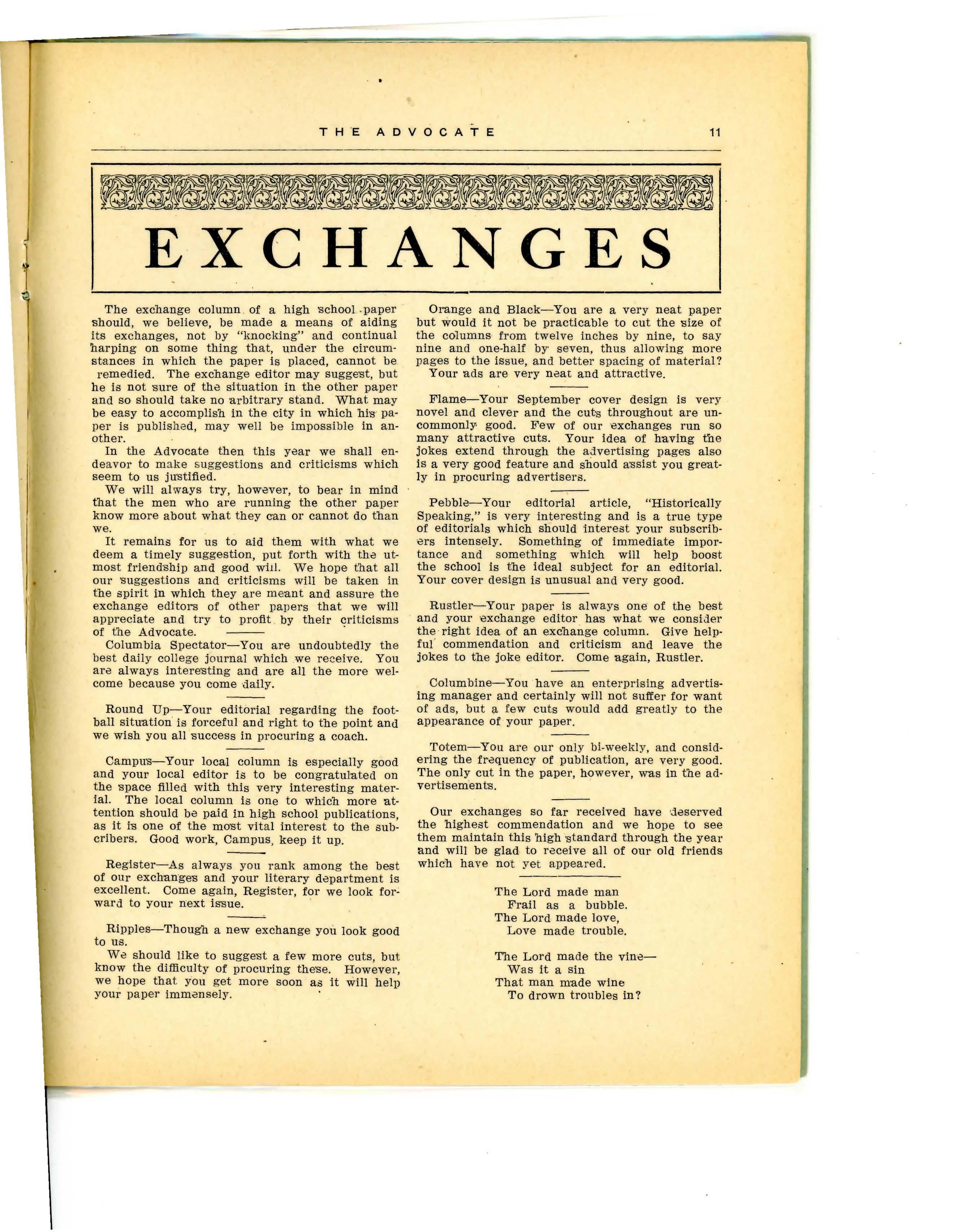 In this last issue the local editor is tempted to mention a few people in rather a personal way. Feeling that since this is the last Issue of the illustrious purveyor of news and other things, he deem e d it safe to do what he has not ventured to do before , namely, to break :1. way, from the mere chronicling of events, real or imaginary, and to indulge in personalities . to some extent. He feels the most intense gratitude to Mr . Brannon who has so considerately stepped into the limelight before every issue furnishing material for roasts. He feels equally grateful , if not more so, to all the rest of the good brothers, and others, who have furnished bim, by their actions, mat er ial with which to fill s·pace. Thank you, gentlemen. and may you be as kind to the next loc a l e dito1· We know "Cut" will.