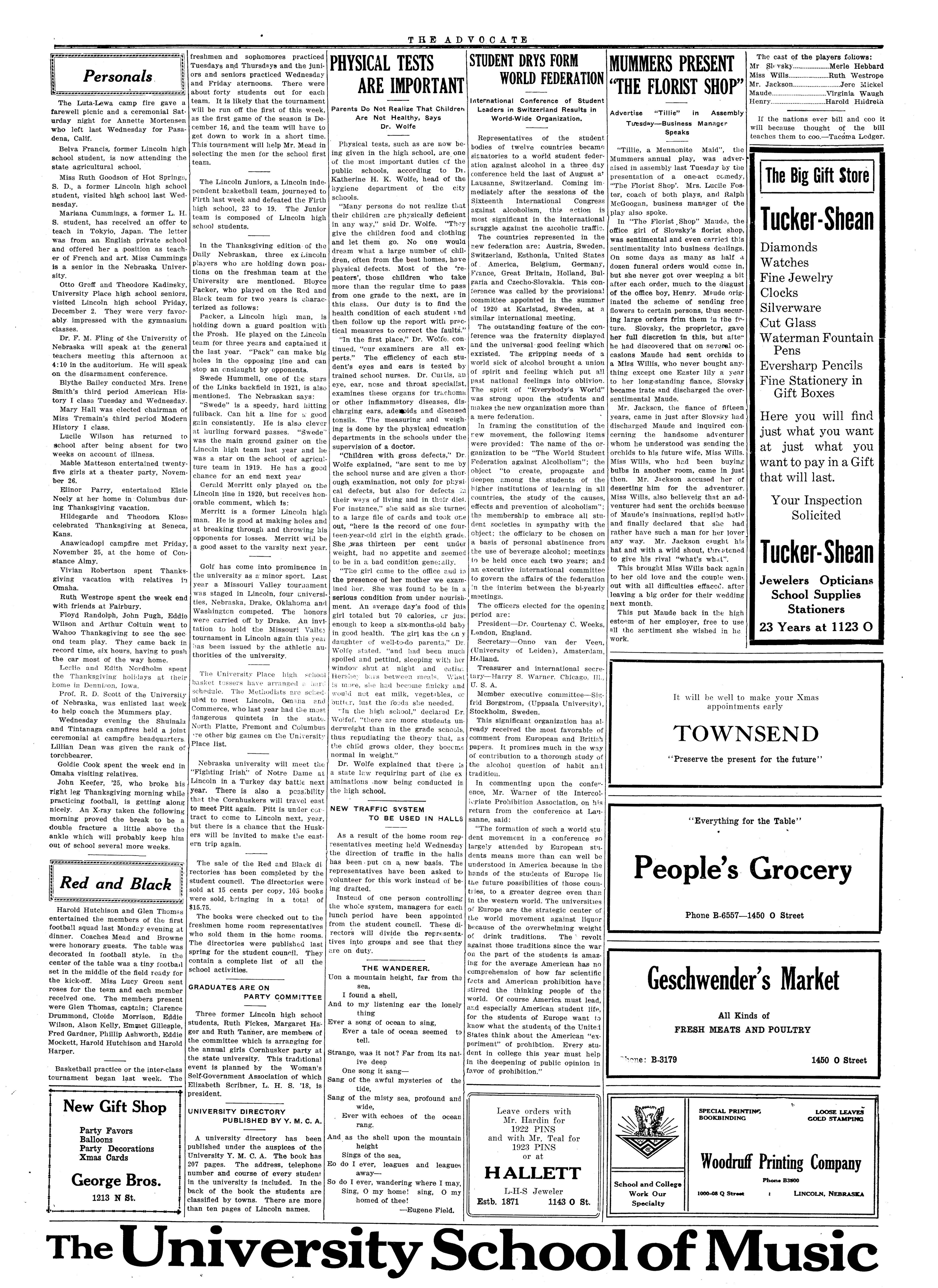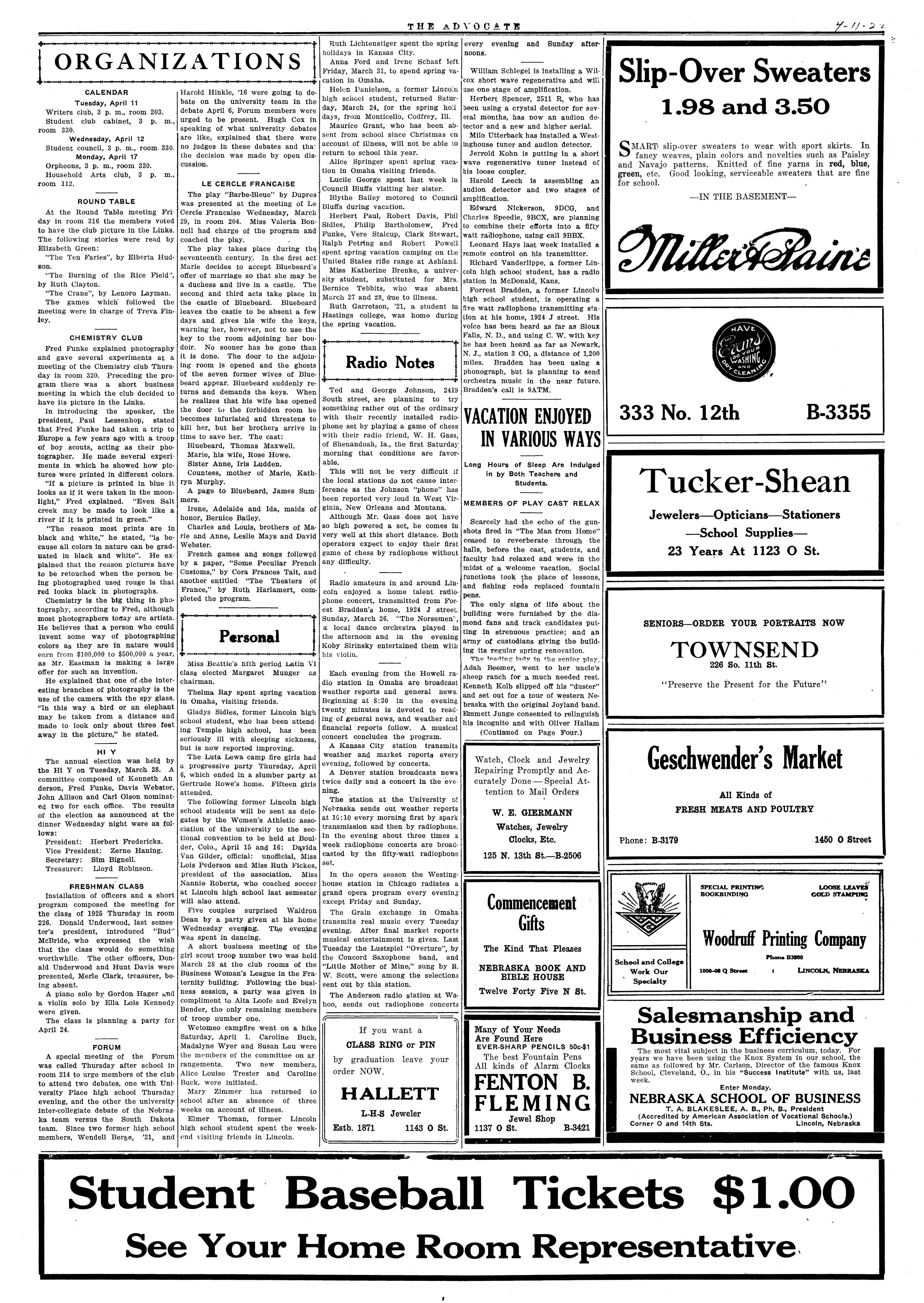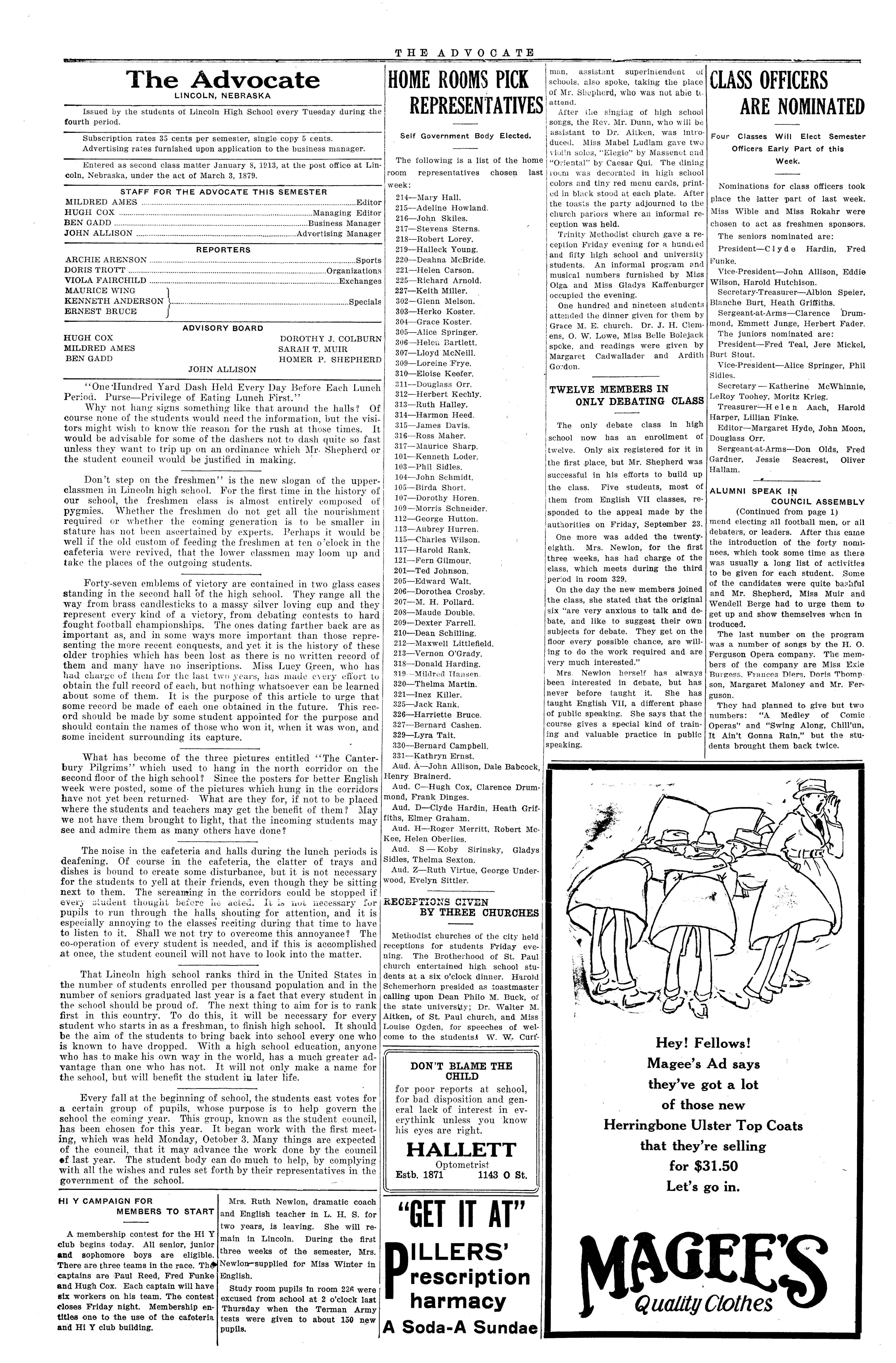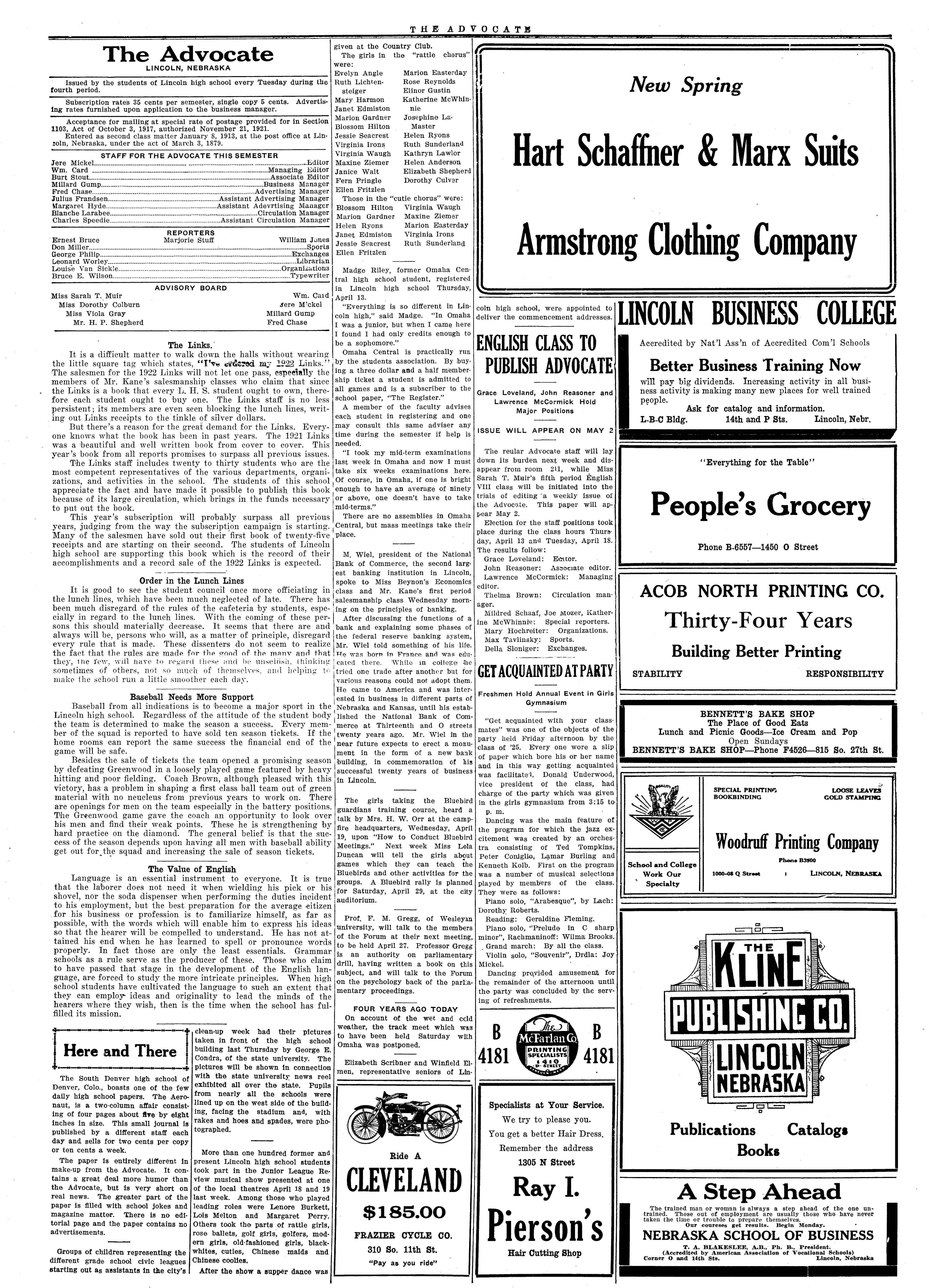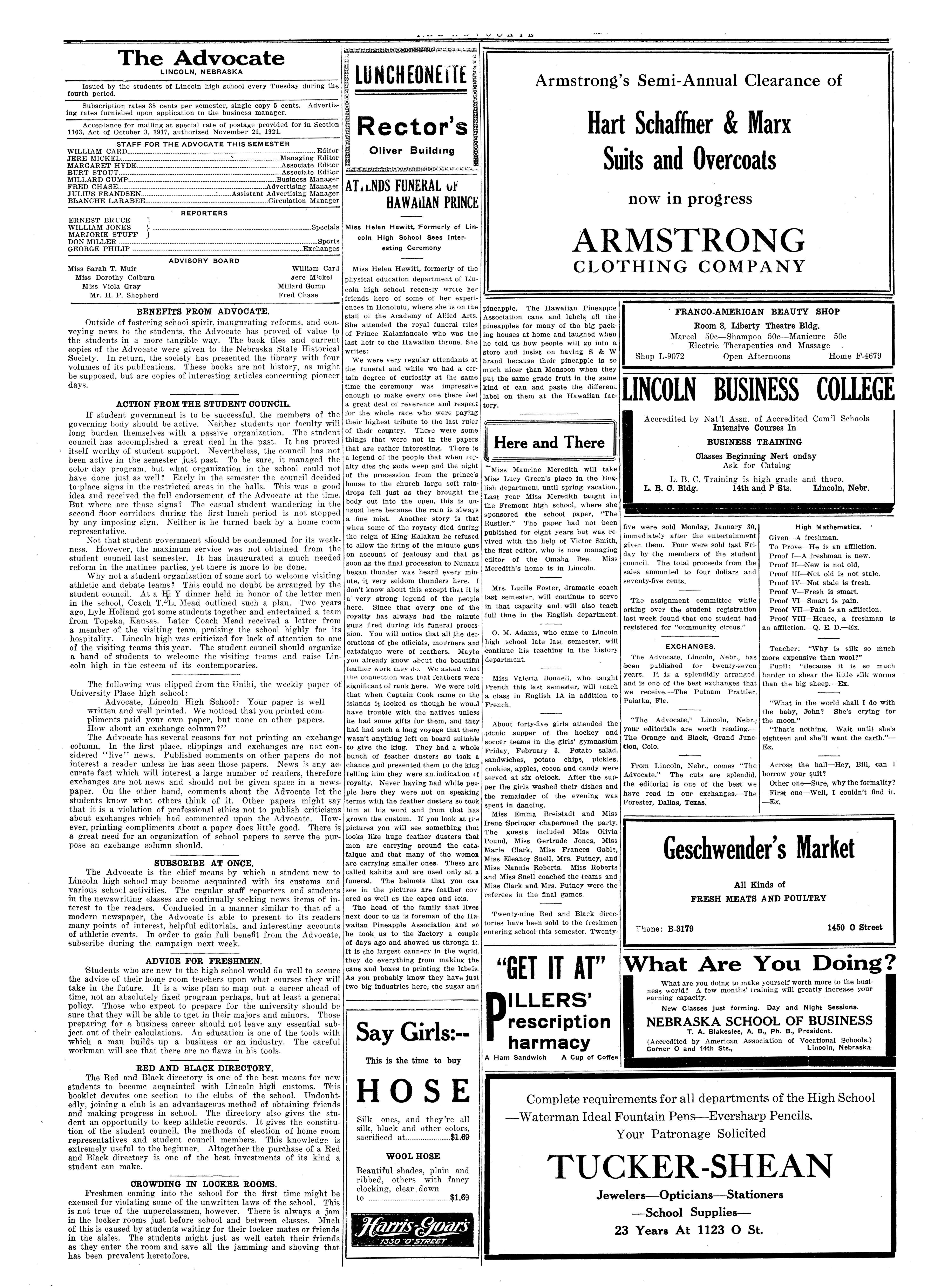 Owin(J' to the fact that Miss Amy Armstr ong r esi g ned this year , living in Fairbury, Neb. i l -and prI·ced unusually low Miss Dor;thy Colburn has bec ome a member of the advis ory boarcl Miss Mary Guthrie has obtained a ; ! of th e Advocate staff. lJnder th e n e w adviser , th e exp eds year's leave o-f absence because of m ! at many changes for the betterment of_ the paper. The assistance of I She will leave Wednesd'.lv ! every Lincoln high s ch ool student is needed to make the paper a for Fort Monroe, Va. , where her I success. It is the students' paper, it does not belong to the sta:ff ?r brother is stationed. She plans to faculty. Therefore, it is the duty of the students to support it_ 1!1 spend the entire winter in the south. the same way in which they support any of the other a ctrv1- Lyl e Hosford is doing social weltie s Every member of the student body should subscribe for the 1 fare work at Wichita, Kas. It is only means by whi ch they may know all of th e I Miss Alice Humpe married J. K. news m Lmcoln lugh school.