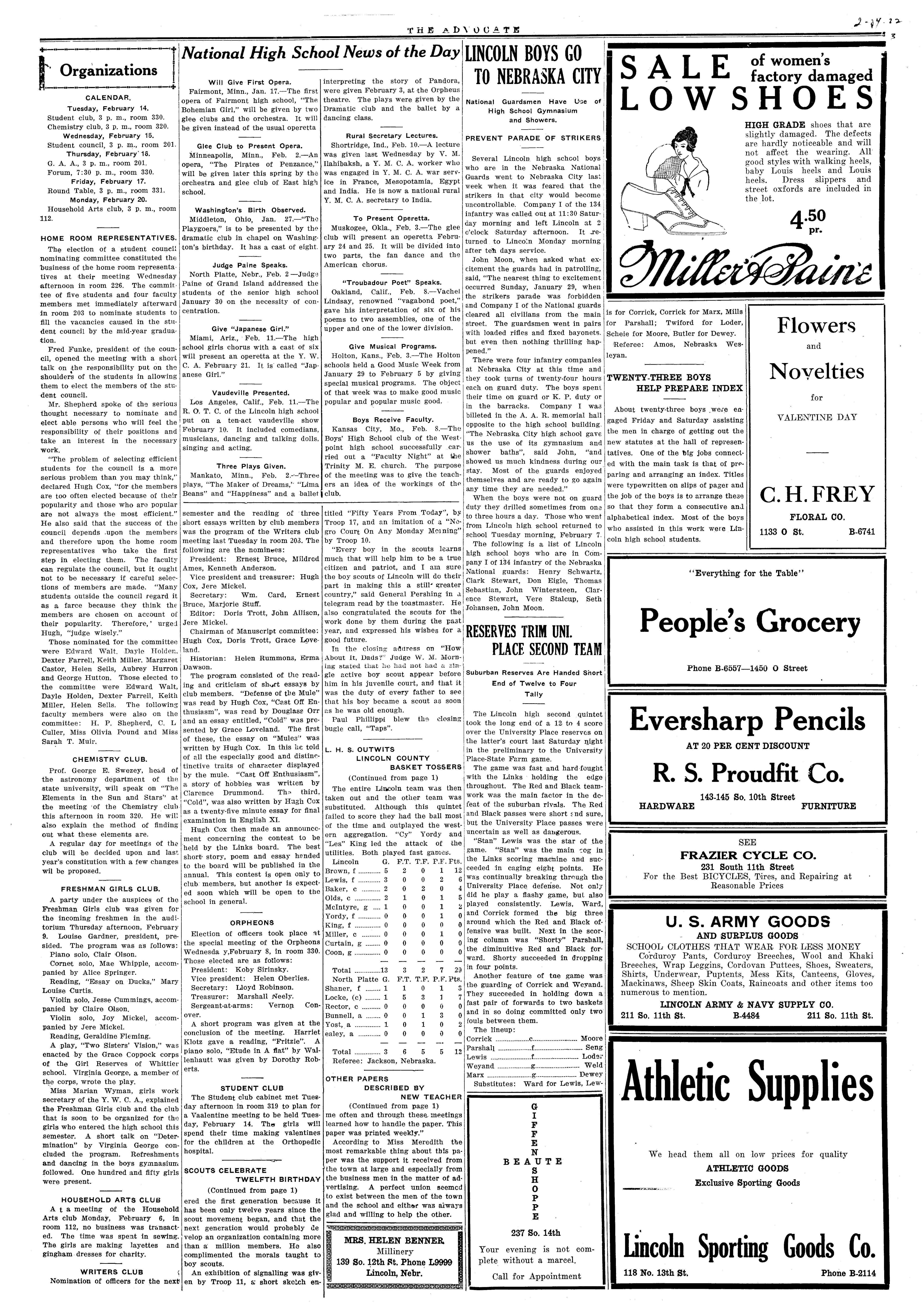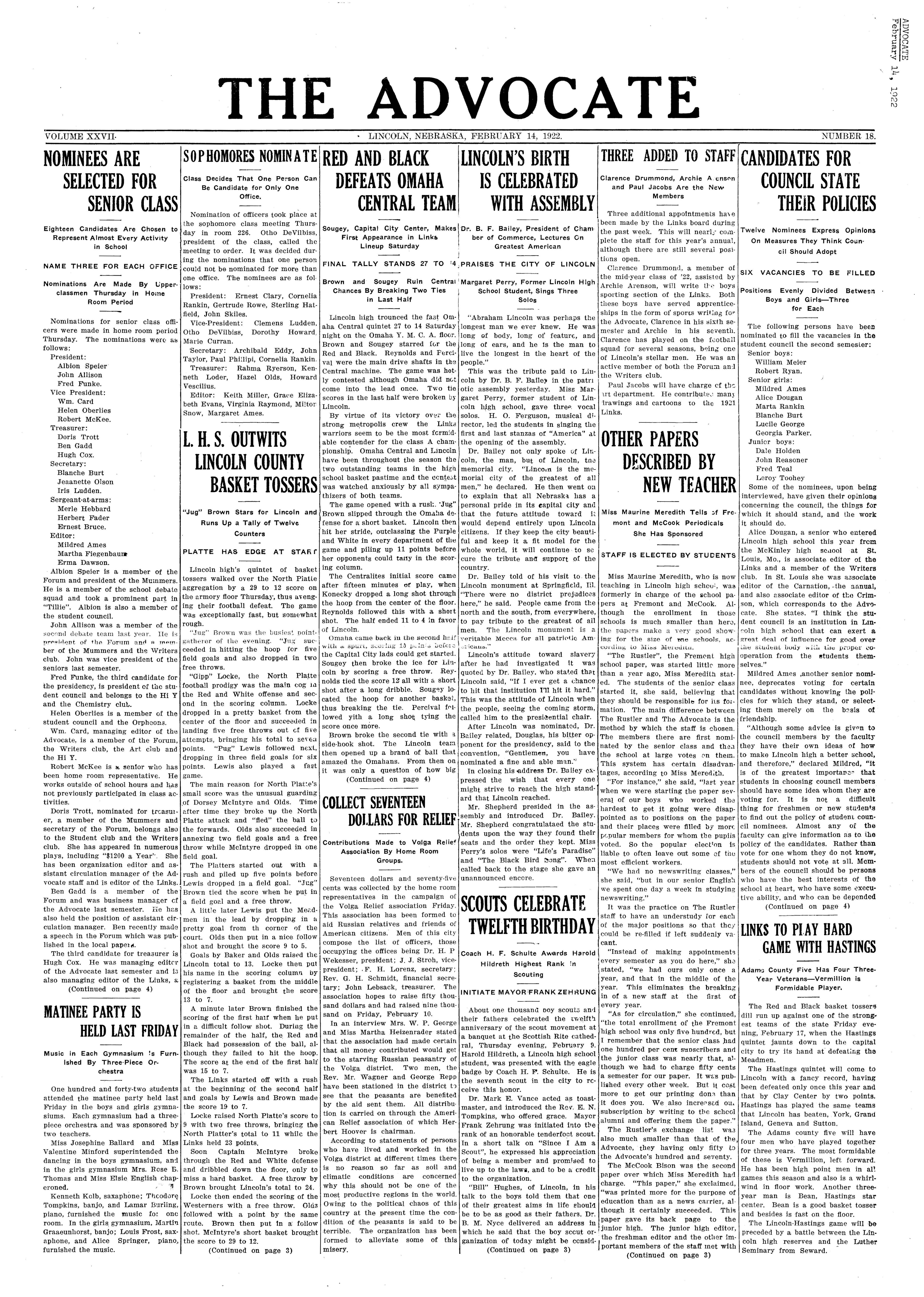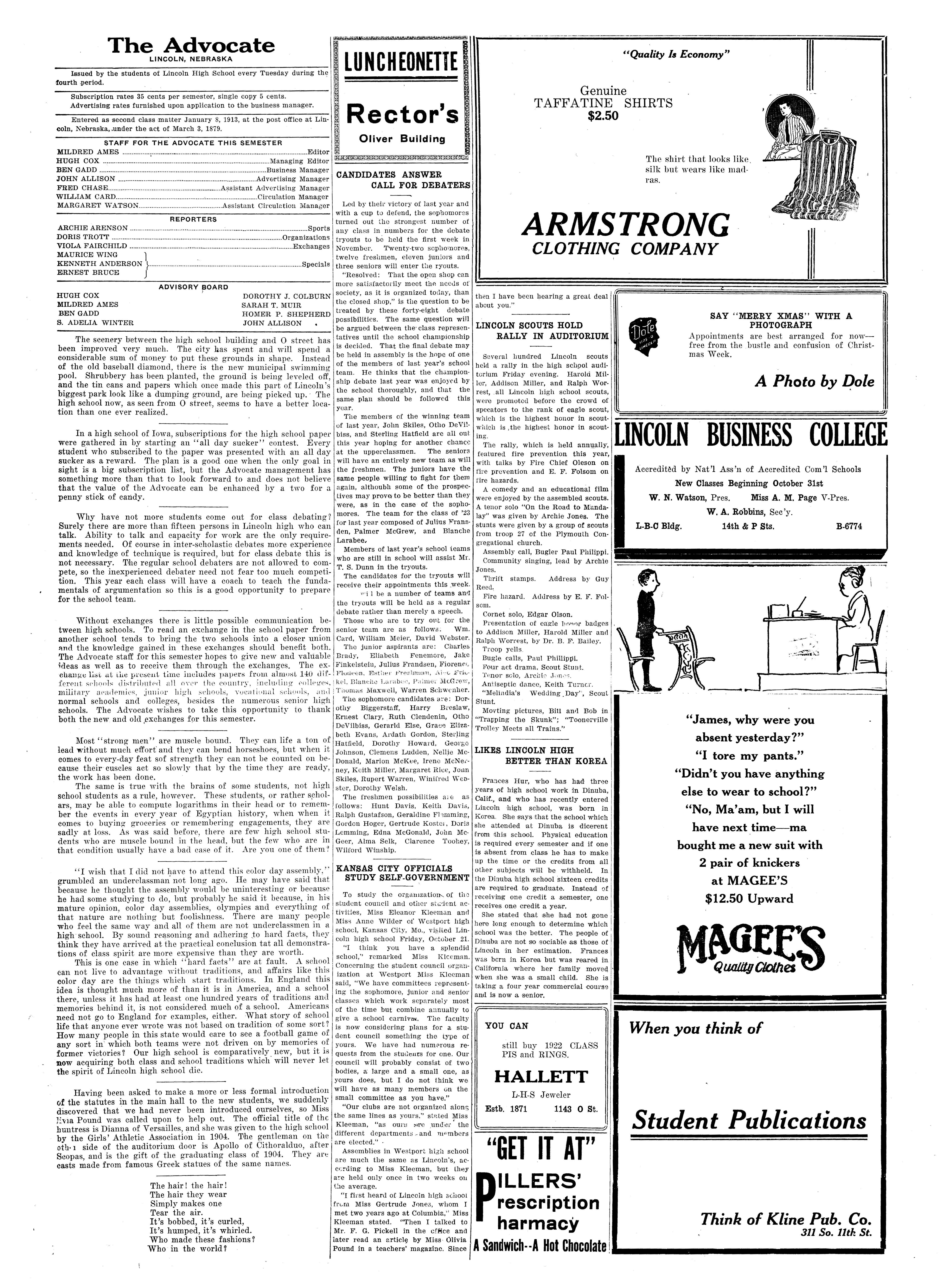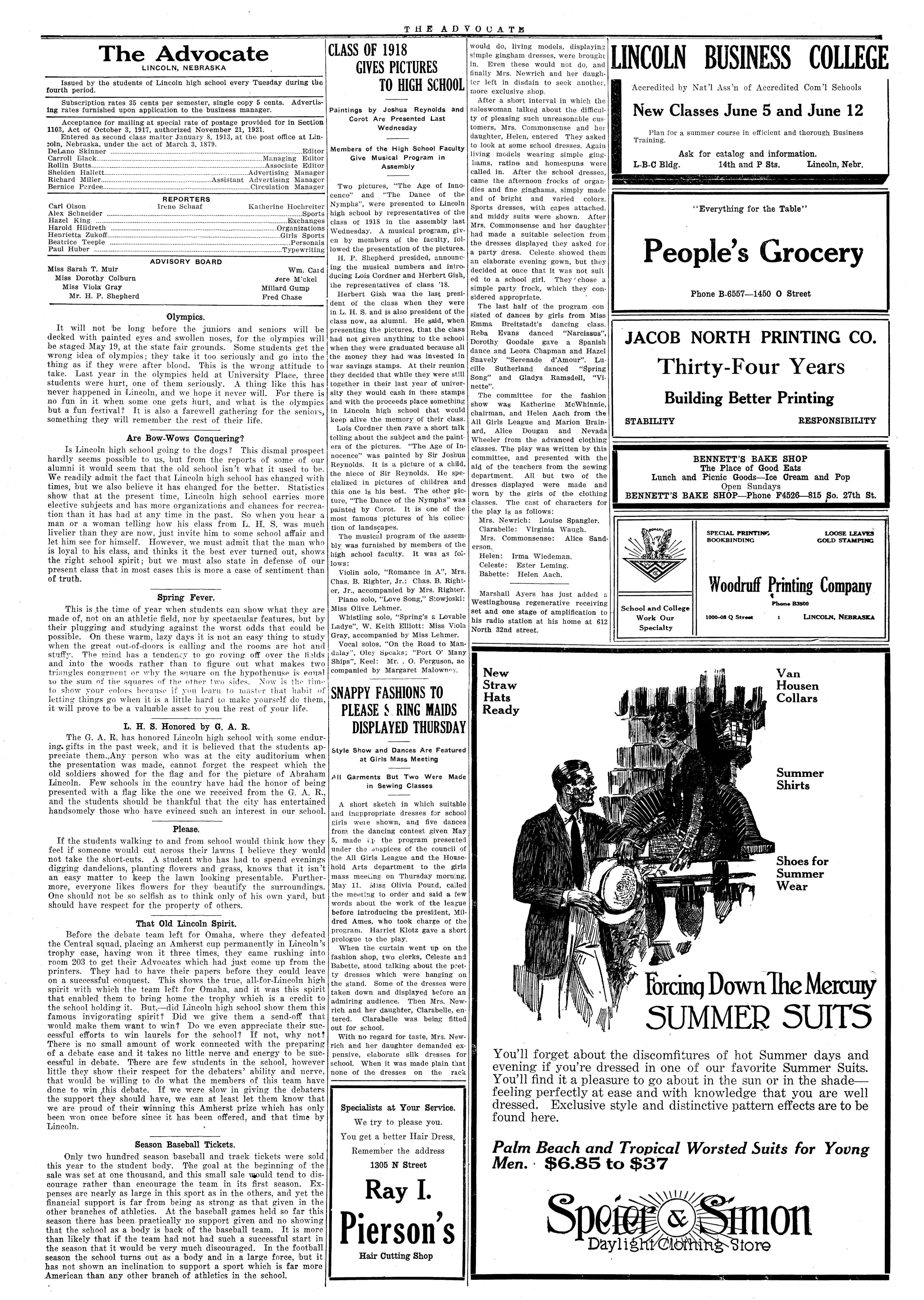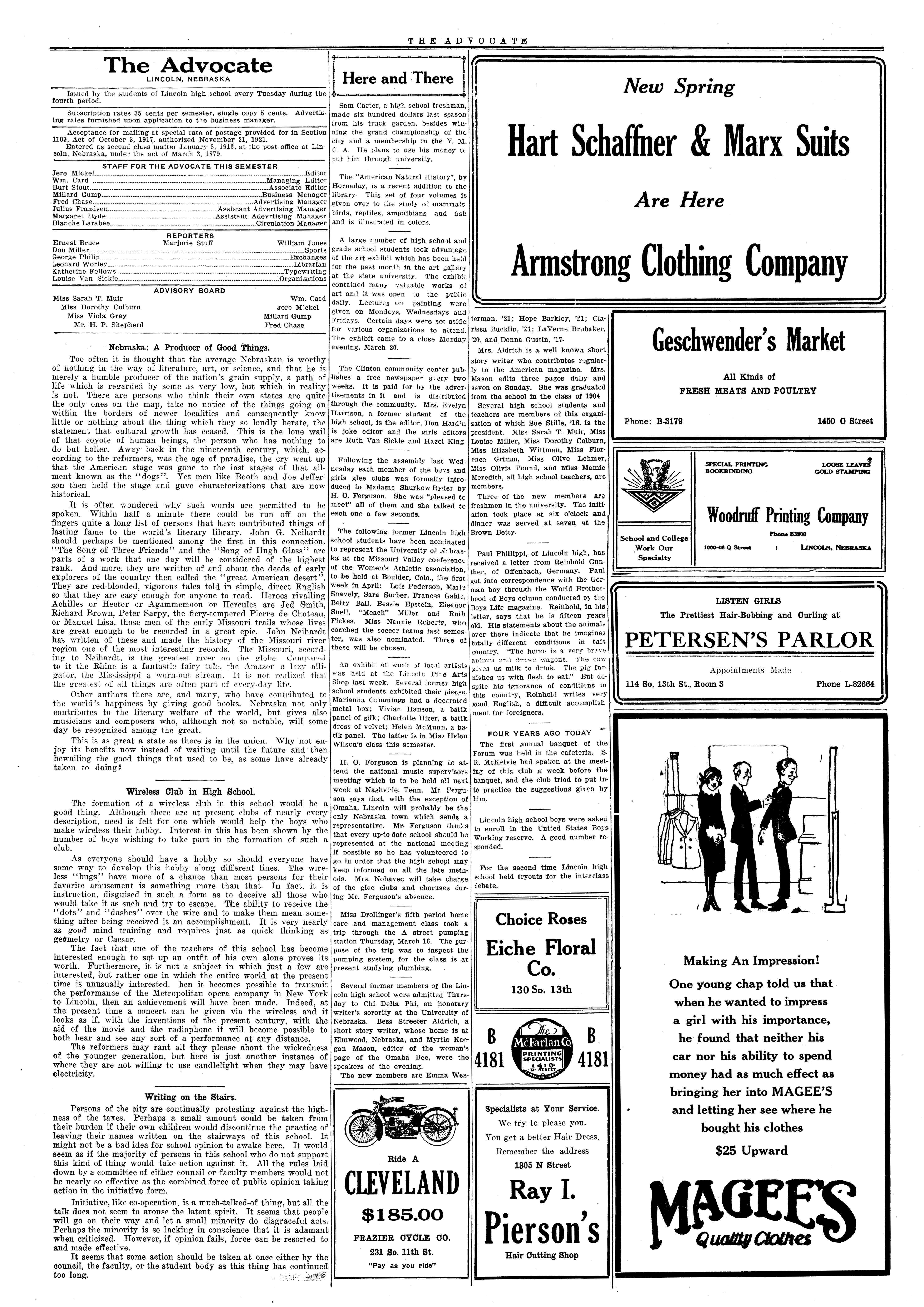 Owin(J' to the fact that Miss Amy Armstr ong r esi g ned this year , living in Fairbury, Neb. i l -and prI·ced unusually low Miss Dor;thy Colburn has bec ome a member of the advis ory boarcl Miss Mary Guthrie has obtained a ; ! of th e Advocate staff. lJnder th e n e w adviser , th e exp eds year's leave o-f absence because of m ! at many changes for the betterment of_ the paper. The assistance of I She will leave Wednesd'.lv ! every Lincoln high s ch ool student is needed to make the paper a for Fort Monroe, Va. , where her I success. It is the students' paper, it does not belong to the sta:ff ?r brother is stationed. She plans to faculty. Therefore, it is the duty of the students to support it_ 1!1 spend the entire winter in the south. the same way in which they support any of the other a ctrv1- Lyl e Hosford is doing social weltie s Every member of the student body should subscribe for the 1 fare work at Wichita, Kas. It is only means by whi ch they may know all of th e I Miss Alice Humpe married J. K. news m Lmcoln lugh school.