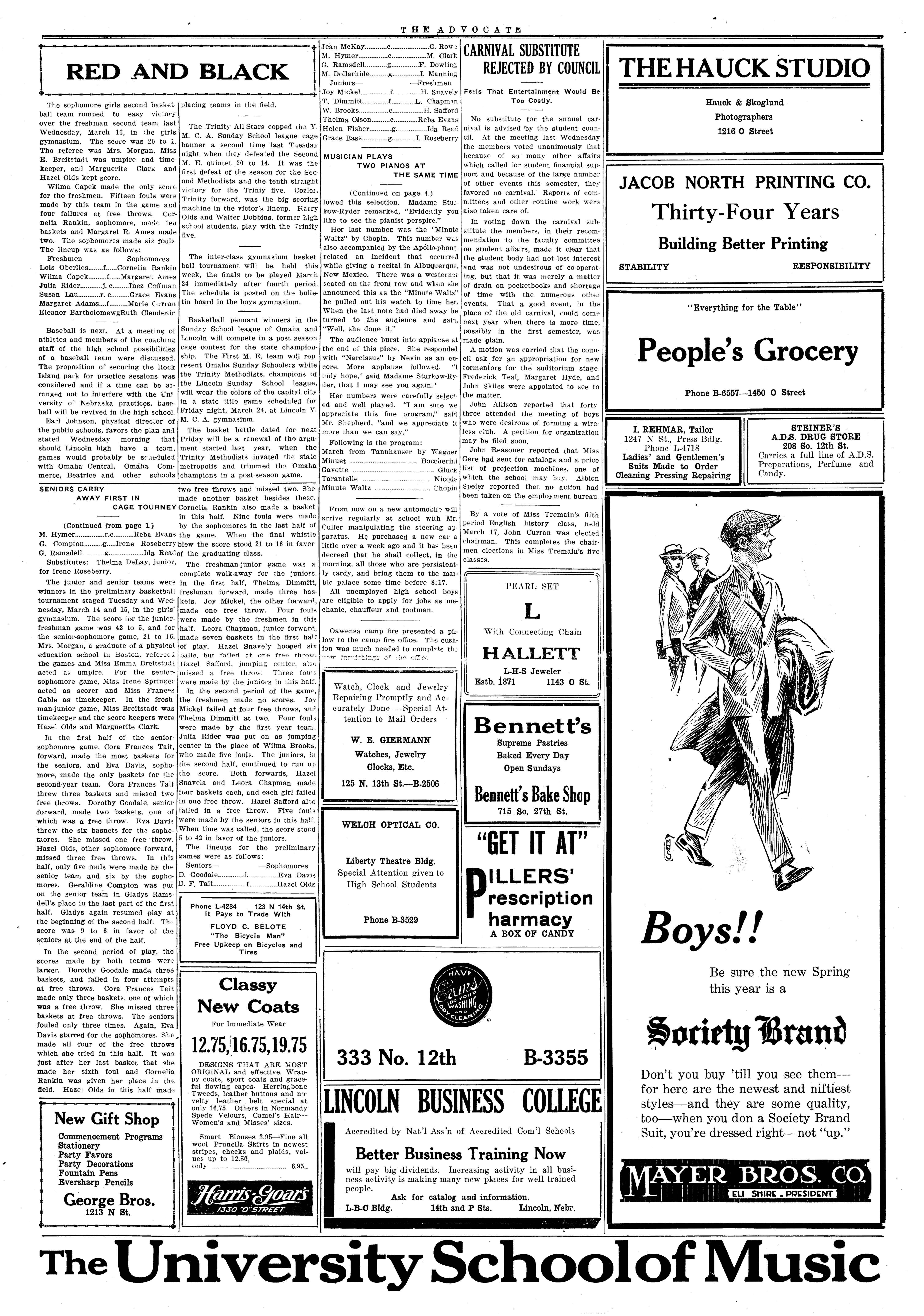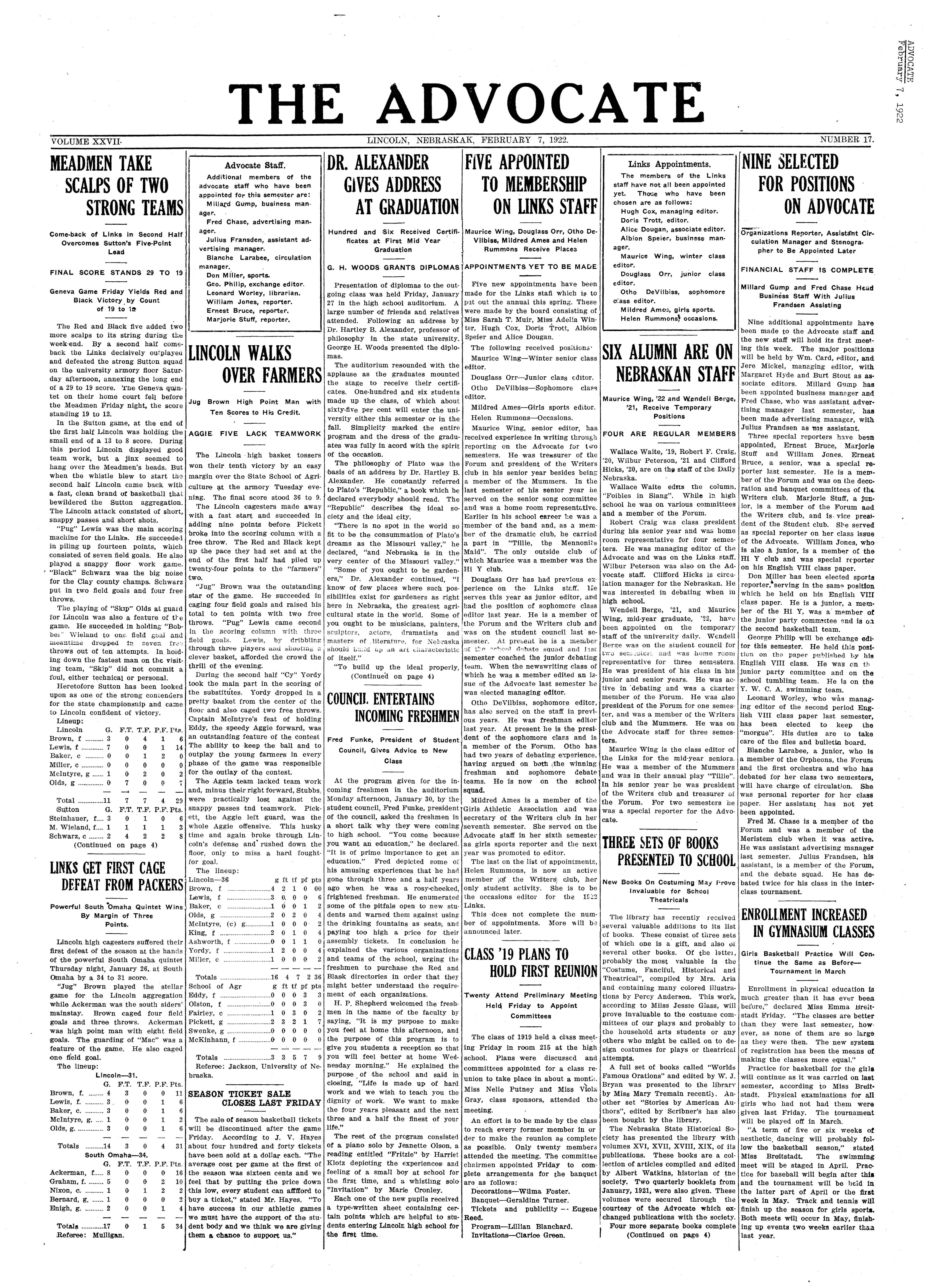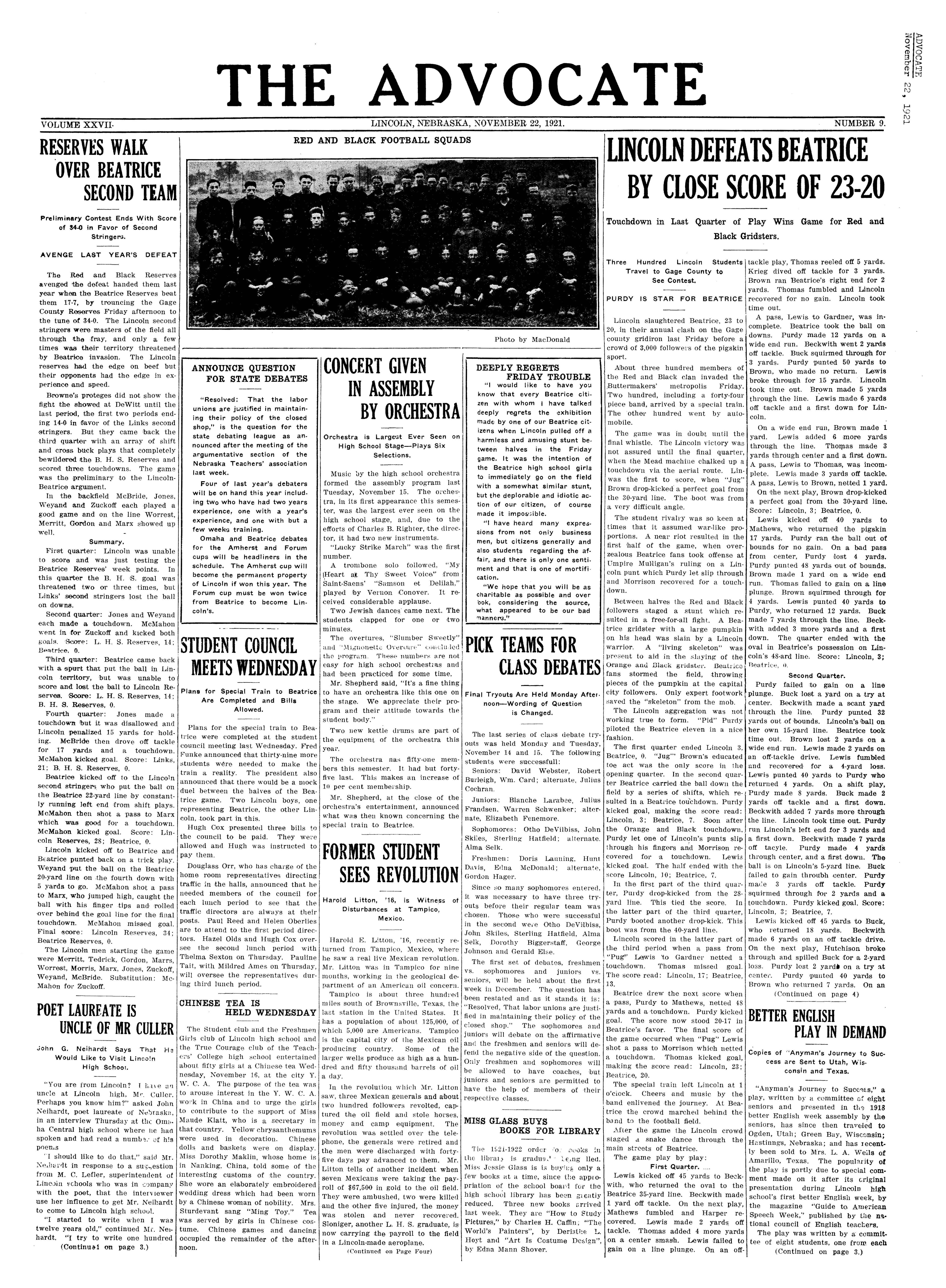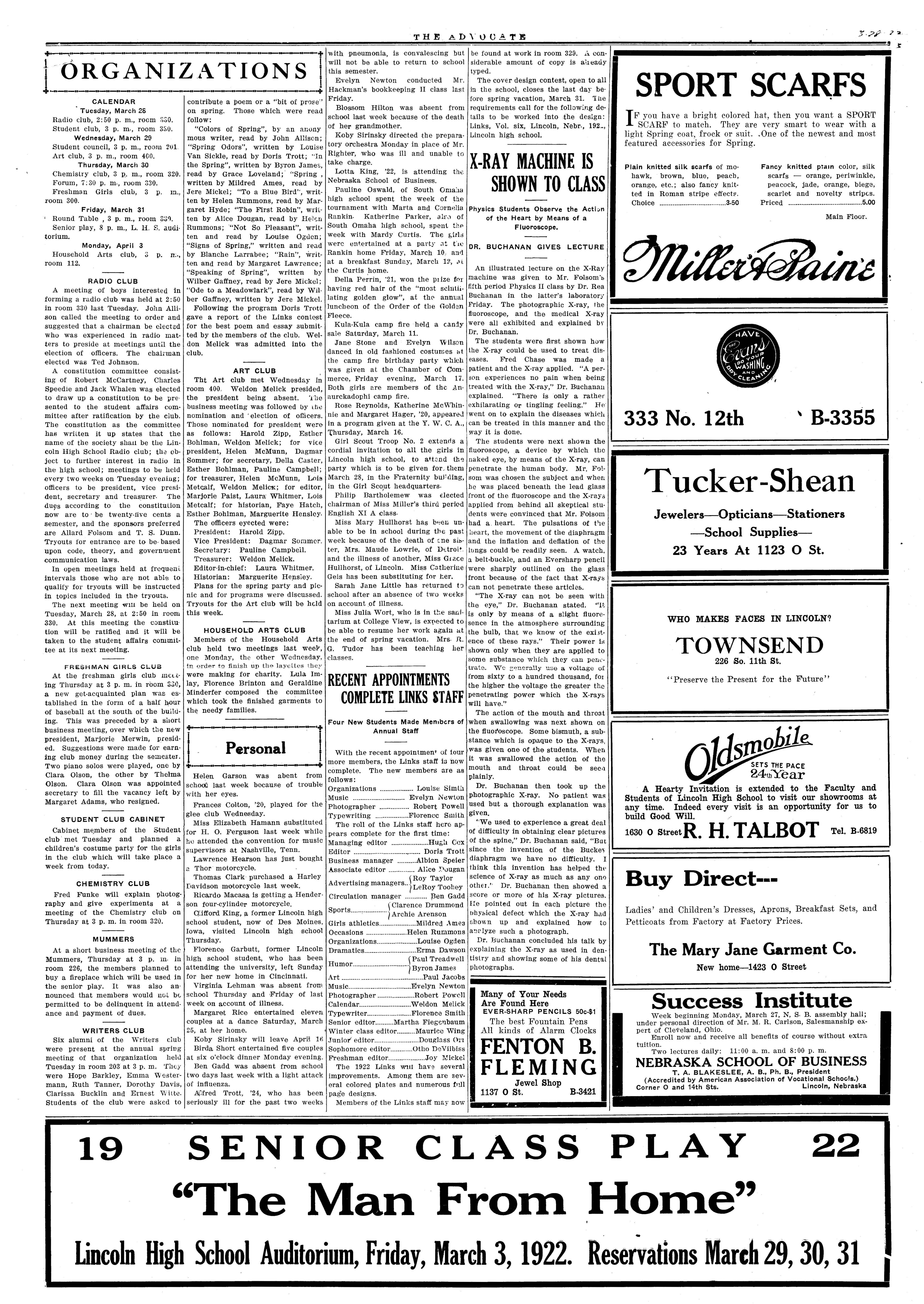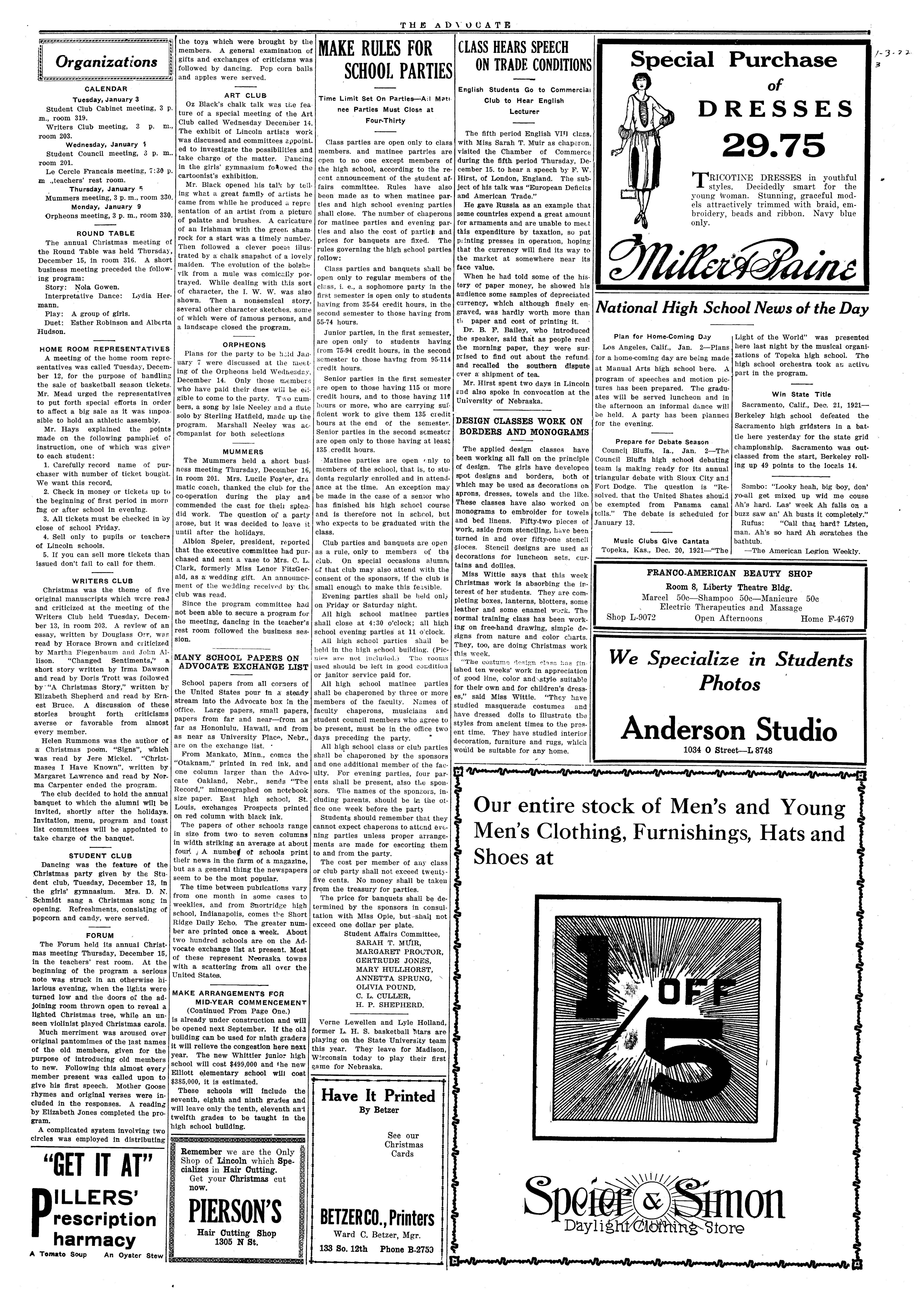 Owin(J' to the fact that Miss Amy Armstr ong r esi g ned this year , living in Fairbury, Neb. i l -and prI·ced unusually low Miss Dor;thy Colburn has bec ome a member of the advis ory boarcl Miss Mary Guthrie has obtained a ; ! of th e Advocate staff. lJnder th e n e w adviser , th e exp eds year's leave o-f absence because of m ! at many changes for the betterment of_ the paper. The assistance of I She will leave Wednesd'.lv ! every Lincoln high s ch ool student is needed to make the paper a for Fort Monroe, Va. , where her I success. It is the students' paper, it does not belong to the sta:ff ?r brother is stationed. She plans to faculty. Therefore, it is the duty of the students to support it_ 1!1 spend the entire winter in the south. the same way in which they support any of the other a ctrv1- Lyl e Hosford is doing social weltie s Every member of the student body should subscribe for the 1 fare work at Wichita, Kas. It is only means by whi ch they may know all of th e I Miss Alice Humpe married J. K. news m Lmcoln lugh school.