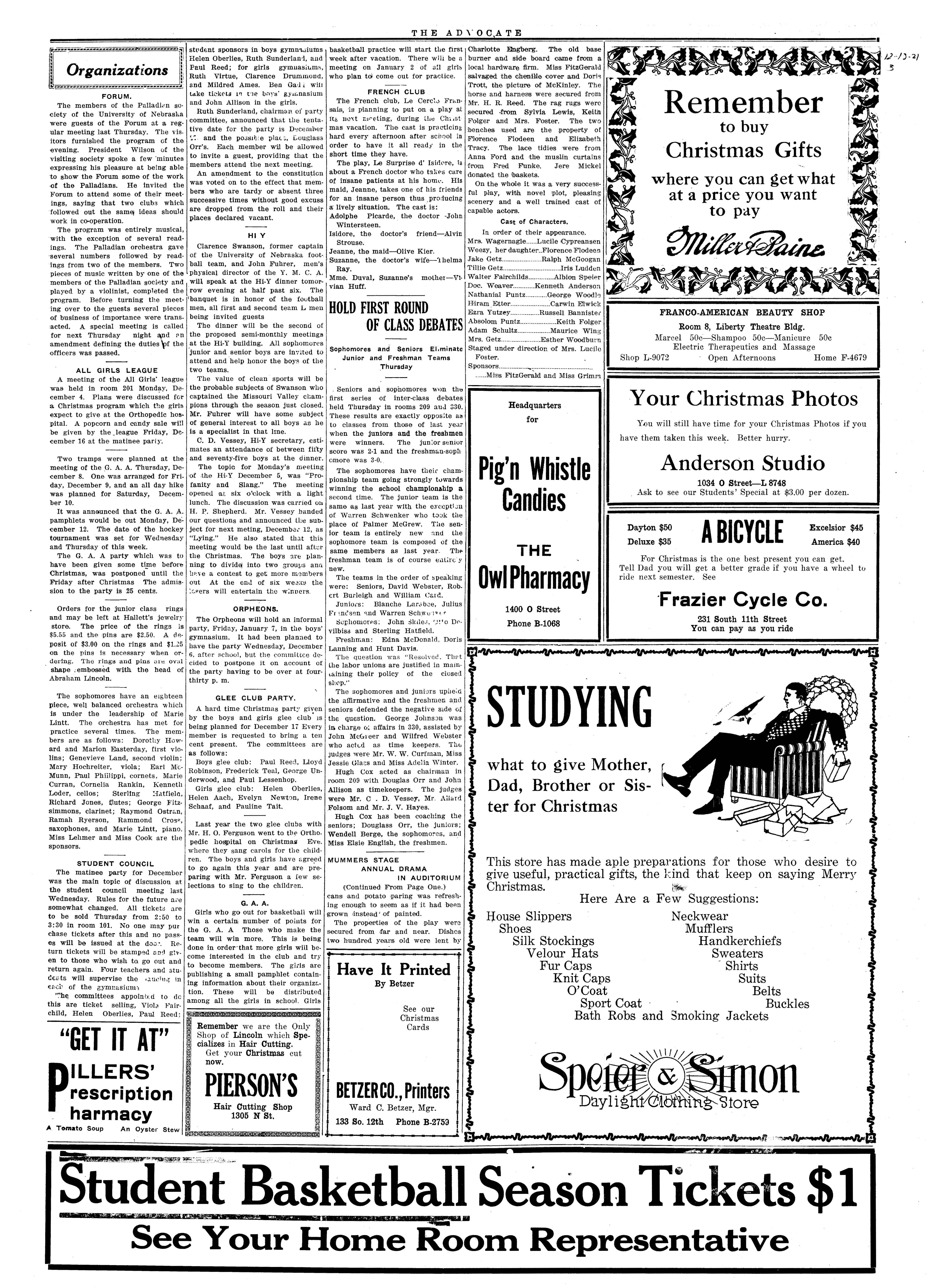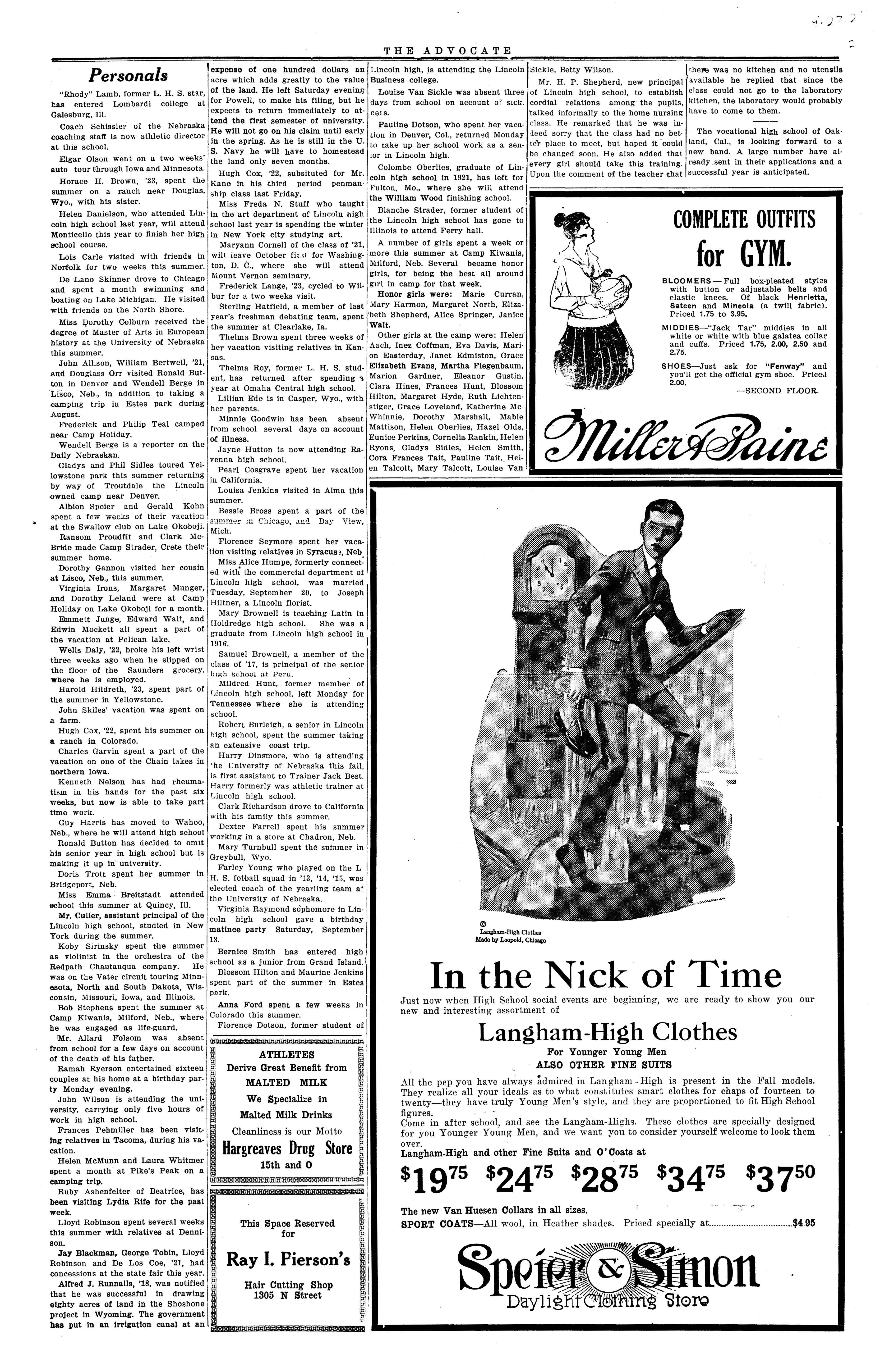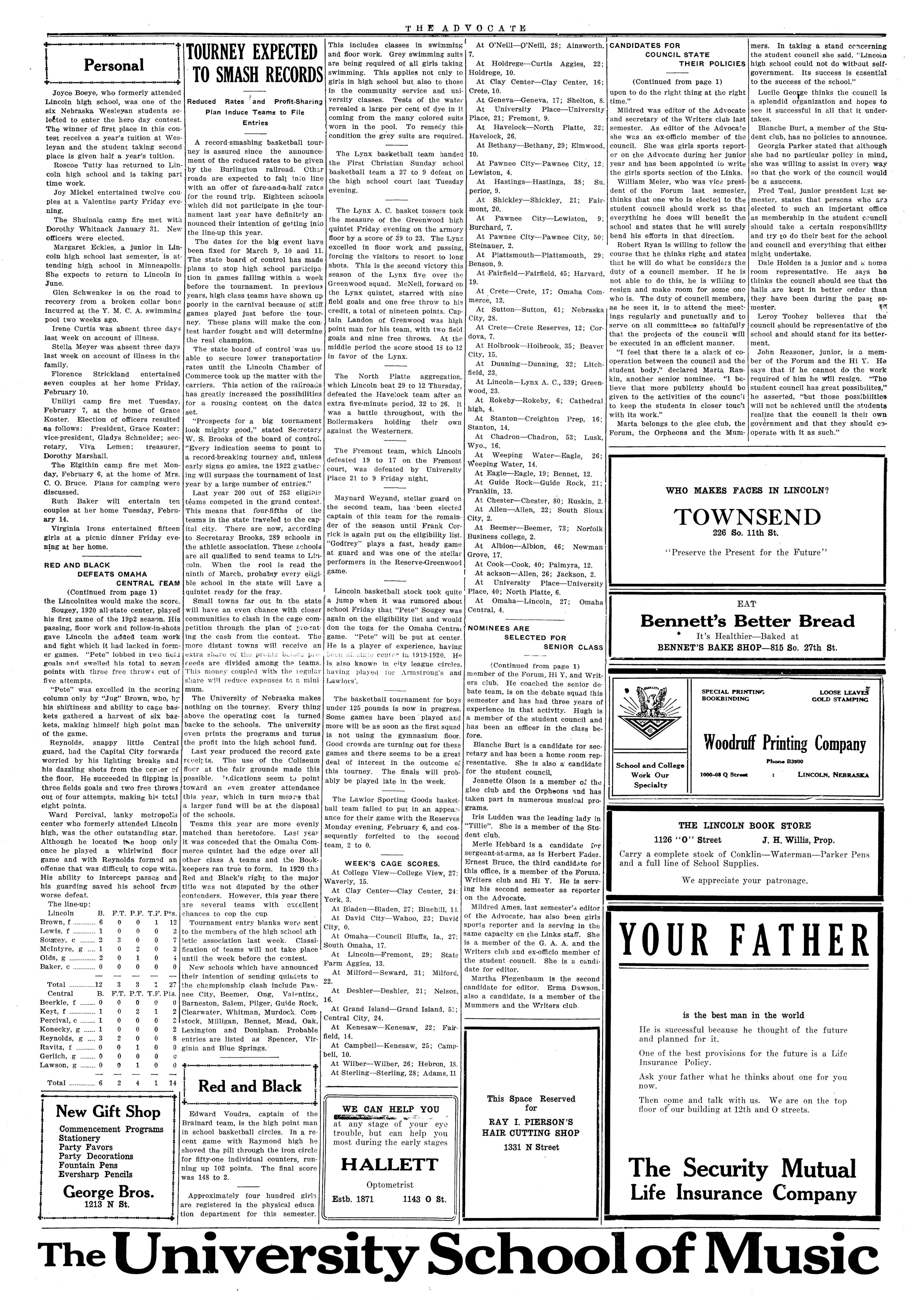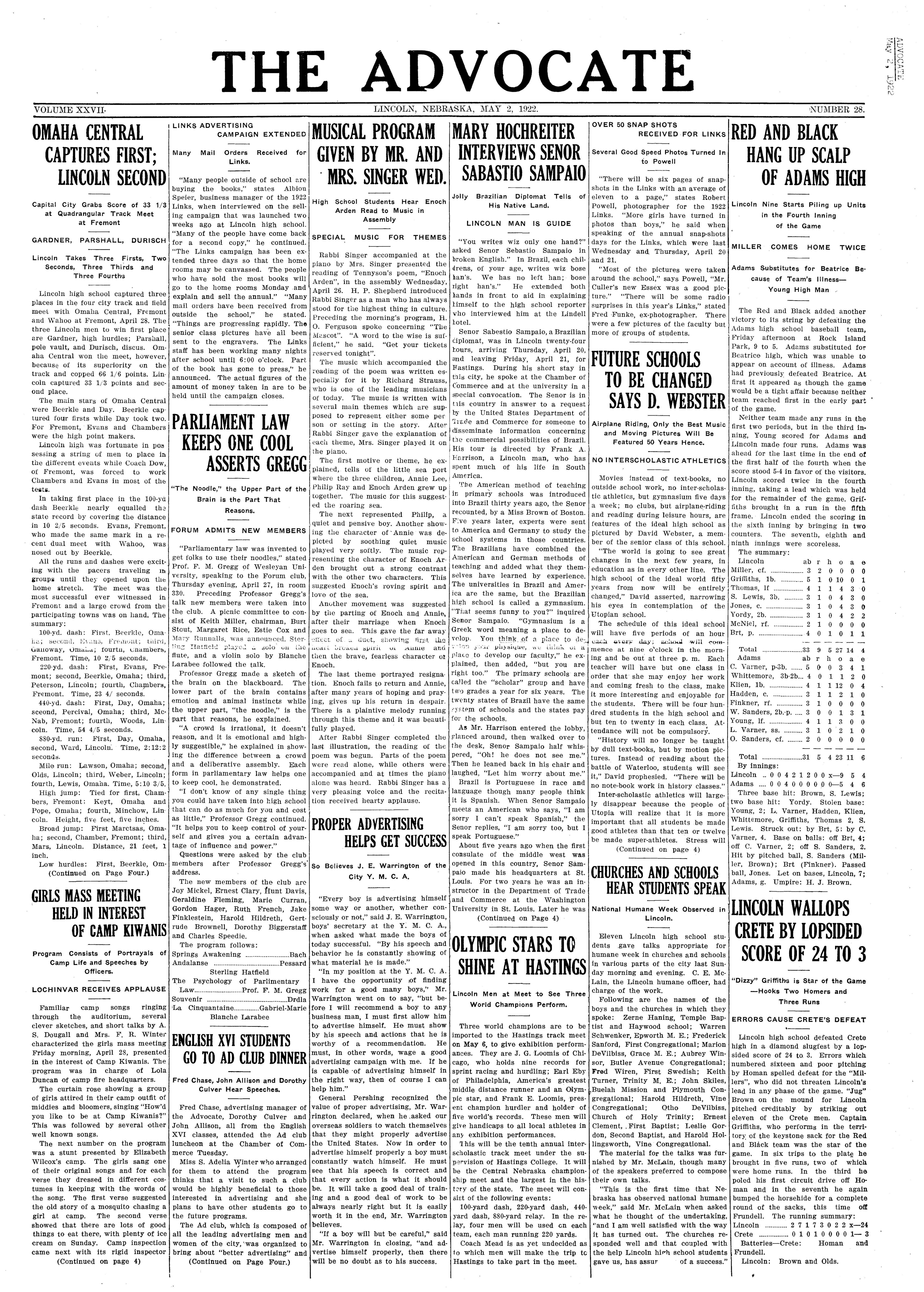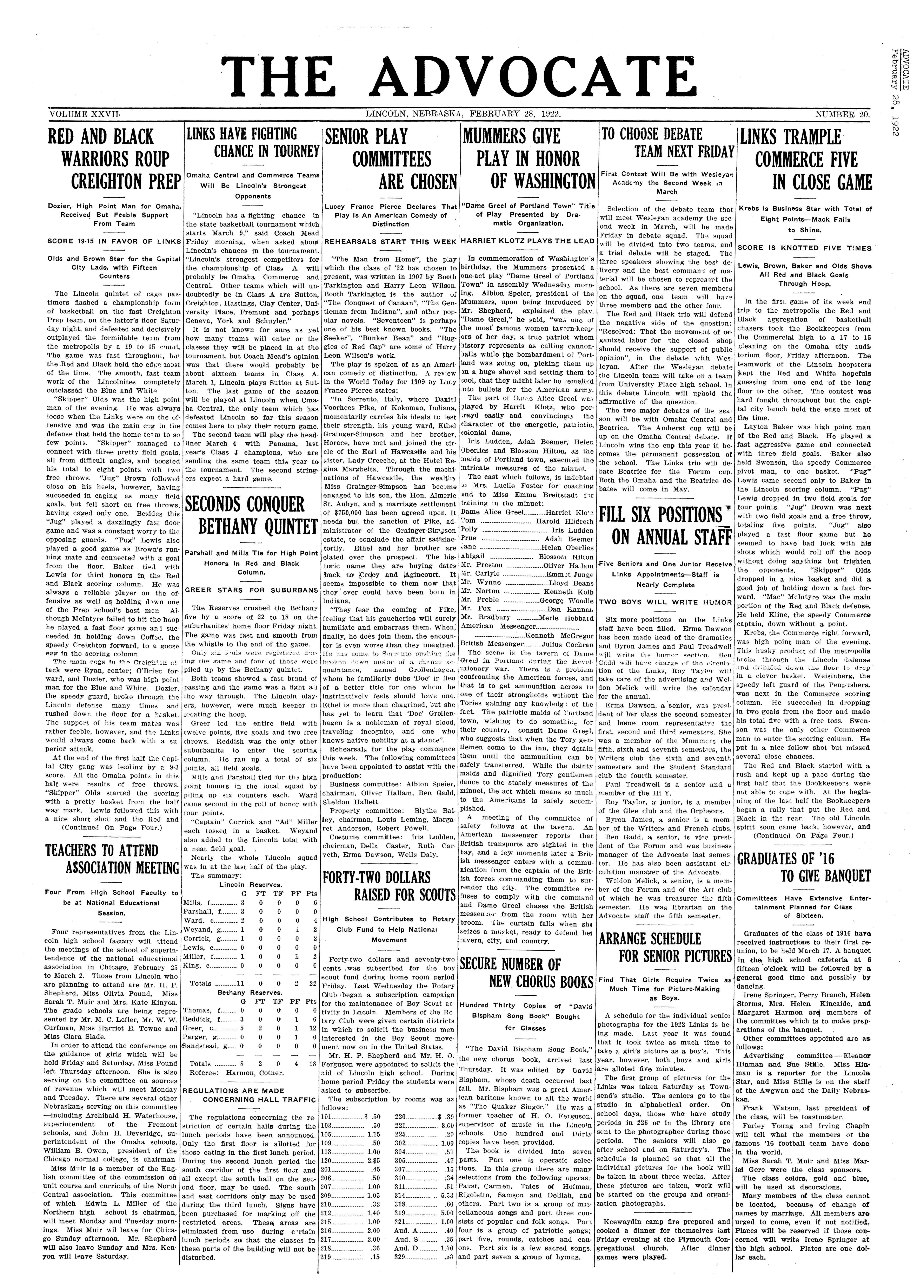 Owin(J' to the fact that Miss Amy Armstr ong r esi g ned this year , living in Fairbury, Neb. i l -and prI·ced unusually low Miss Dor;thy Colburn has bec ome a member of the advis ory boarcl Miss Mary Guthrie has obtained a ; ! of th e Advocate staff. lJnder th e n e w adviser , th e exp eds year's leave o-f absence because of m ! at many changes for the betterment of_ the paper. The assistance of I She will leave Wednesd'.lv ! every Lincoln high s ch ool student is needed to make the paper a for Fort Monroe, Va. , where her I success. It is the students' paper, it does not belong to the sta:ff ?r brother is stationed. She plans to faculty. Therefore, it is the duty of the students to support it_ 1!1 spend the entire winter in the south. the same way in which they support any of the other a ctrv1- Lyl e Hosford is doing social weltie s Every member of the student body should subscribe for the 1 fare work at Wichita, Kas. It is only means by whi ch they may know all of th e I Miss Alice Humpe married J. K. news m Lmcoln lugh school.
