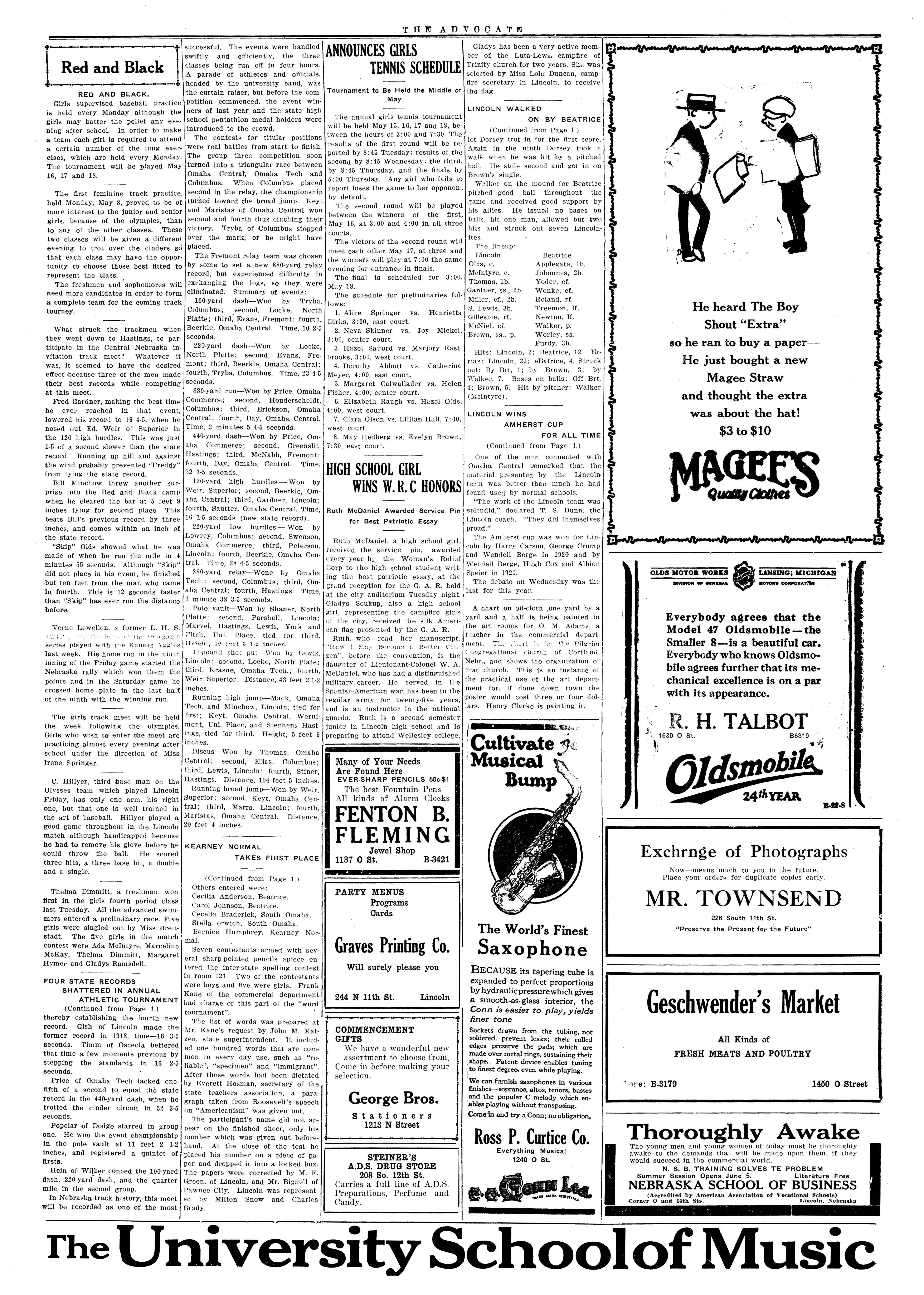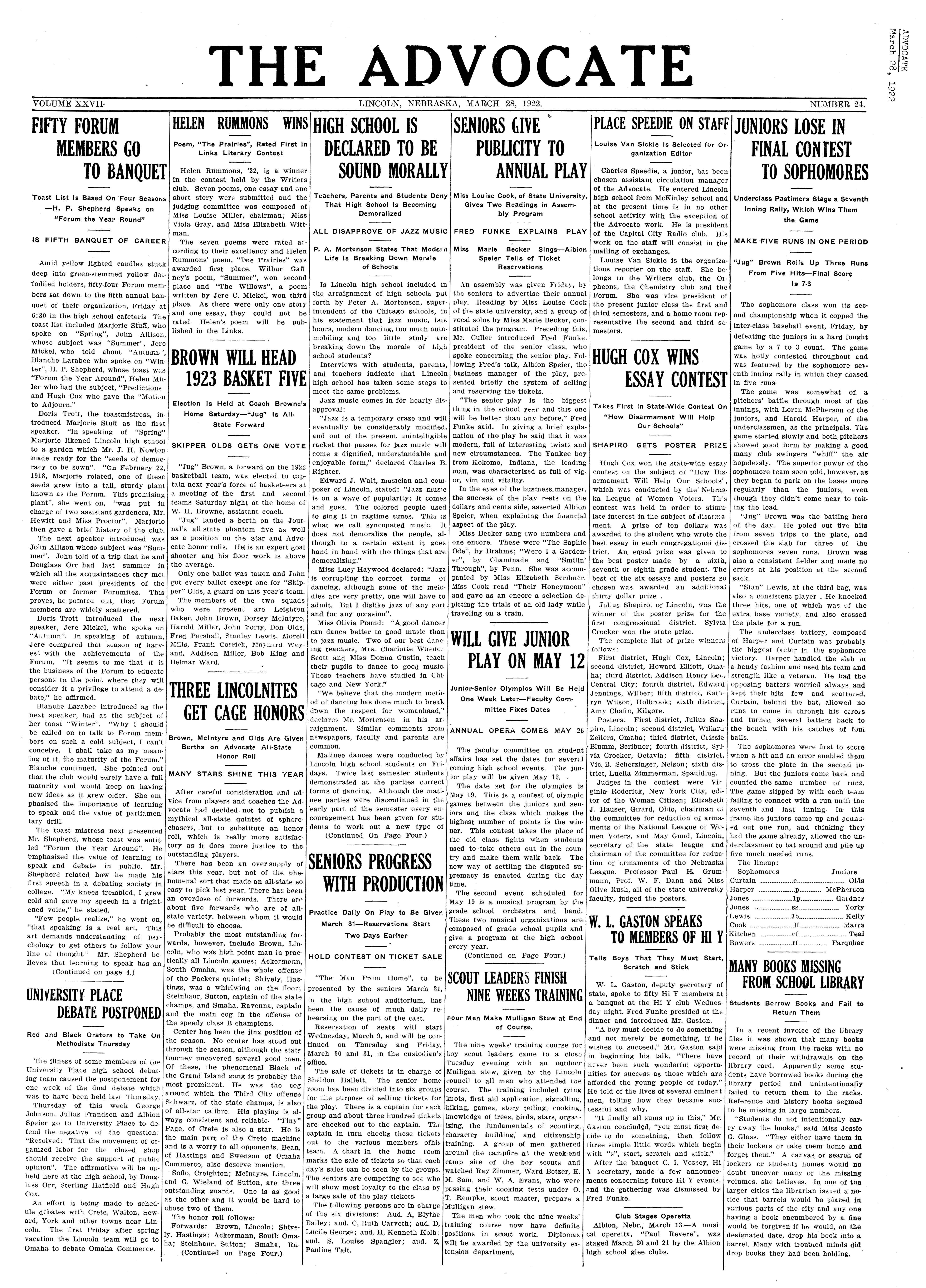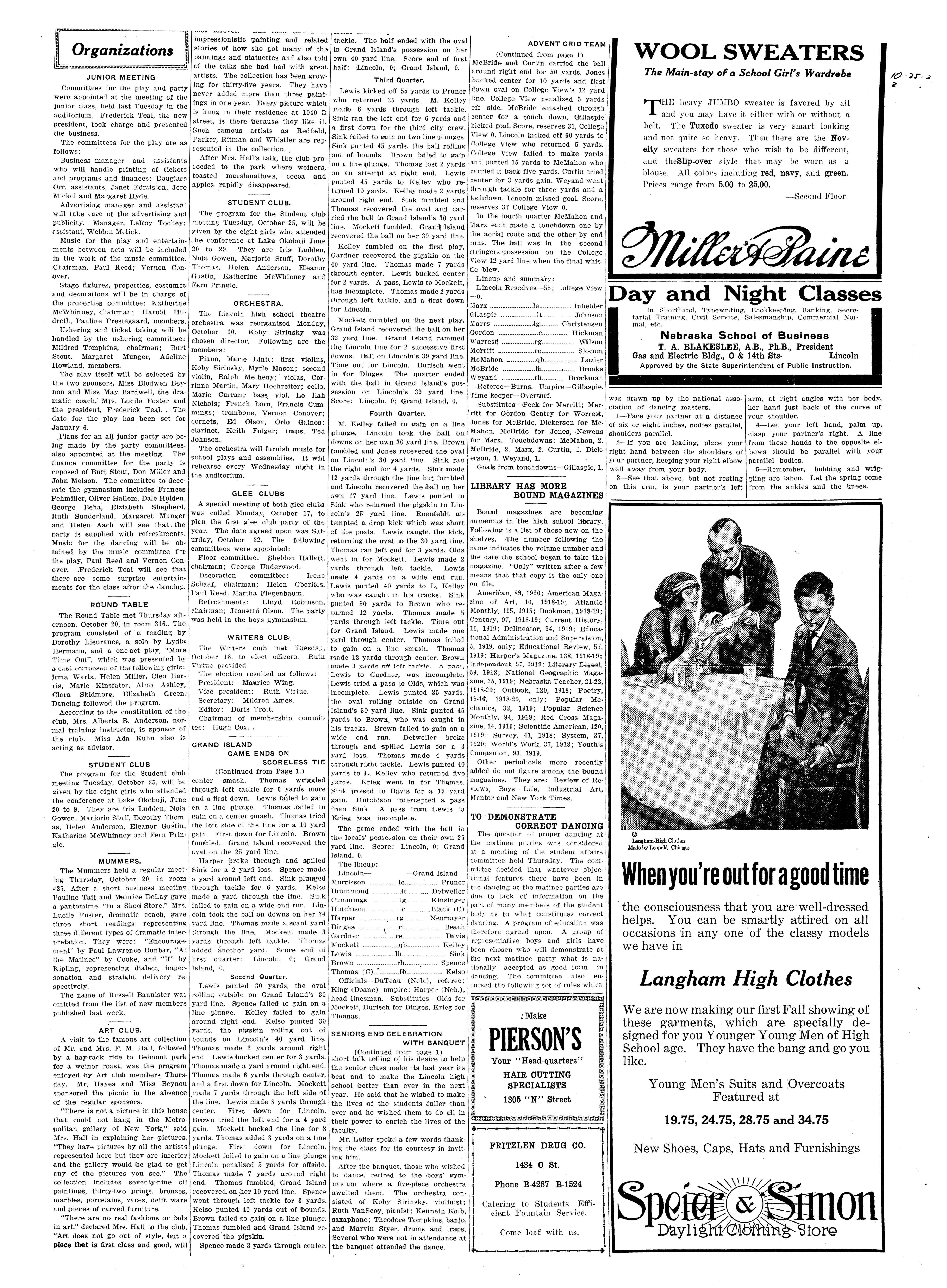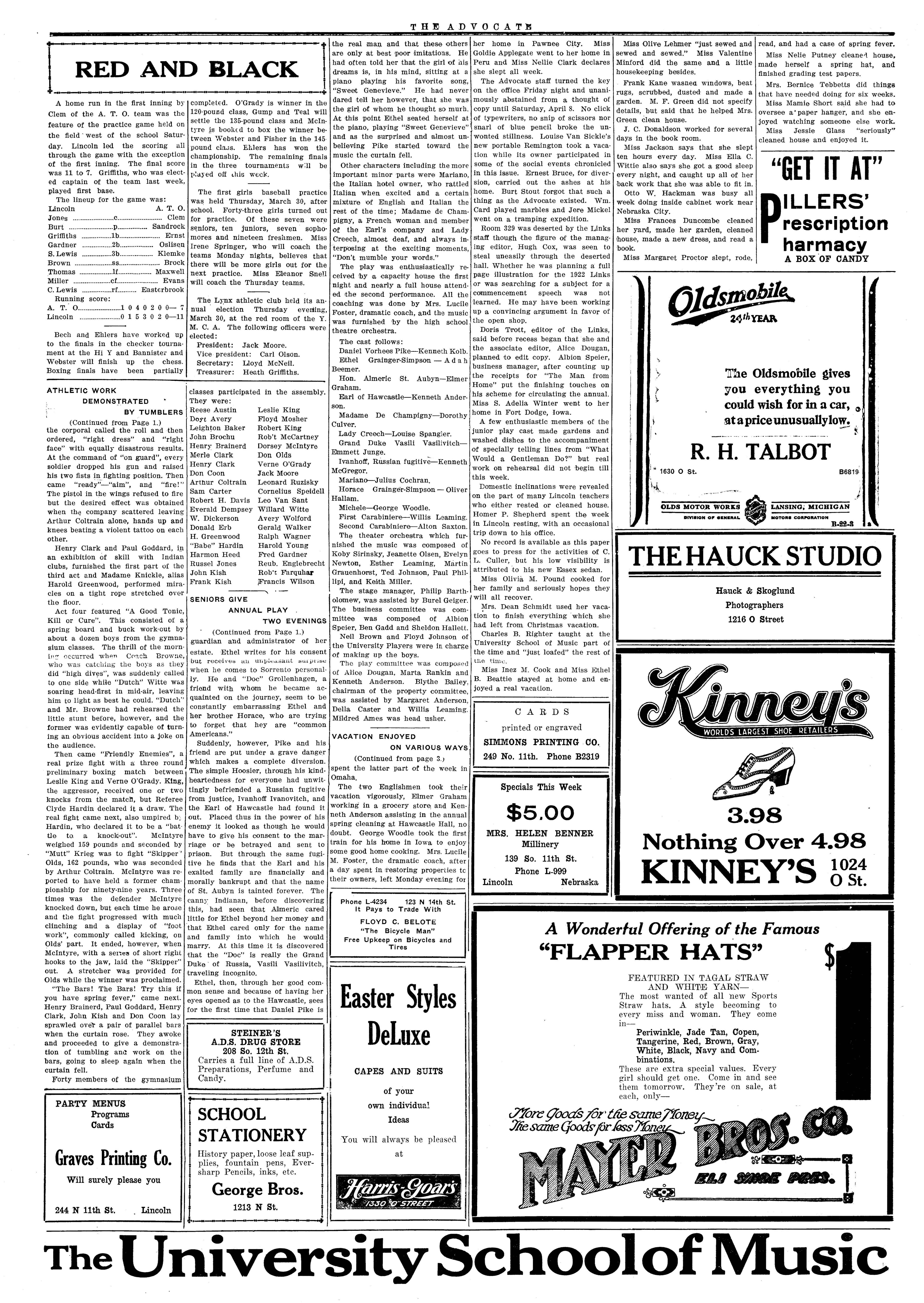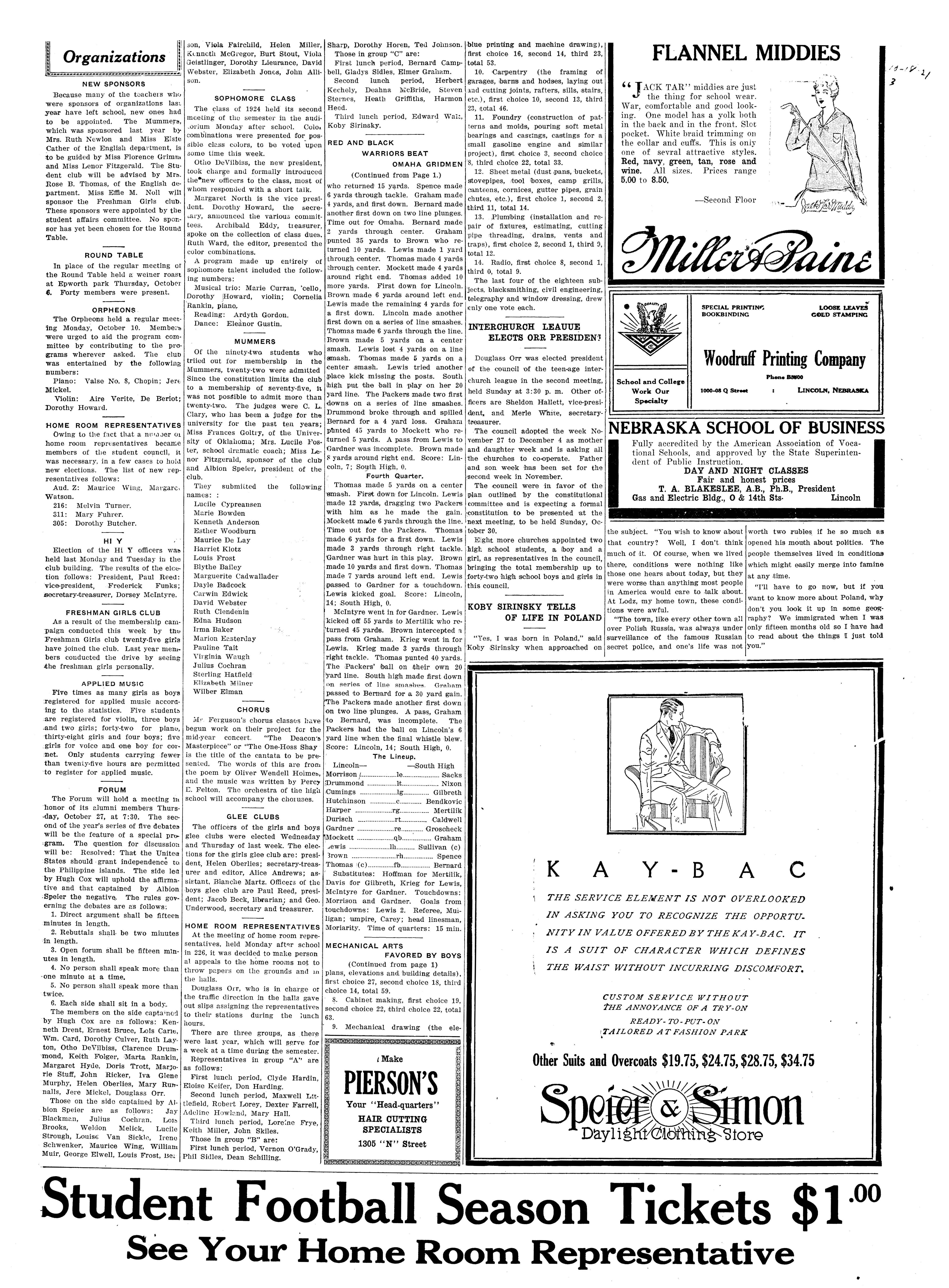 The organizations ;editor is Doris Beta Kappa, honorary scholarship fra- students: Mr Shepherd, Miss Pound, i and Din.ges, center; Harper, tackle. I have come to the conclusion that Trott, assistant circulation manager ternity, and of the English club. She! Mr. Culler, Miss Muir, Hugh Cox, John j The re serve team is made up of the there is here a wonderful faculty, a or last semester. She is a member of has taught mathematics at Red Cloud. Allison, Helen Oberlies, Alice Springer i following gridiron men: Marx, Mc- fine school and an extraordinary group the Forum, the Mummers, the Writers i and. for th.e last t':o years has been an 1and Douglass Orr. I Bride, Worrest, Du_risch •. Marr.s, of students. club and the Student Standard cabinet. aRs1stant m the history department at' After careful consl<leration of all. rick, Gordon, Merritt., Dickerson, Gil- Twenty-one hundred shares of high She was a member of the jumor-senior 1 1the of Nebraska. I who were eligible and who :'.ere j laspie, Jones, McMahon, Warde, school. stock were purchased at the committee last year and has taken M!ss v alerm Bonnell, new m the thought to be fitted for the pos1t10n, I derwood, McPherson, Cm- beginnmg of the school year," con· part in two plays, "$1200 a Year" and modern language department, was ! the following students were nomi- , tafn, ParsfJall, Gentry, tinued Mr. Shepherd, "and each share "Behind the Scenes." I gra?uated from the University of Ne- nate·d: Englebrecht, Des Jardien, H1ckmirn,. has cost $116 according to the statisArchie Arenson is taking c•harge of l·braska in 1914. She was a member of I Scnio•' Boys. Curran, Hay, tics from last year. The question ls the boys' sports. Phi Beta Kappa and Black Masque, i John Allison /Hill, Neeley, Watkms, Tayler, Joh.11- ! whether you'll hang on to this stock Viola Fairchild, the exchange editor, i now M'Ortarboard. She took post I Hugh Cox 1 son, Black, Baker, Blake, Clary, Davis, · long eno ugh to maim good on the came from the McKinley prepartory work in the University of Ne· FTancis Cummings Dean, Bernard, Ghode, Hager, Jen- investment." in 1919 and will make high school iu 1braska, Columbia University, and one I Frank Dinges 1 nings, Bain.' Kuntz, "Loiter, scowl, get the put off habit, two and a half years. She was one 1 year at a private school of languages I Clarence Drummond Leath, Morns, Marsh, Malt1son, Muma, see no good in anything, cultivate bad o: the home room representative m Lucerne, Switzerland. For the past ! Fr0u I 'unke IMulligan, Pick, Patterson, Shostack, companions, trust to luck, cut the corridor guards lctst semester. year Mis3 Bonnell has been teaching I Ben Gadd ! Saxton, Sheldon, Todd, Taylor, Ww- corners of a square deal have a cateT'he three special reporters are in Cheyenn3,, and previous to I Millard Gump ! and, Woodle, Winsor, Burress. Jess appearance, have no ambition, use Kenneth Anderson, Ernest Bruce and that she taught at Harvard and I<"'rf.-1 Raymond McMahon I 'l'hR initi<Ll argument wil.l be with no self control, let your mind be full Maurice Wing. Kenneth Anderson is Irnont. I Albion Speier i York at York, October 7. The Gage' ot hate, treat your work as a bore, a .member of the Orpheons and the ; Miss Gri_mm, another Mat:.rice Wiug county Bea tric:, con- study"-Mr'. Shepherd's effec· H1 Y. Ernest Bruce is a member. of teacher in the Enghs h department. is • Ralph McGoogan the p1gskm sport w.1th Lmcoln 11ve formula for failure. the Forum, the Writers club and the a graduate of the University of Ne- Senior Girls. his yea: as usual. According to Mr. Shepherd there Hi Y. Maurice Wing was a special i l1raska in 1912 In 1917 s_he completed Bla nche Burt The 11rst by are three main objects oir a high reporter last semester and is a mem- , her work for the master's degree at I Viola Fain.:hild Mead, confines its practice activities school education. ber of the Forum, Mummers, Writer;0 I this university. Last summer she took I Martha F iegenbaum !.to. th.e new athl:tic. field. of the Fir st-To help the student to find club and the Hi Y. 1 work at Madison, Wis., in the univer- Iris Ludden 1bmldmg. The JUmor p1.gskm squad 'is life's work.