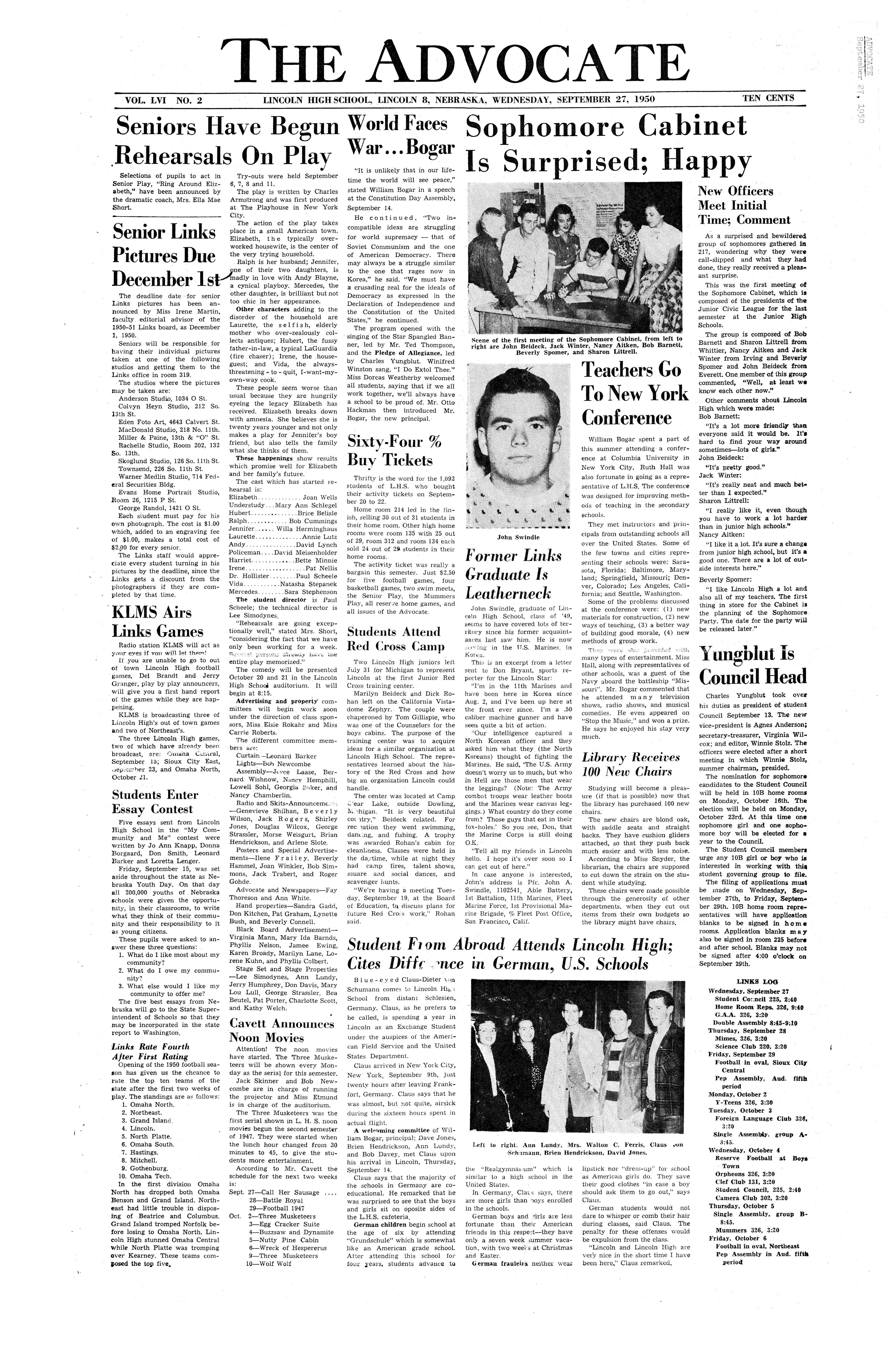 We hope you will enjoy your work in Lincoln High School as much · as we enjoy being a part of one of the top schools in the state. We feel that all pupils will try to cooperate and make all new ordeals easier for you; We of the Advocate staff would at any time like to become better acquainted with all of you. We are always happy to receive any suggestions as to making the Advocate and better each time it is published.