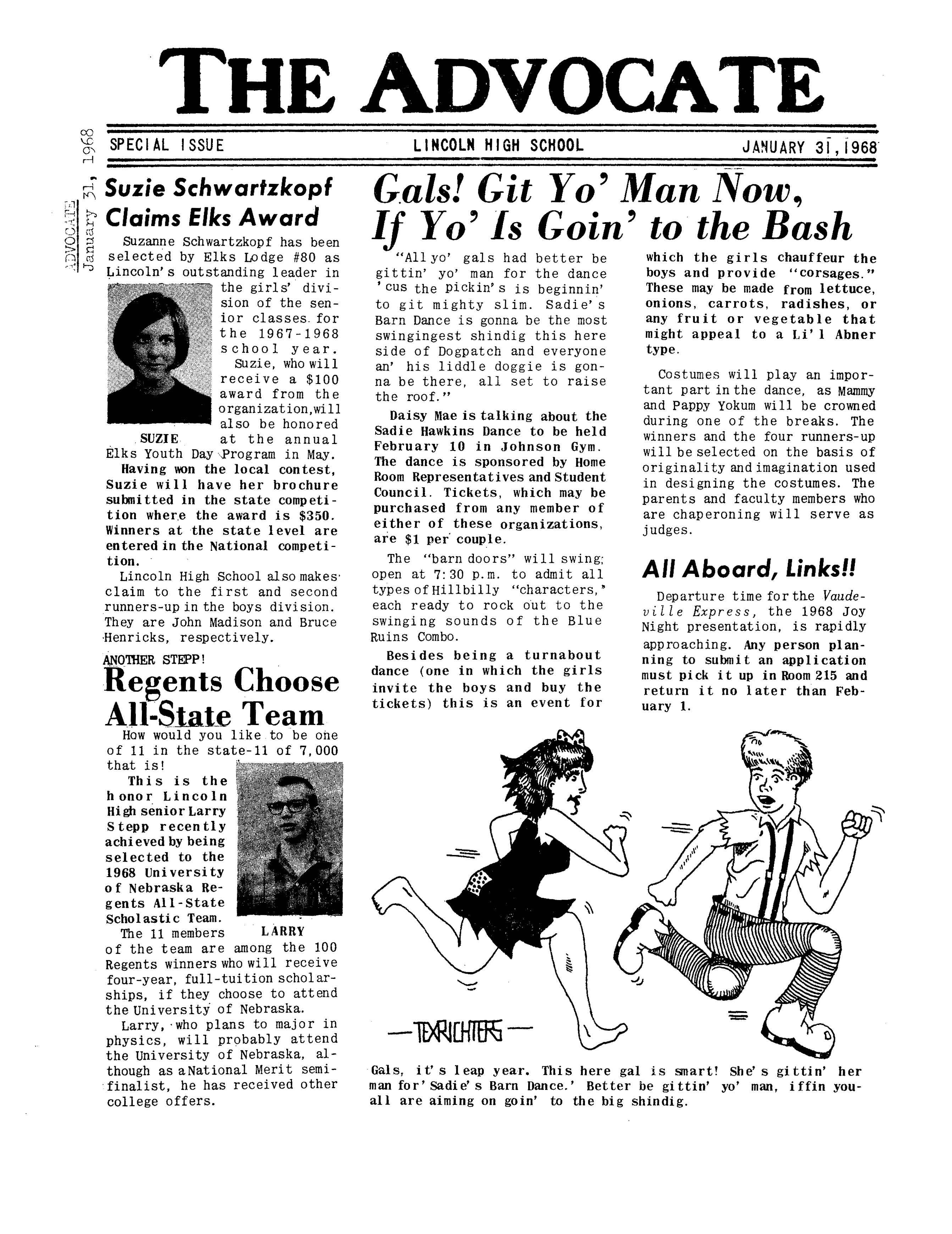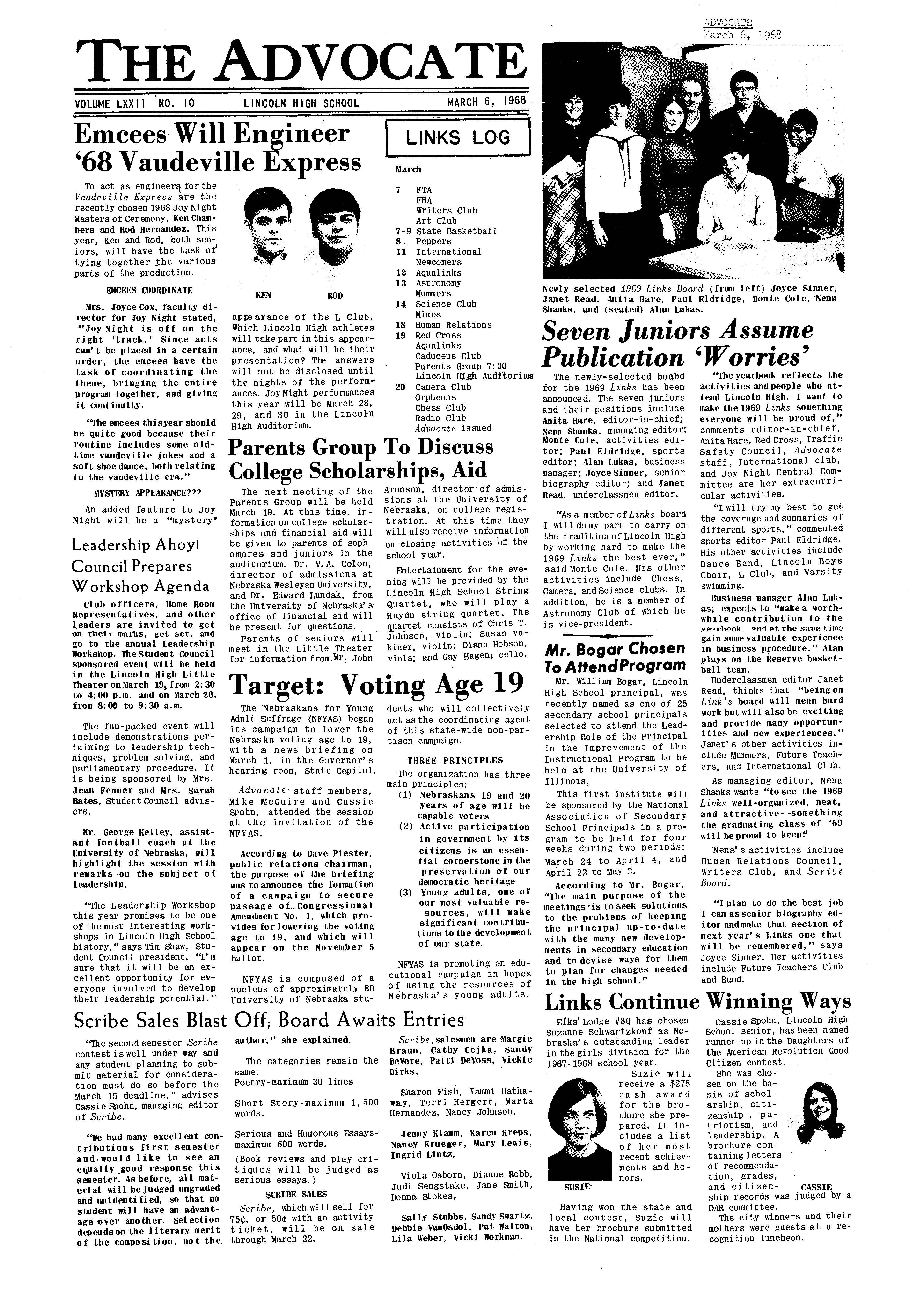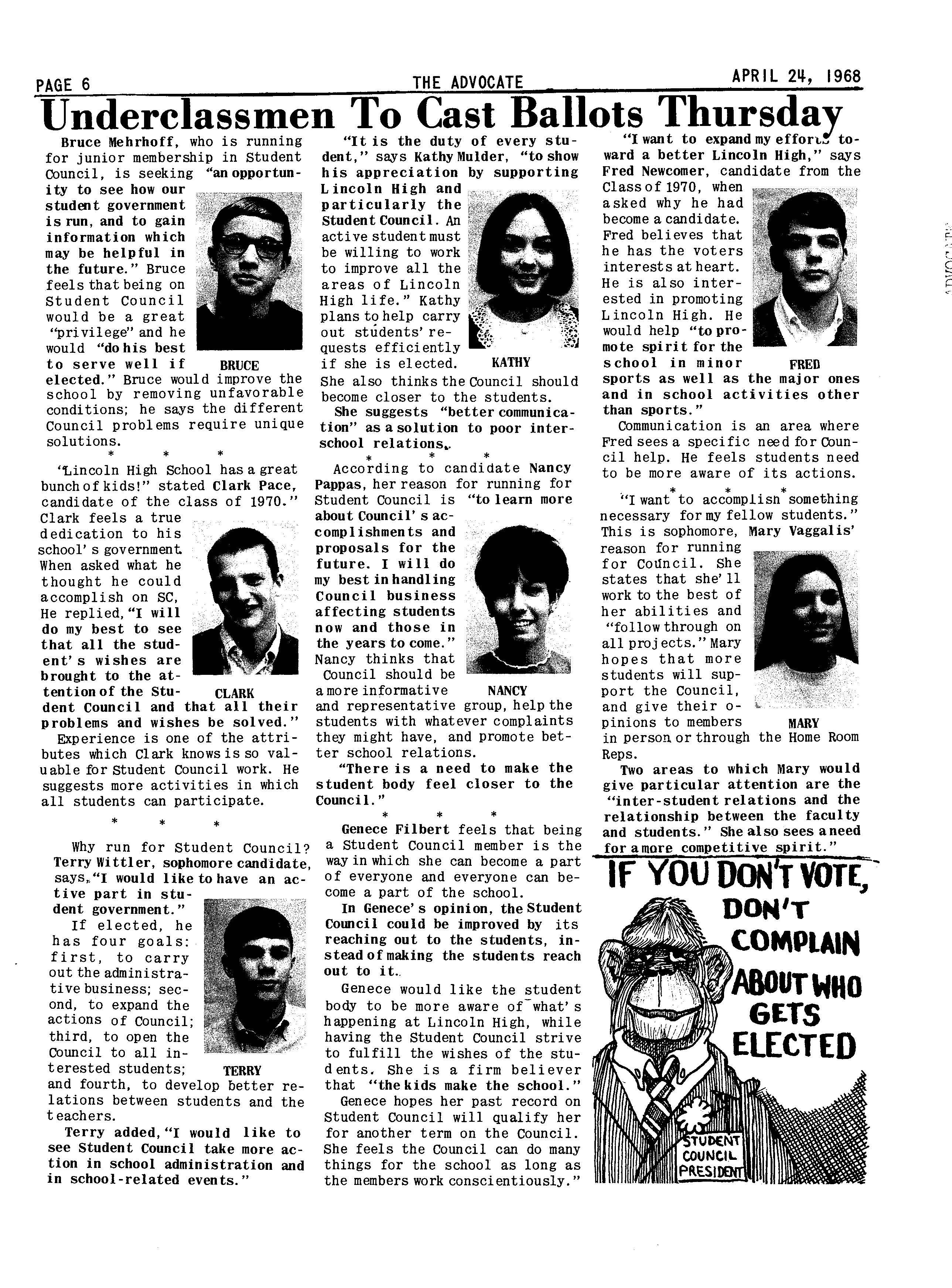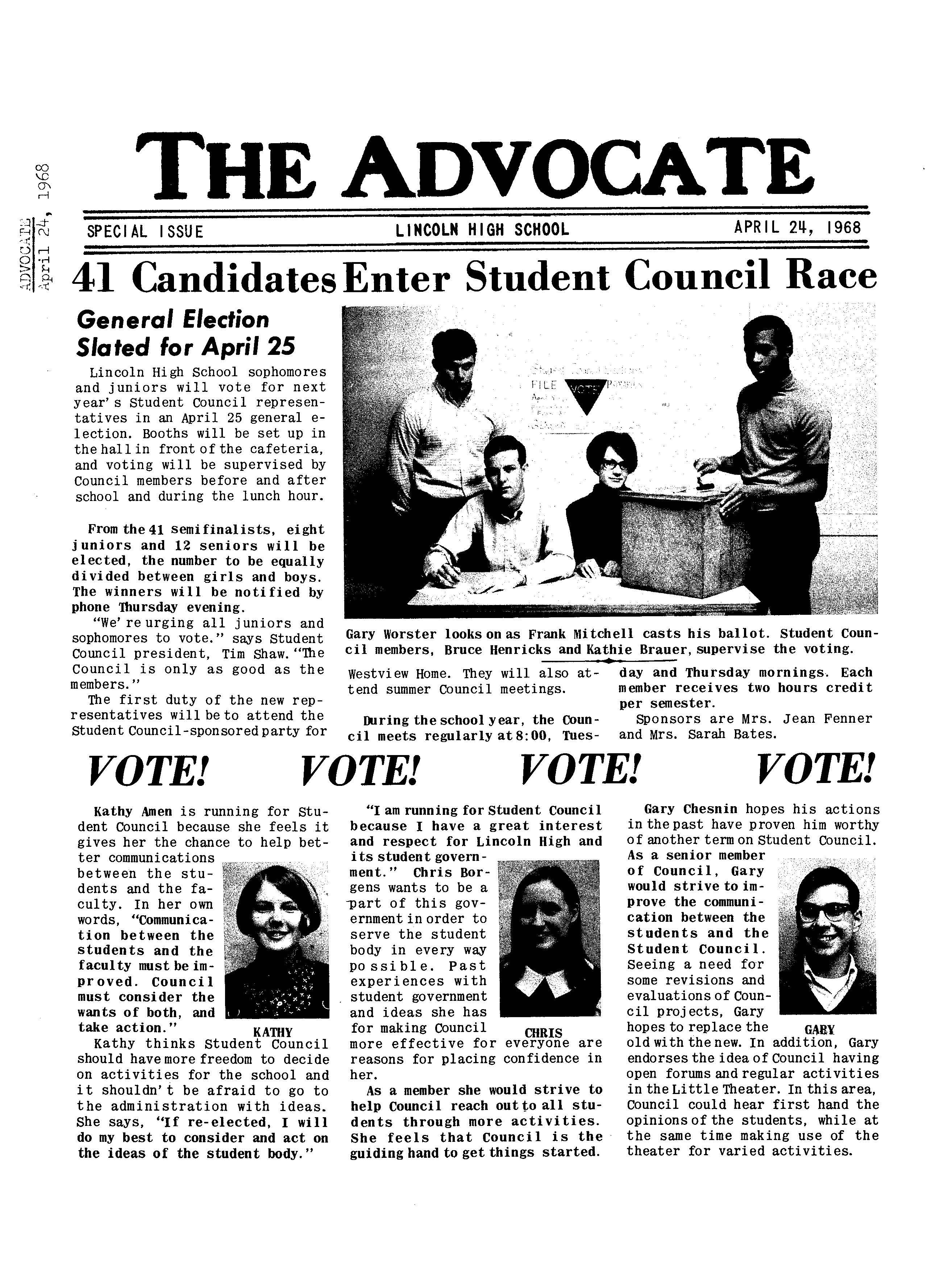 The Advocate is published by students of Lincoln High School bi-weekly during the school year except immediately following vacations. It is issued without cost to every Lincoln High student. Advertising rates are $1.25 per column inch.
