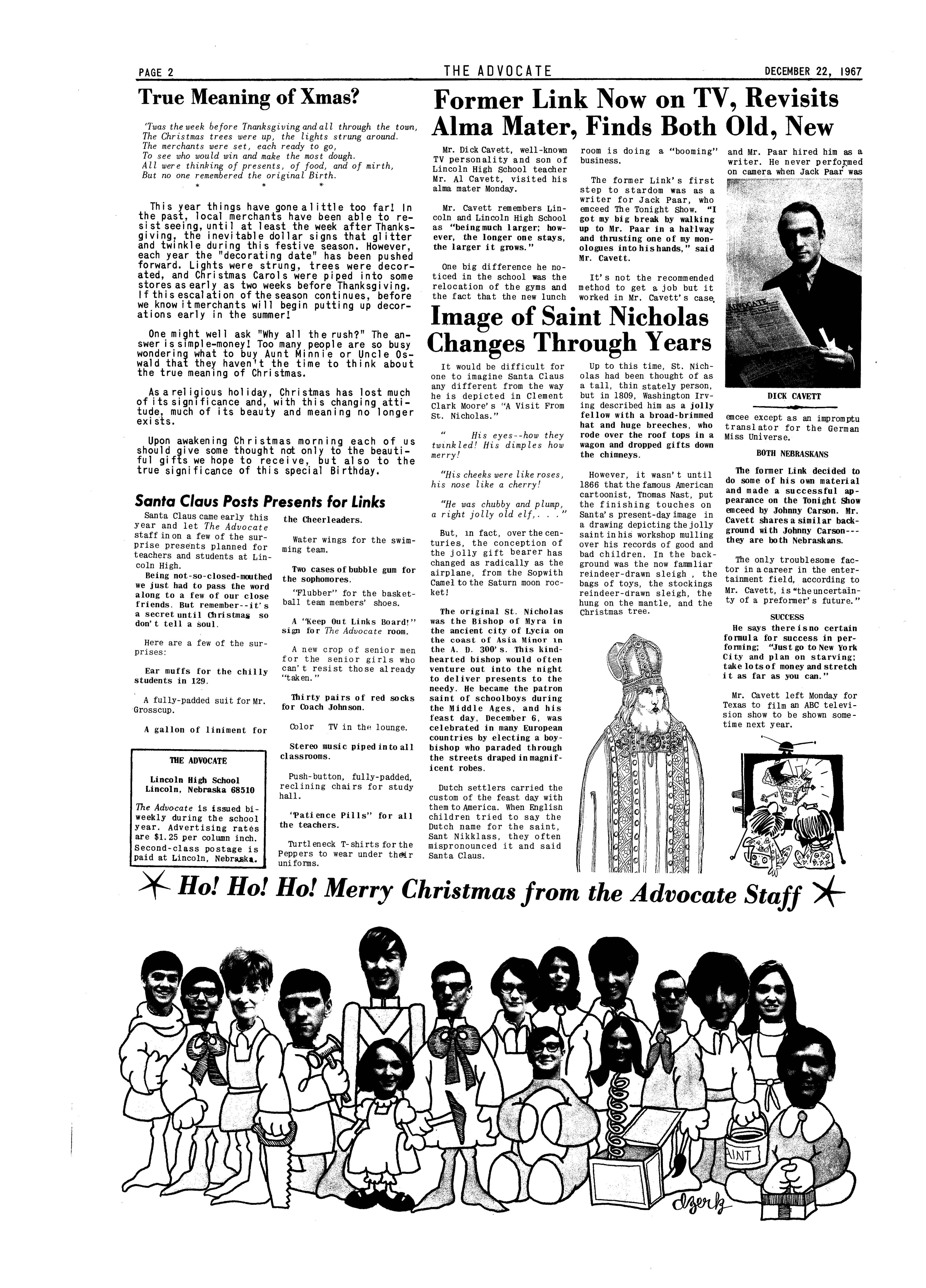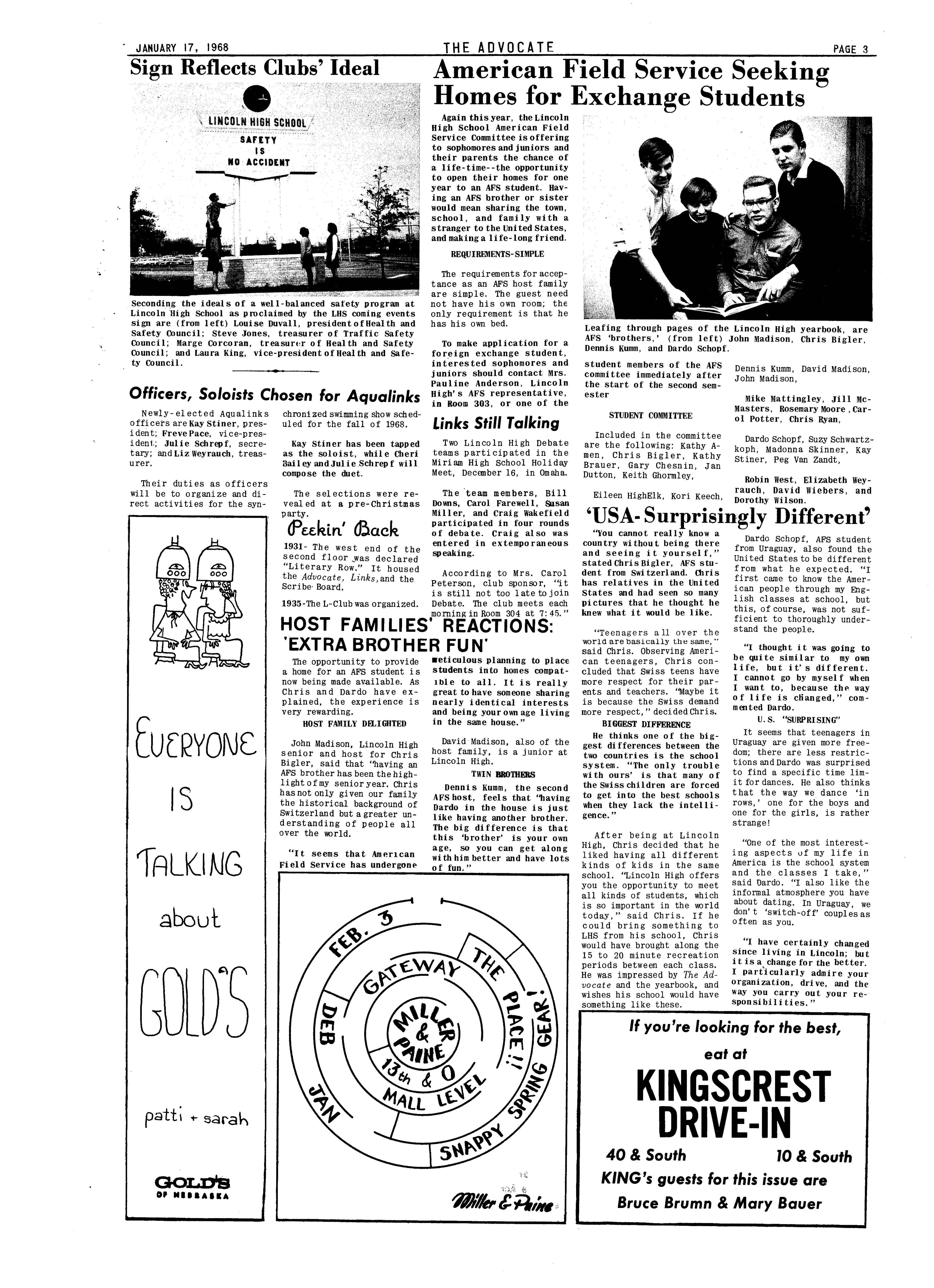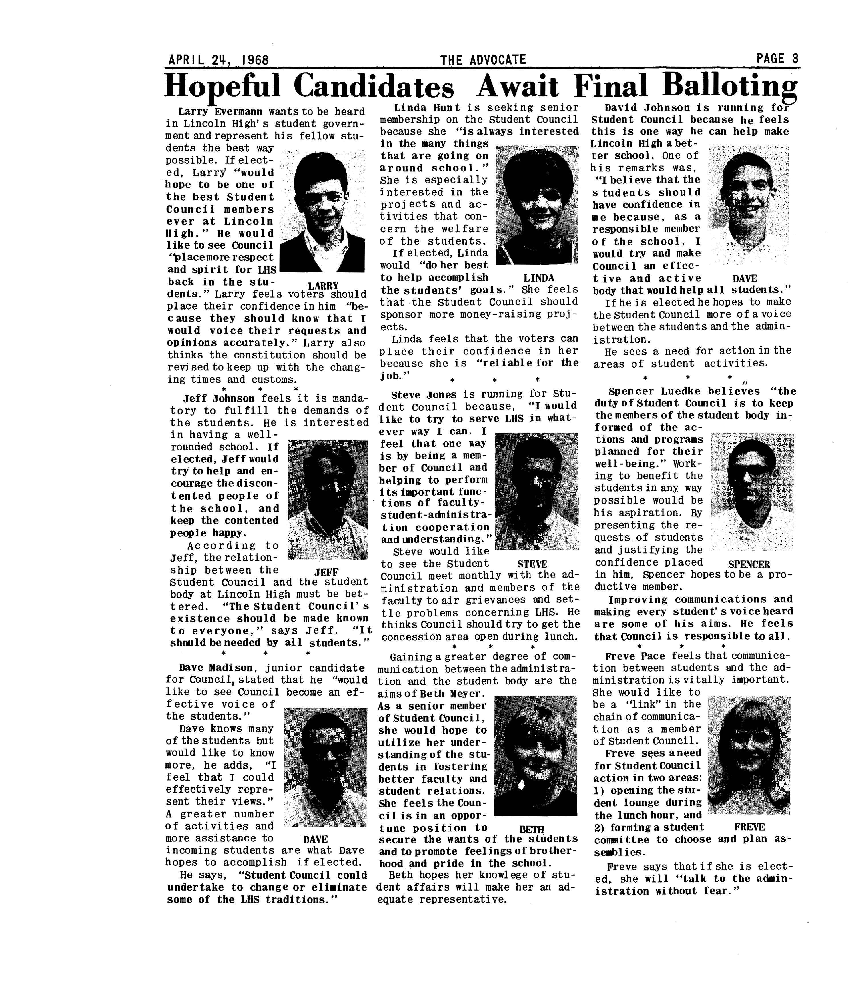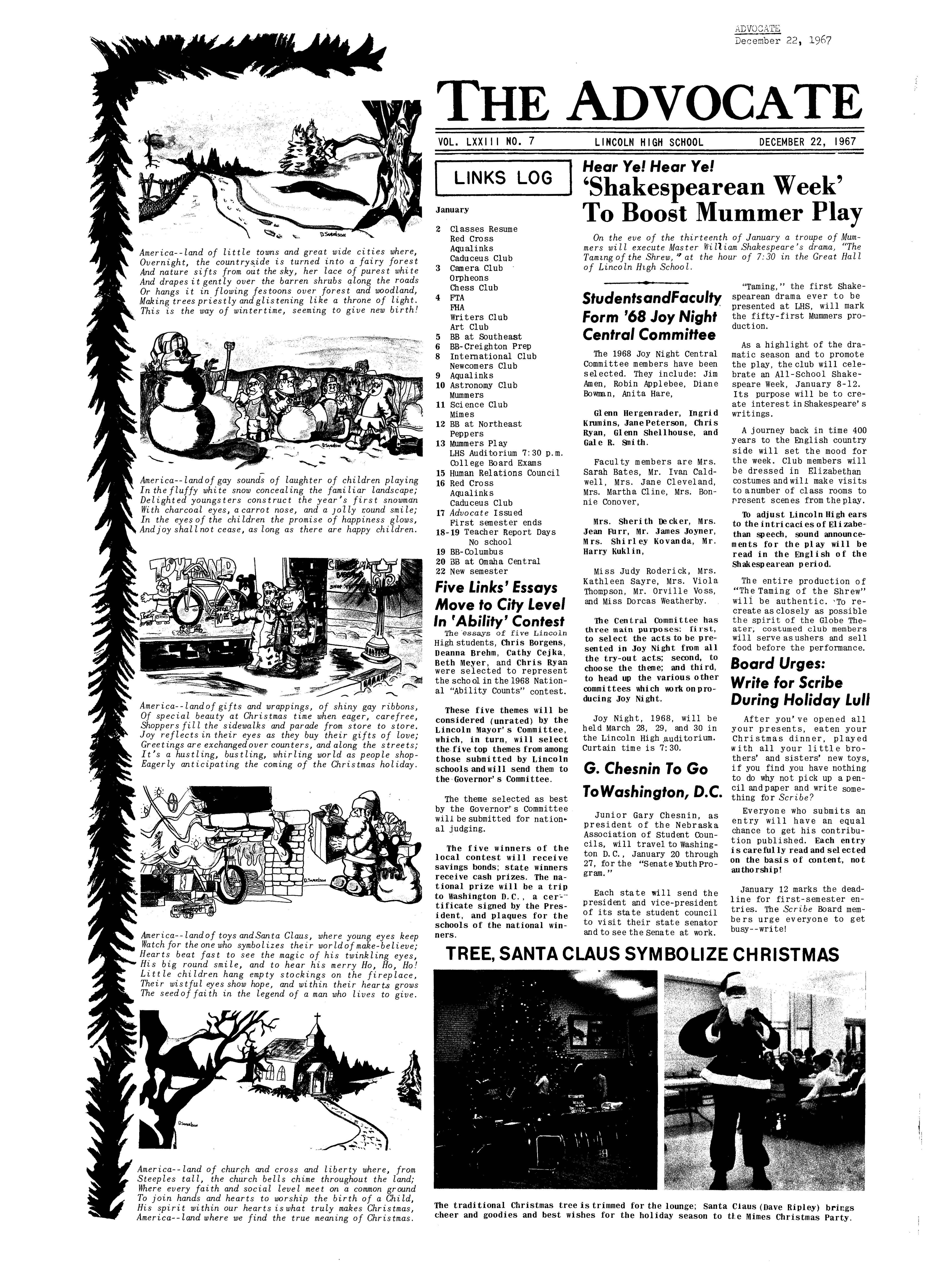 The Advocate is published by students of Lincoln High School bi-weekly during the school year except immediately following vacations. It is issued without cost to every Lincoln High student. Advertising rates are $1.25 per column inch.