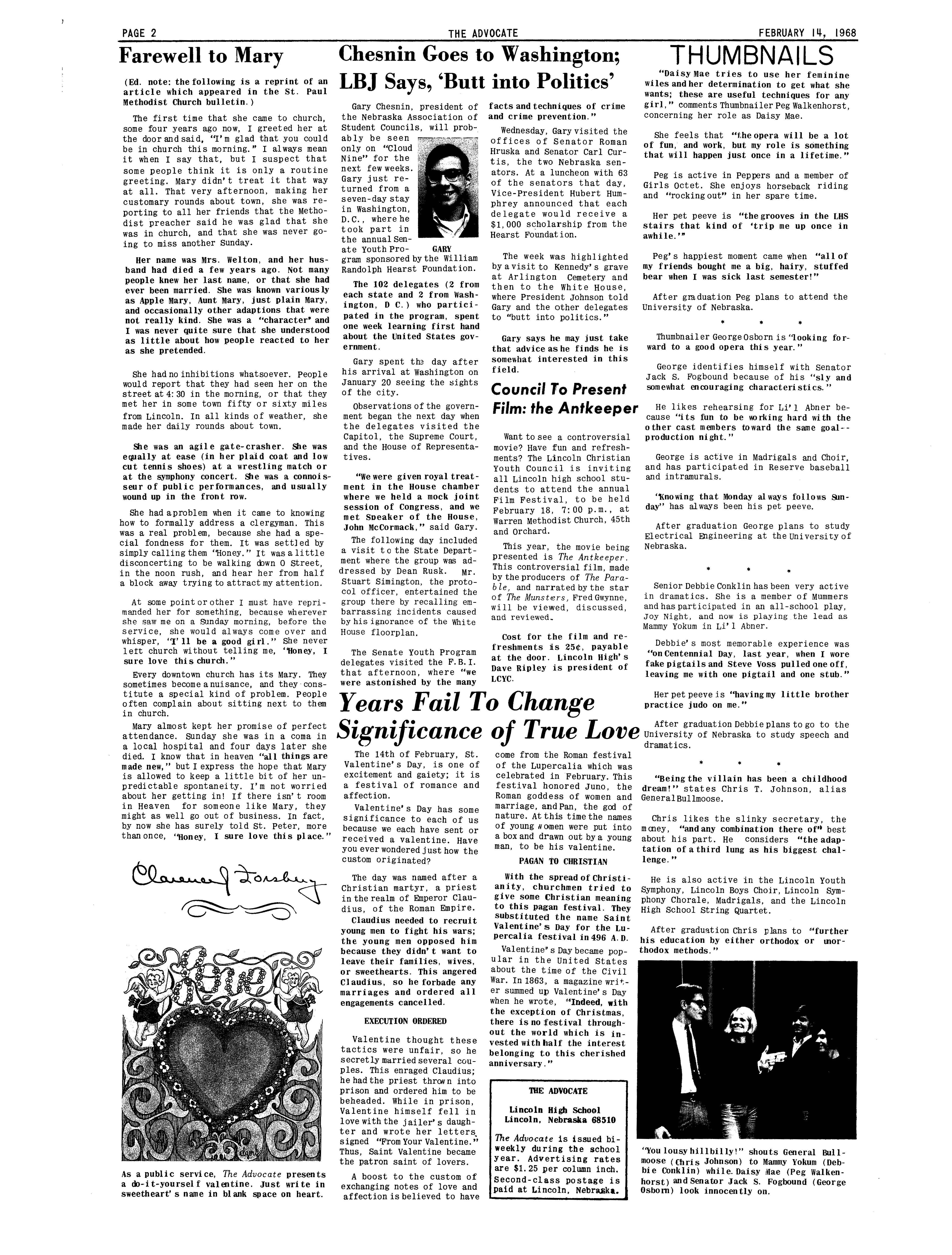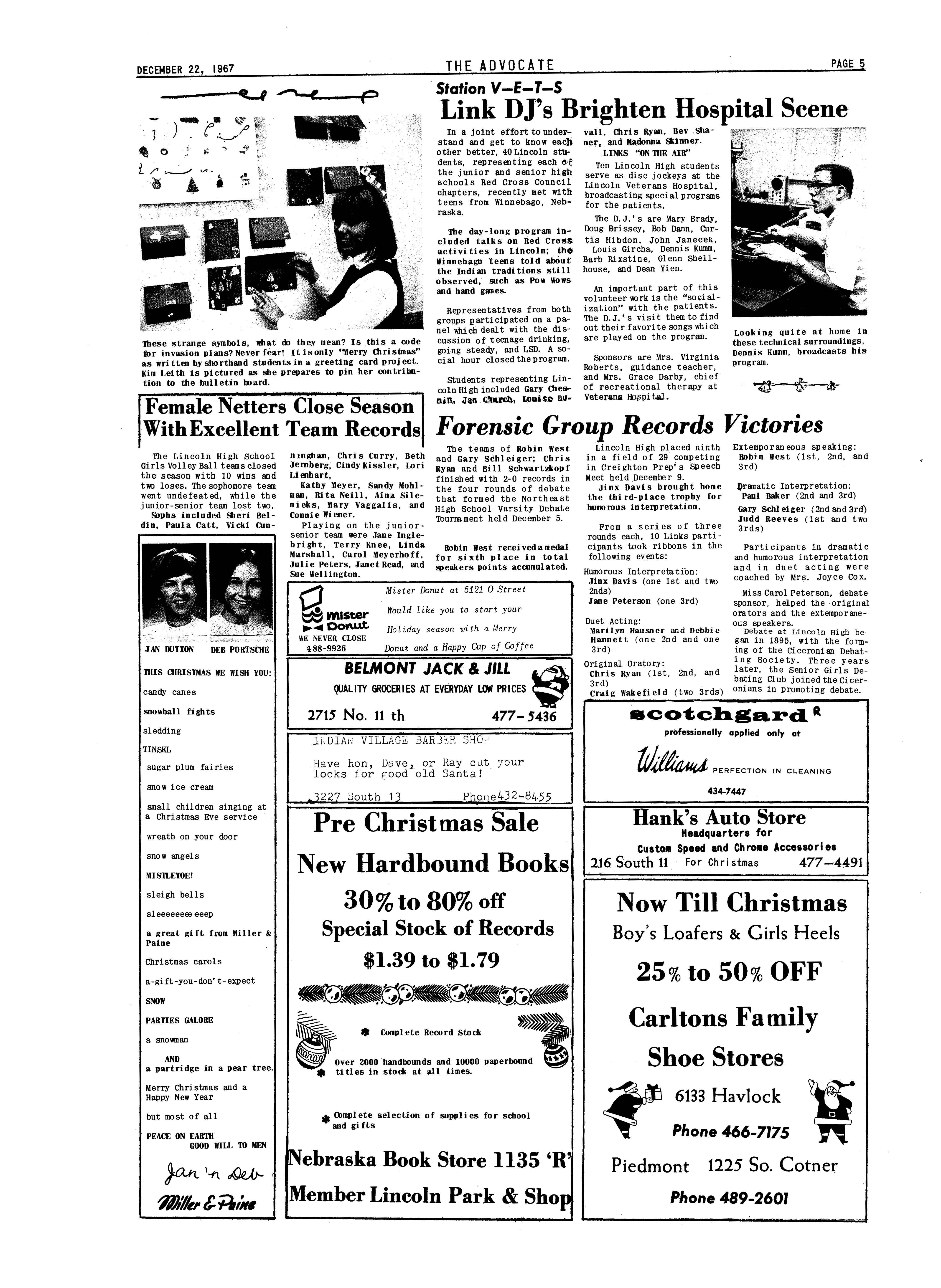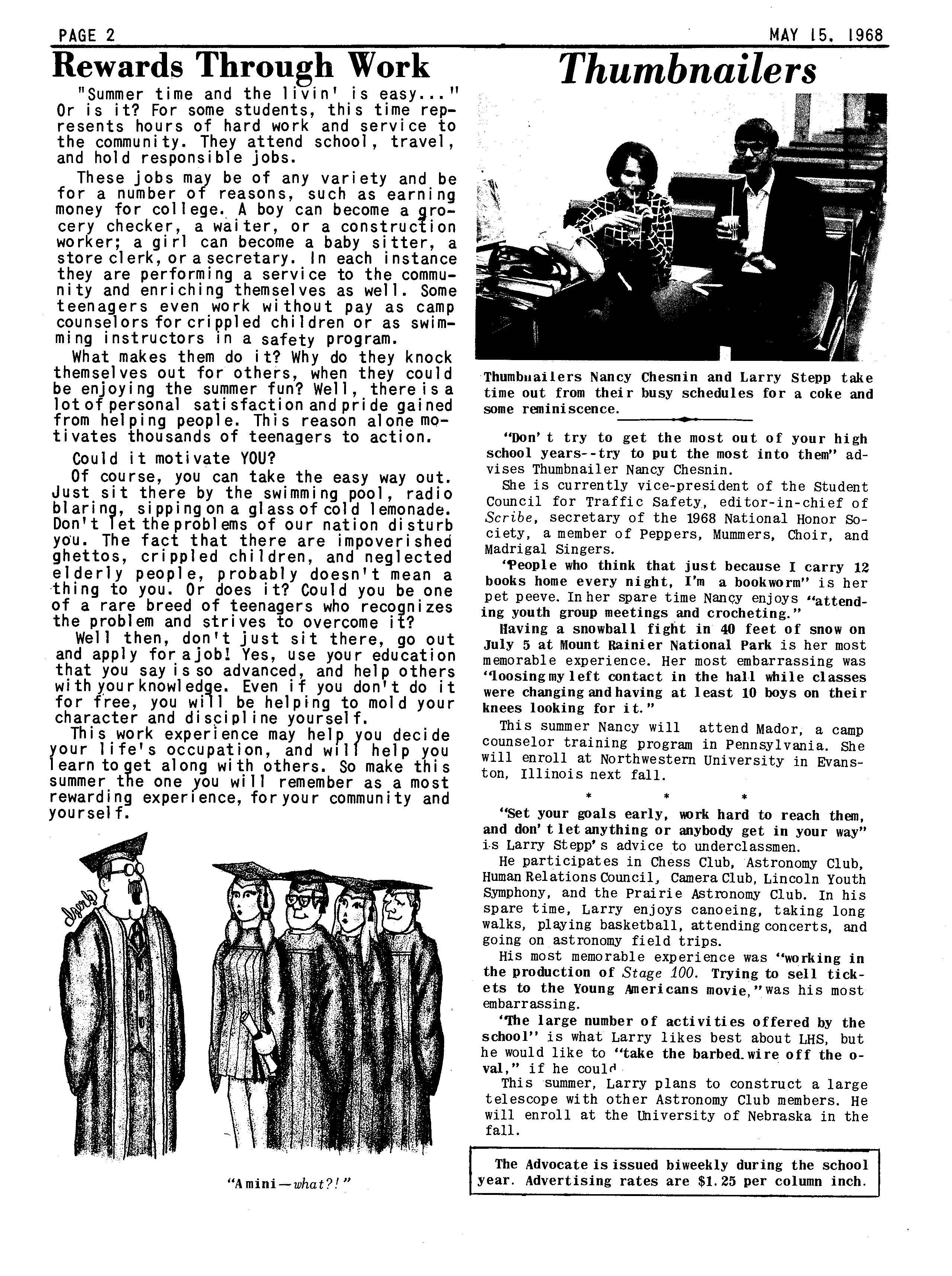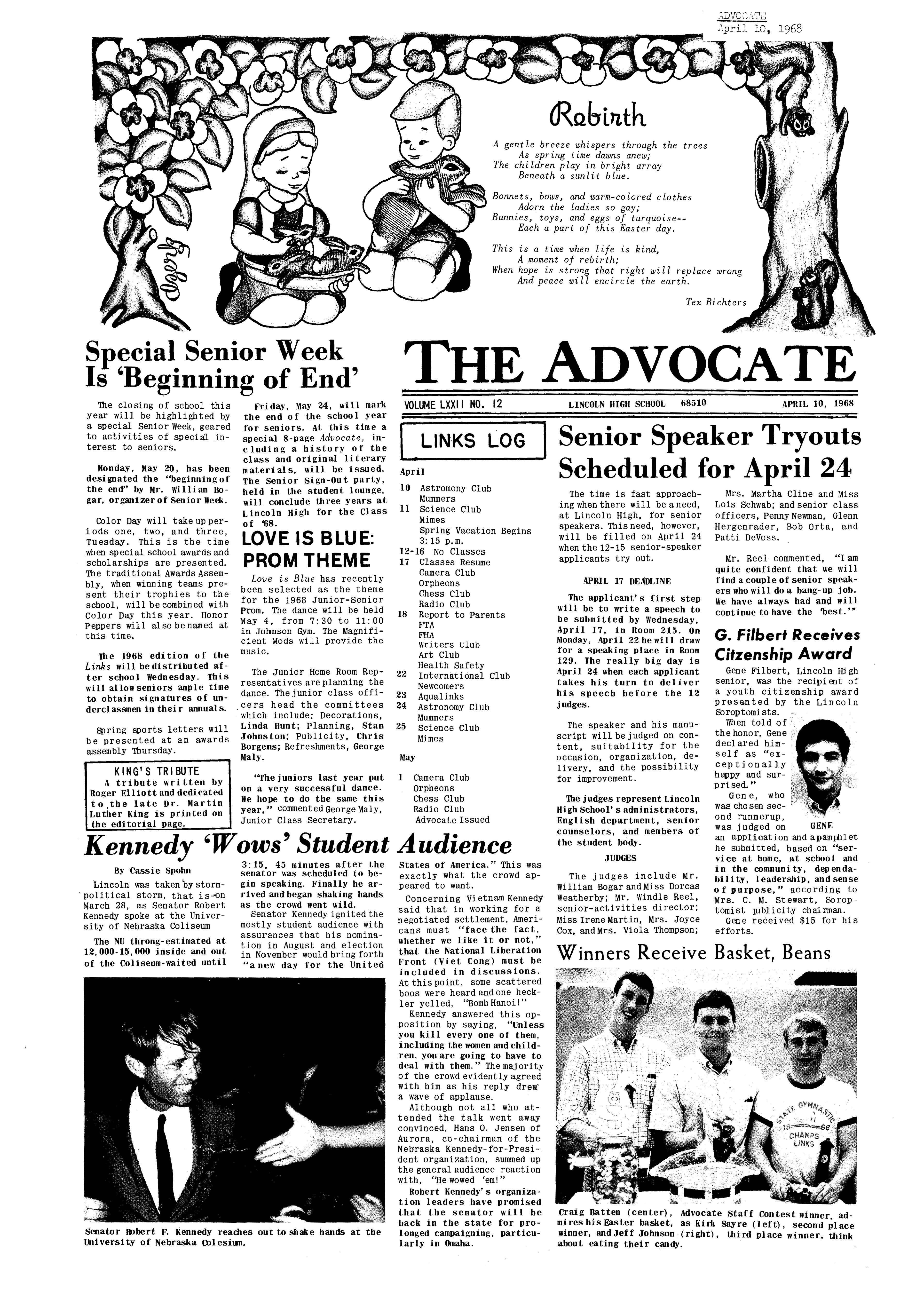The Advocate is published by students of Lincoln High School bi-weekly during the school year except immediately following vacations. It is issued without cost to every Lincoln High student. Advertising rates are $1.25 per column inch.