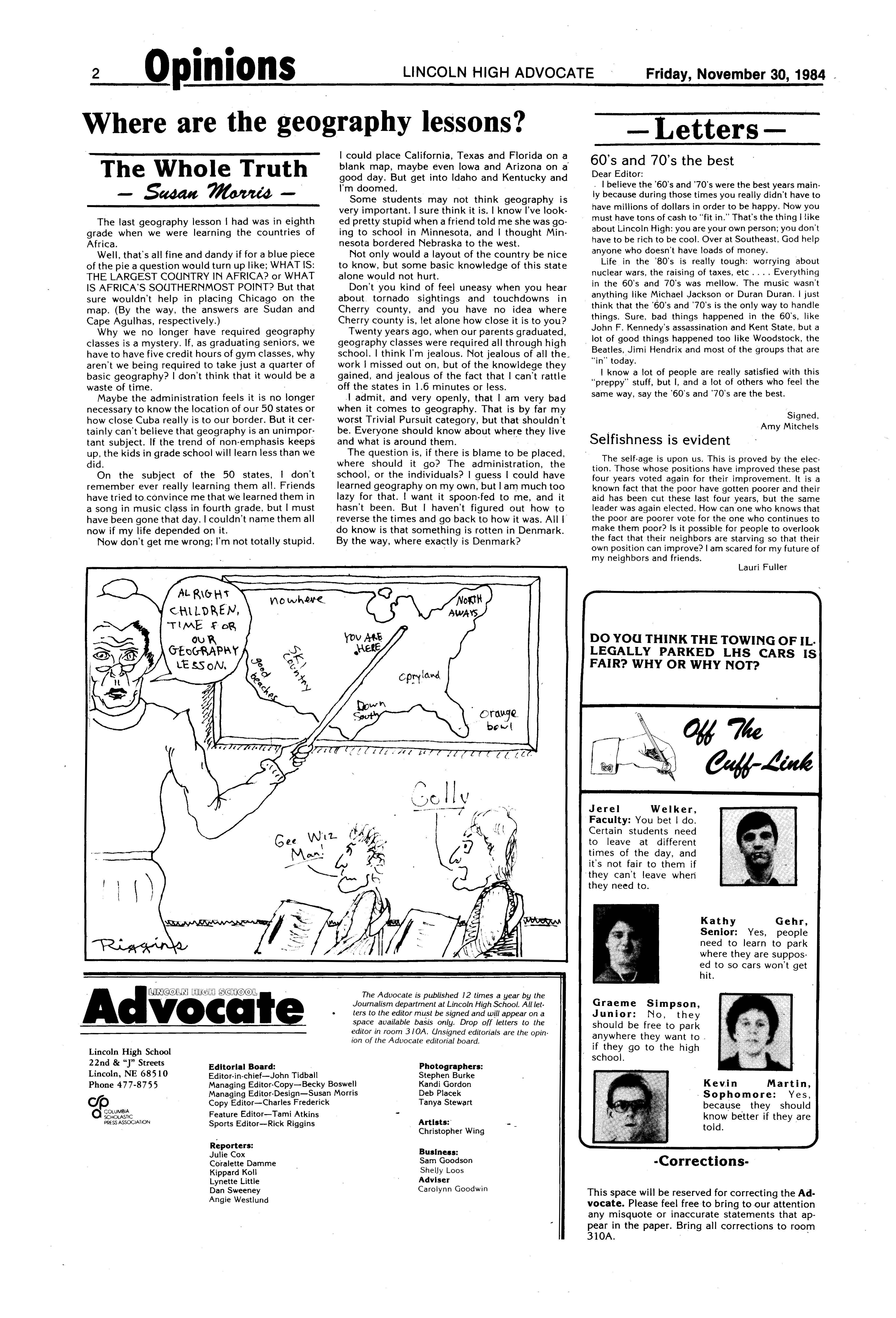 The '84-85 Advocate staff welcomes all LHS students and faculty to the new school year. Thank you for taking the time and effort to read our paper. We hope to be of service to the students and community of LHS, in this~ the Advocate's 90th year.