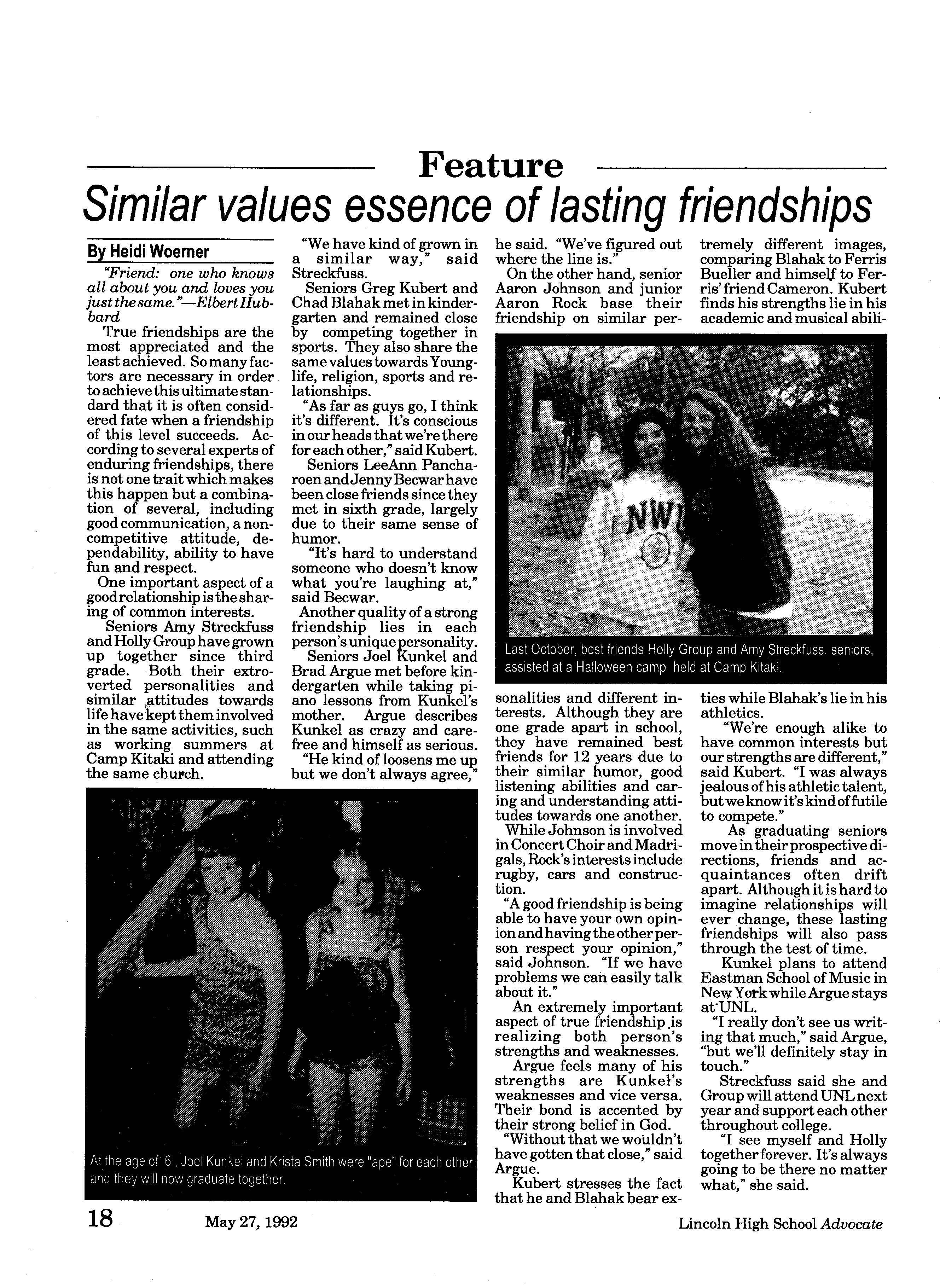 Seniors Amy Streckfuss and Holly Group have grown up together since third grade. Both their extroverted personalities and similar .attitudes towards life have kept them involved in the same activities, such as working summers at Camp Kitaki and attending the same chUPch.