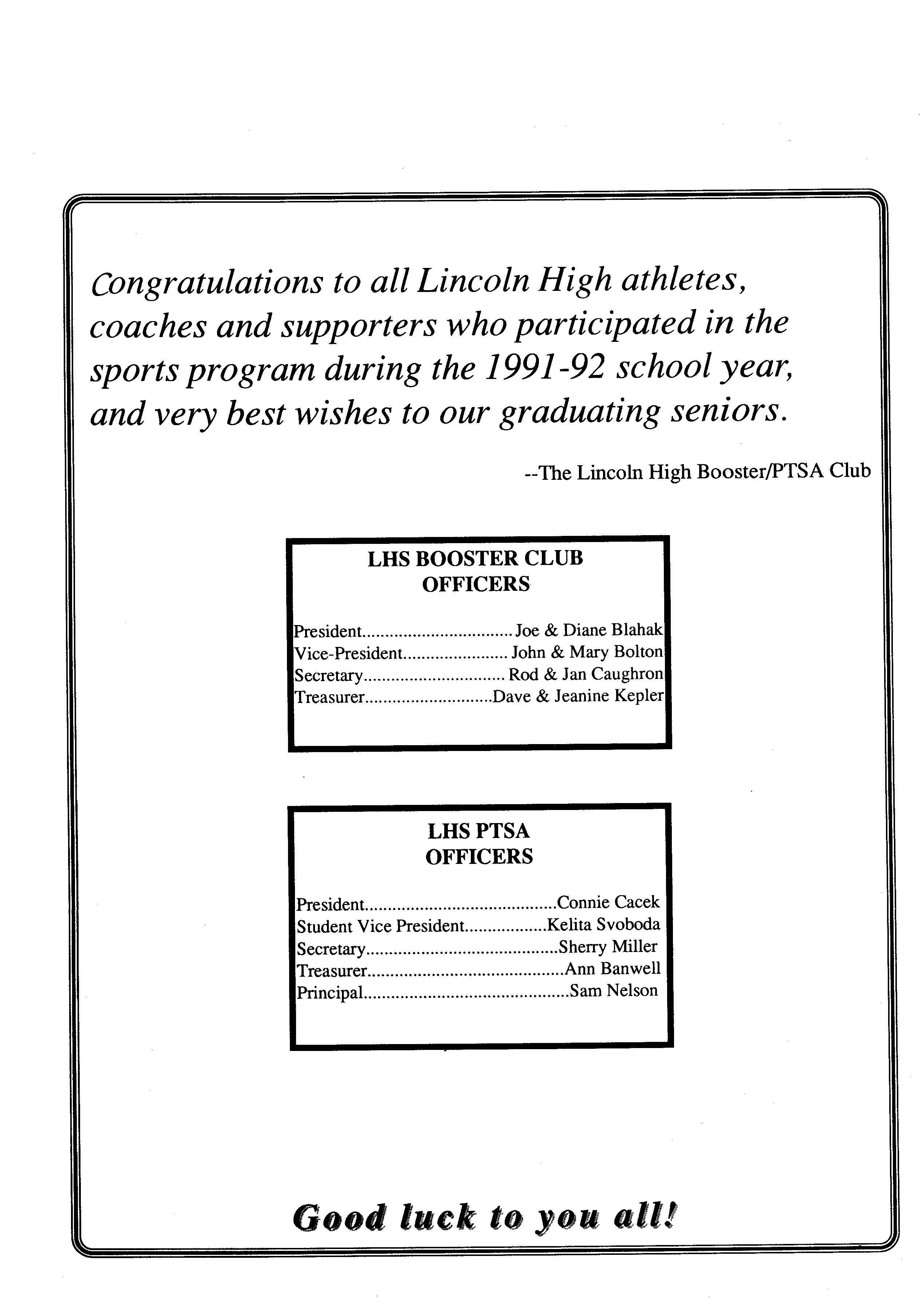 For Geoff Friesen, Kelly Ward, Hugh Lau, Tiffany Davis, Bobby Ferrel and Jennifer Trouba, it took years of dedication and motivation to accomplish what they have so far. They came to a concensus that it is important to rememberthat sports scholarships aren't the only grain that can be reaped from participation in athletics throughout their lives. They have brought along with them many skills and traits that have built and revealed their characters. And for this, these athletes want to thank the coaching staff at LHS for their instruction, encouragement, criticism and friendship.