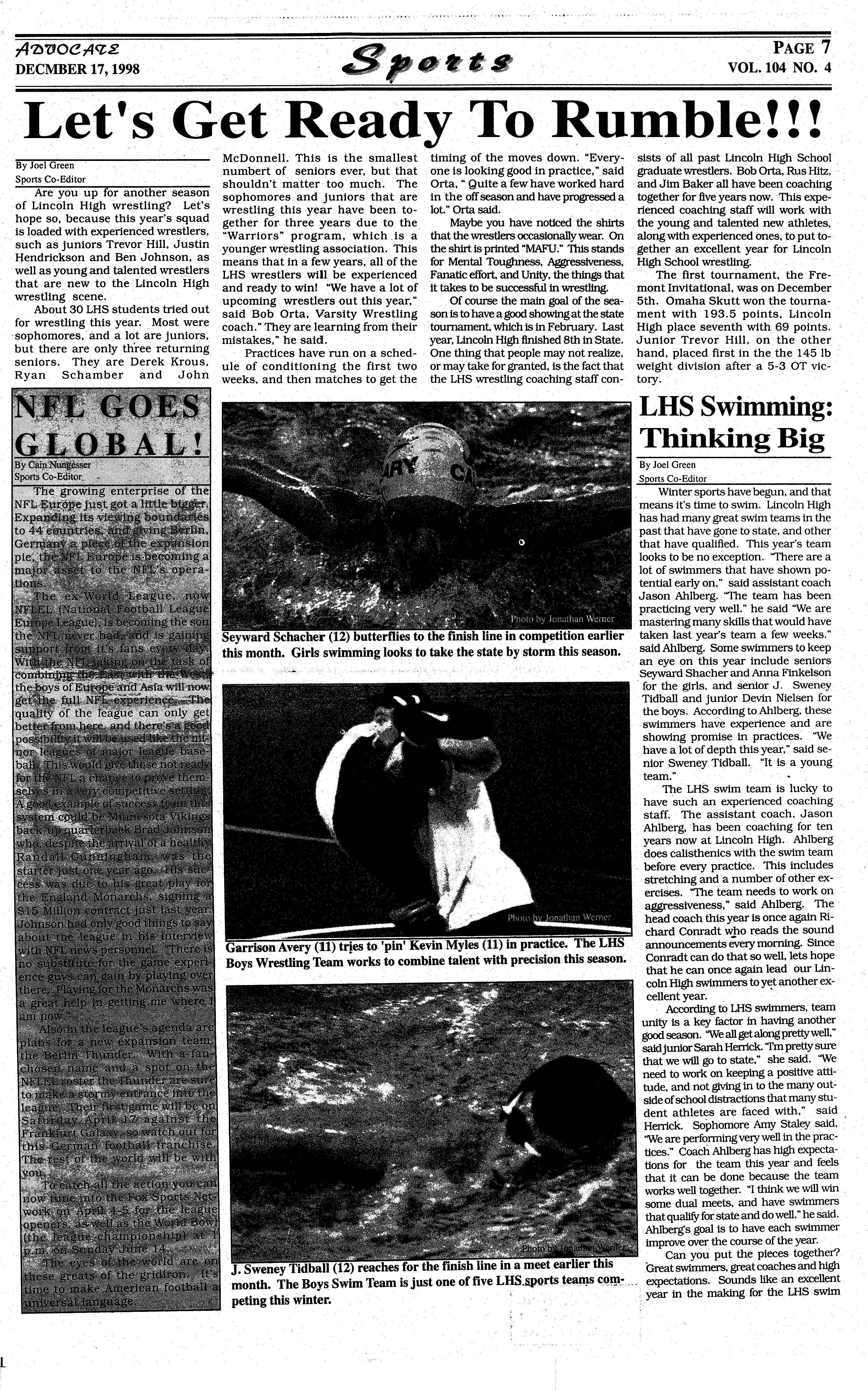 Colleen Lecher coaches the each. season," said senior fortysornethirtg girls involved Victor Olguin of his particiin track. and field, and Bob pation in thP. 4 X 1 relay. White co~ches the On Thursday, May 13, fiftysomething boys. Sports is 1999 another one of th.ose not unlike theatrical perfor- · days where parking is scarce · mances in that having an au- and the piles of warmup dience, or in this case some gear are impressively huge, competition, improves both Lincoln High hosted the disspirit and perfor111ancetenfold. trtct track and field compeThat is not to say that flubbing ·titi<>ns. The afternoon was up some technical aspects of eventful, and. our campus running a relay won't be po- was crawling with people. As tential pitfalls, but coaches, as- far as boys making their way sistants, and trainers have to the state championships, been there to know that on for pole vault it's Luke some days the sun just doesn't Harrington, high jumper shine on shotput. extraordinare is senior Chris The most important part of Payne, 3200 relay's repredoing anything, whether it be sentative is junior Ben giving a speech or jumping six Johnson, the 110 high feet in the air, is being pre- hurdles and 300 intermedipared. "To be prepared for ate .hurdles winner is Luke track we run· 4-6 miles, six · Harrington. Girls winners days a week, before the season are freshman Megan starts," said junior middle dis- Harrington for pole vault,. setance runner Matt Neukirch of nior Lisa Hassebroek for himself and the five guys he· shotput, ·and sophomore trains with. So what of this ·.Kirn •·McCray · for 100 · ·. hard work, this remarkable hurdles.. •