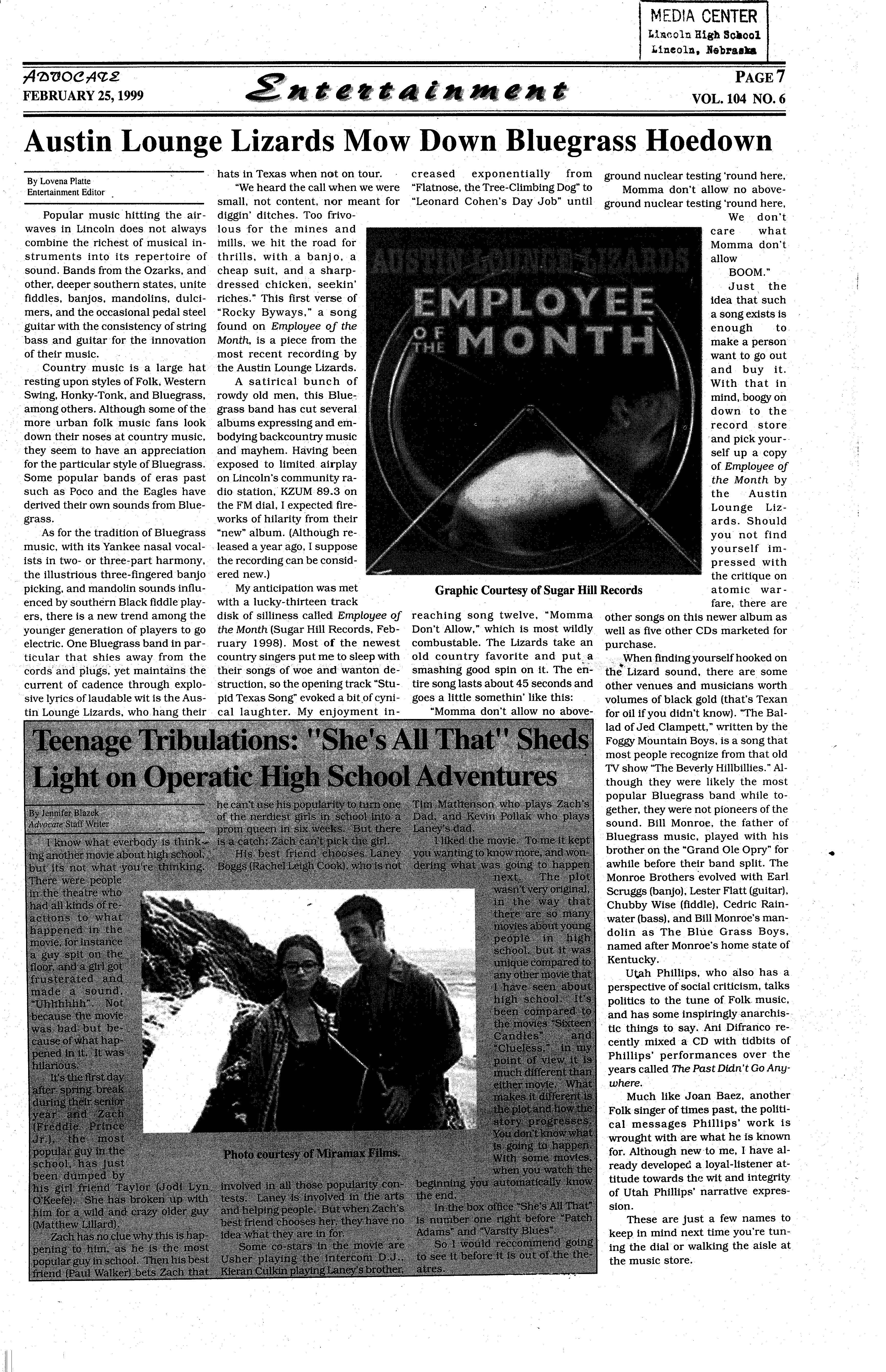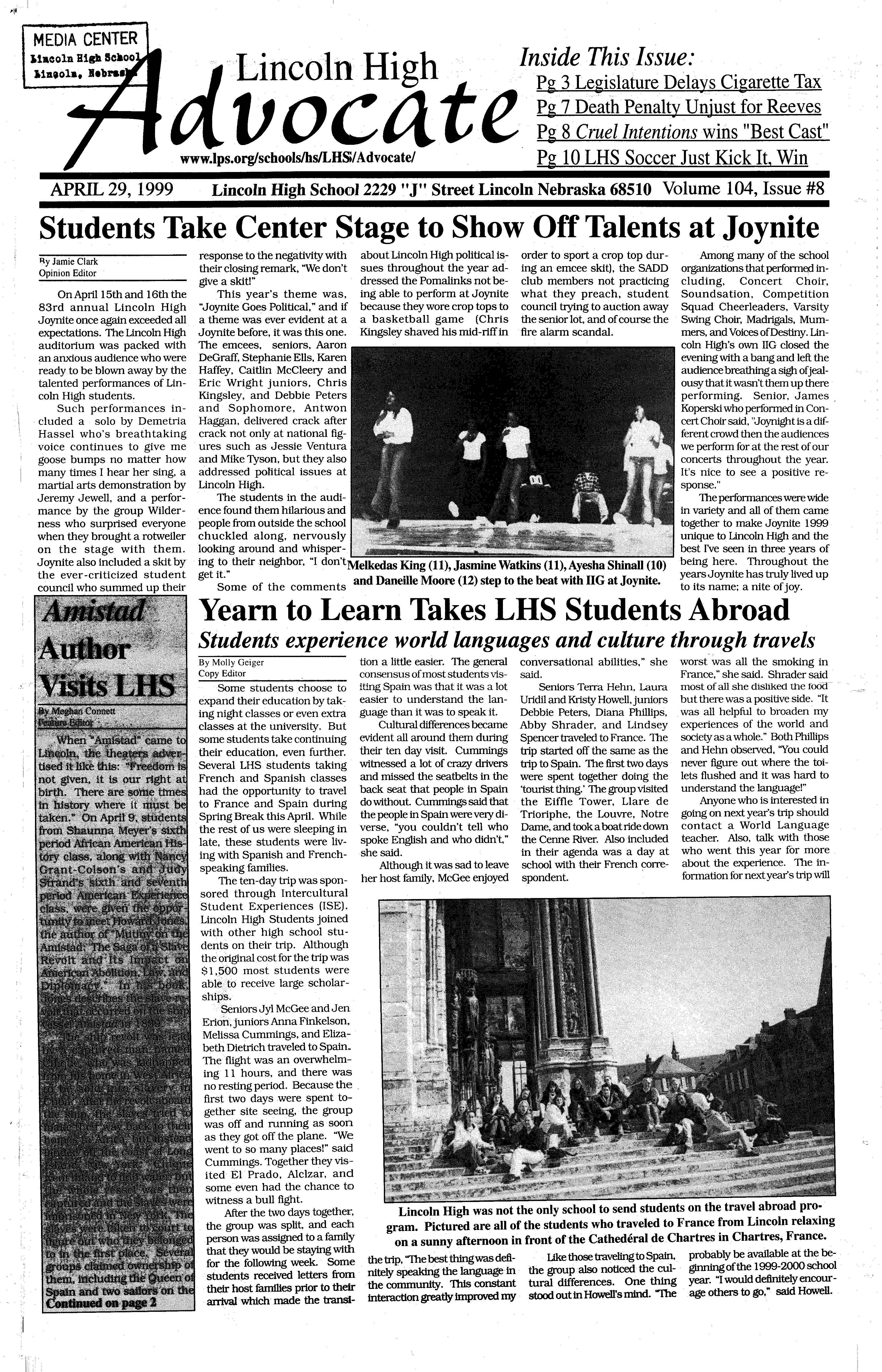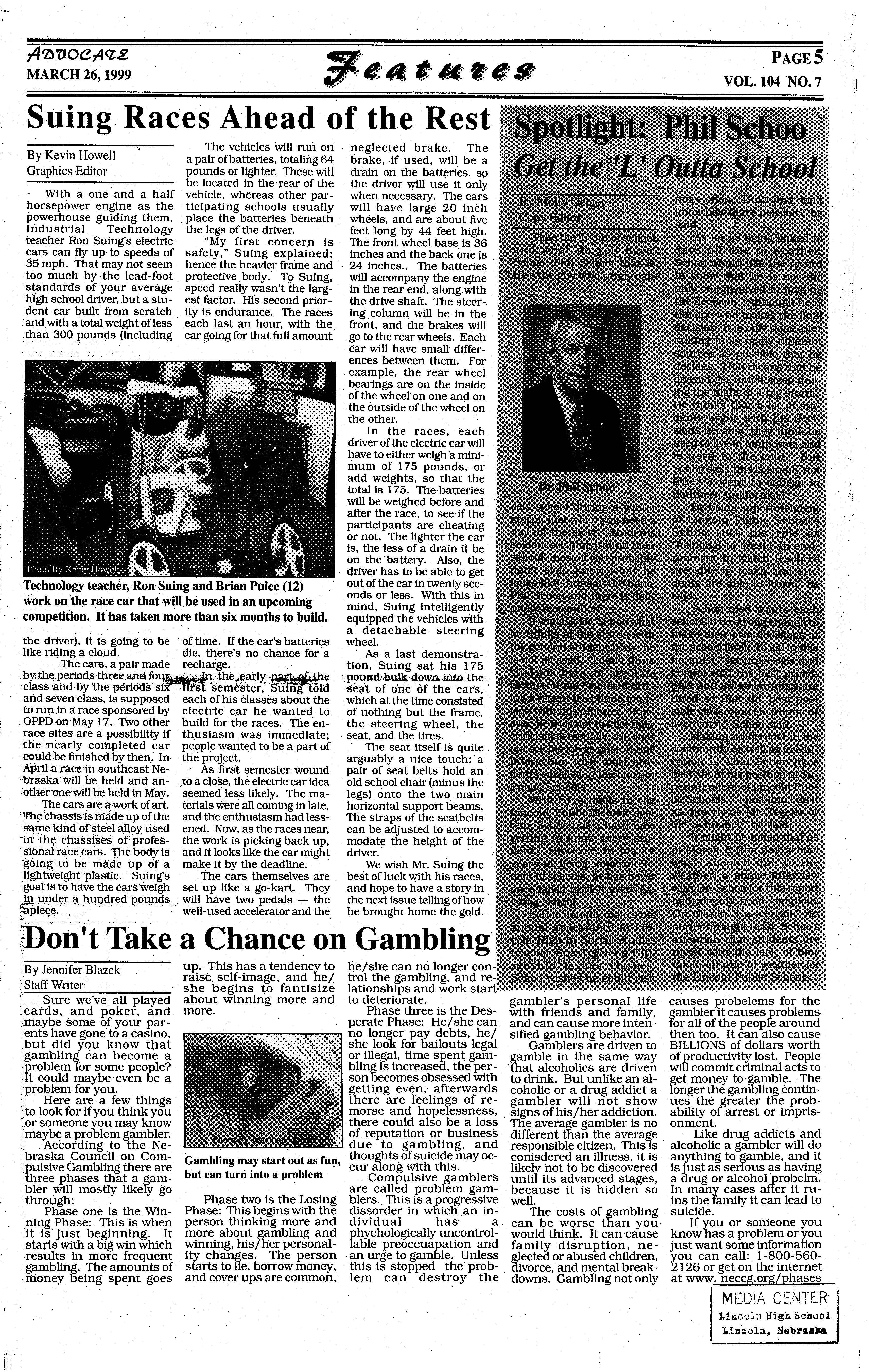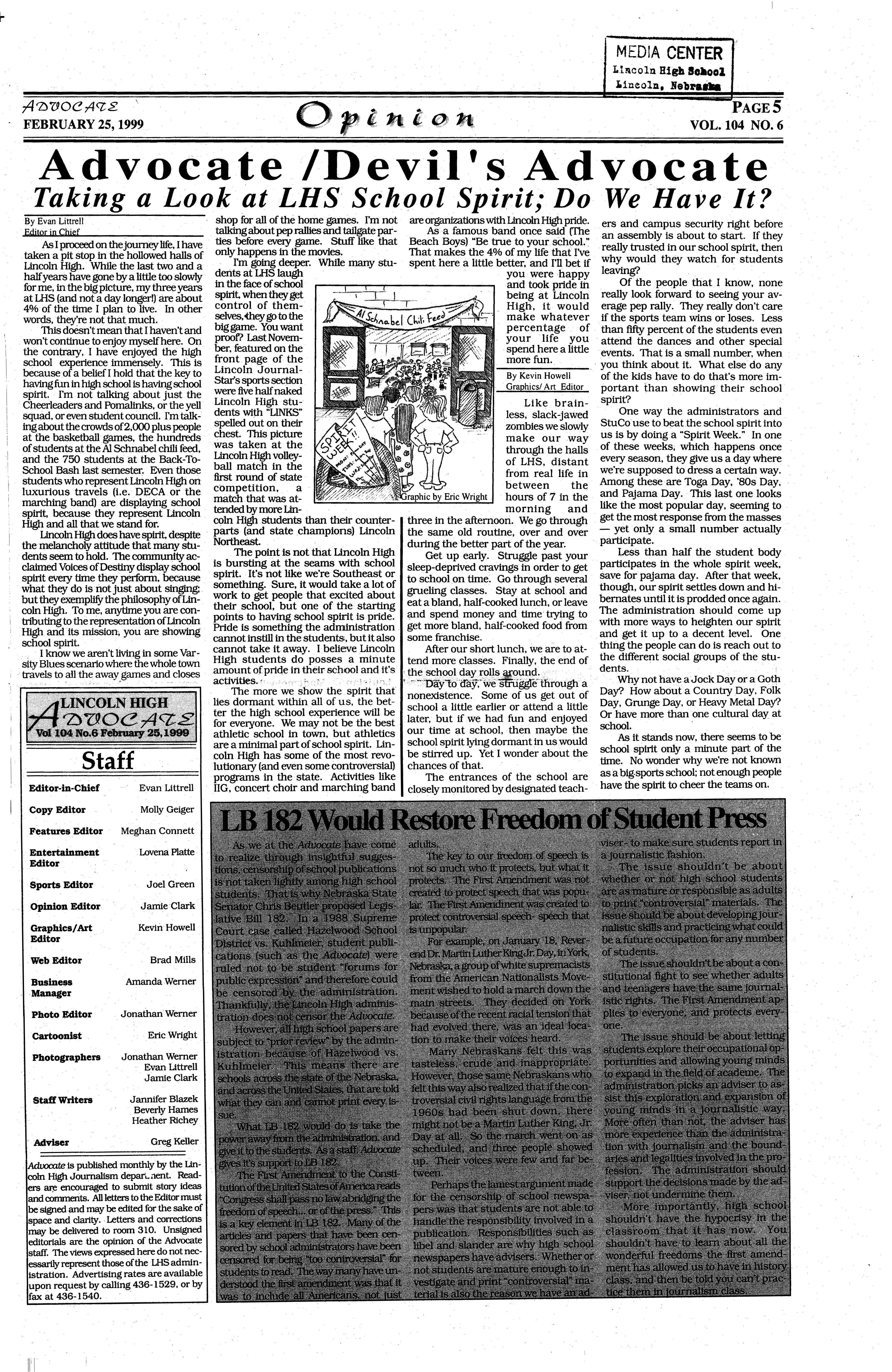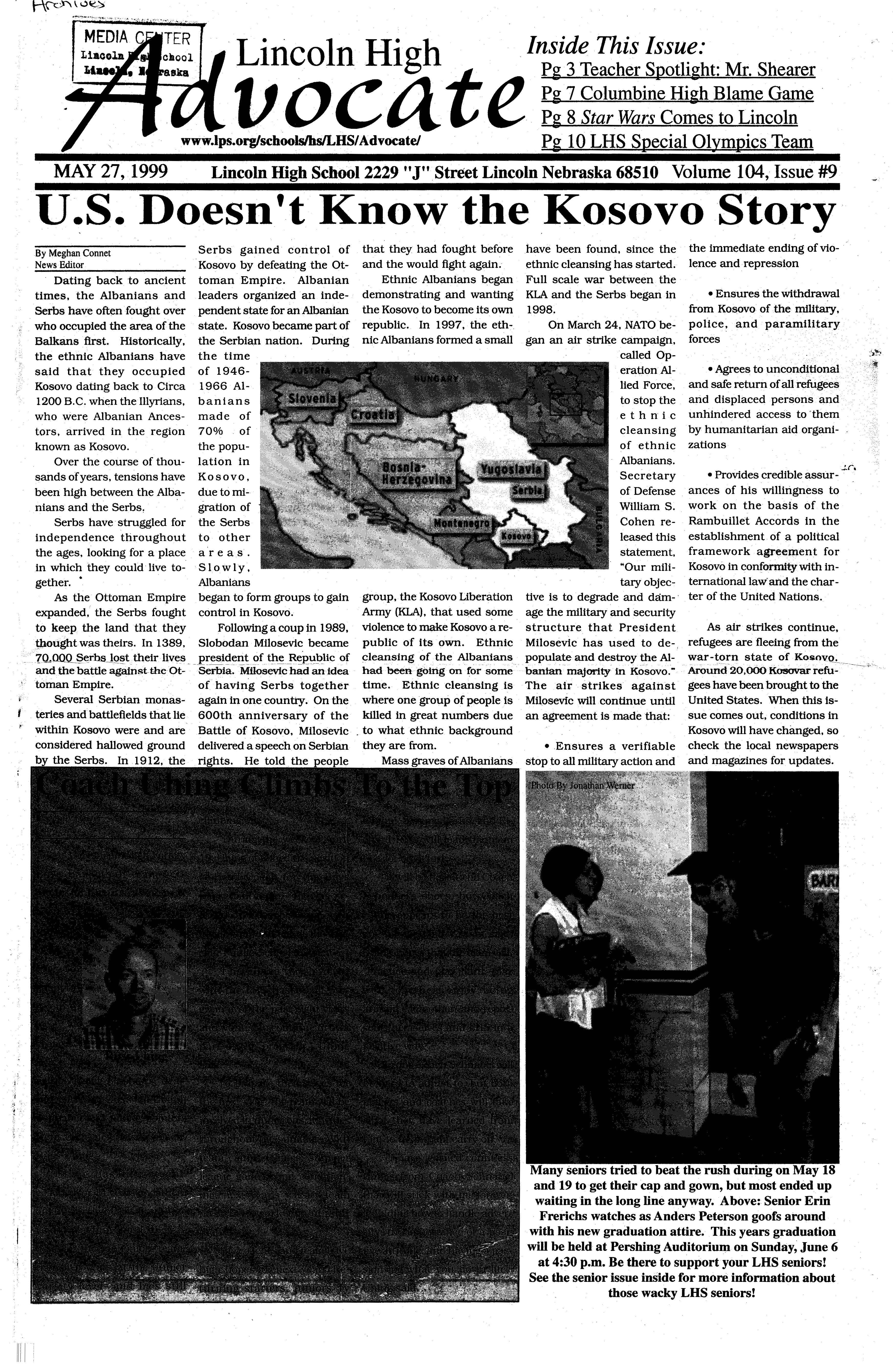 As a member of the military involvement in Lincoln High Paparazzi, I airstrikes against Serbian am to remain objective in president Slobodan every story I write. This ··Milosevichas carriedon for being the last issue of Advo- almosttwo monthsnow,and cate I will ever write in shows no signs of stopping (weep), I feel it is time to anytime soon. This is berelease myself from the cause the war in the former chains of ethical obligation Yugoslaviahas been occurto only report the news. I ring for the last thousand am going to do something years, and will continue for that almost every teacher the next thousand years andstudentinLHSandhigh whether the U.S. gets inschools abroad fears I am ·volved or not. A prediction going to think for myself for the future? US involveand write about it! Okay,so ment in this conflictwill end · all I'm really going to do is up like Vietnam; the U.S. criticizecertainnews stories will lose, and nobody will over the last year and maybe gain. But hey, at least we even how they've been re- shot up Milosevic's palace! ported,butlcancallitthink-