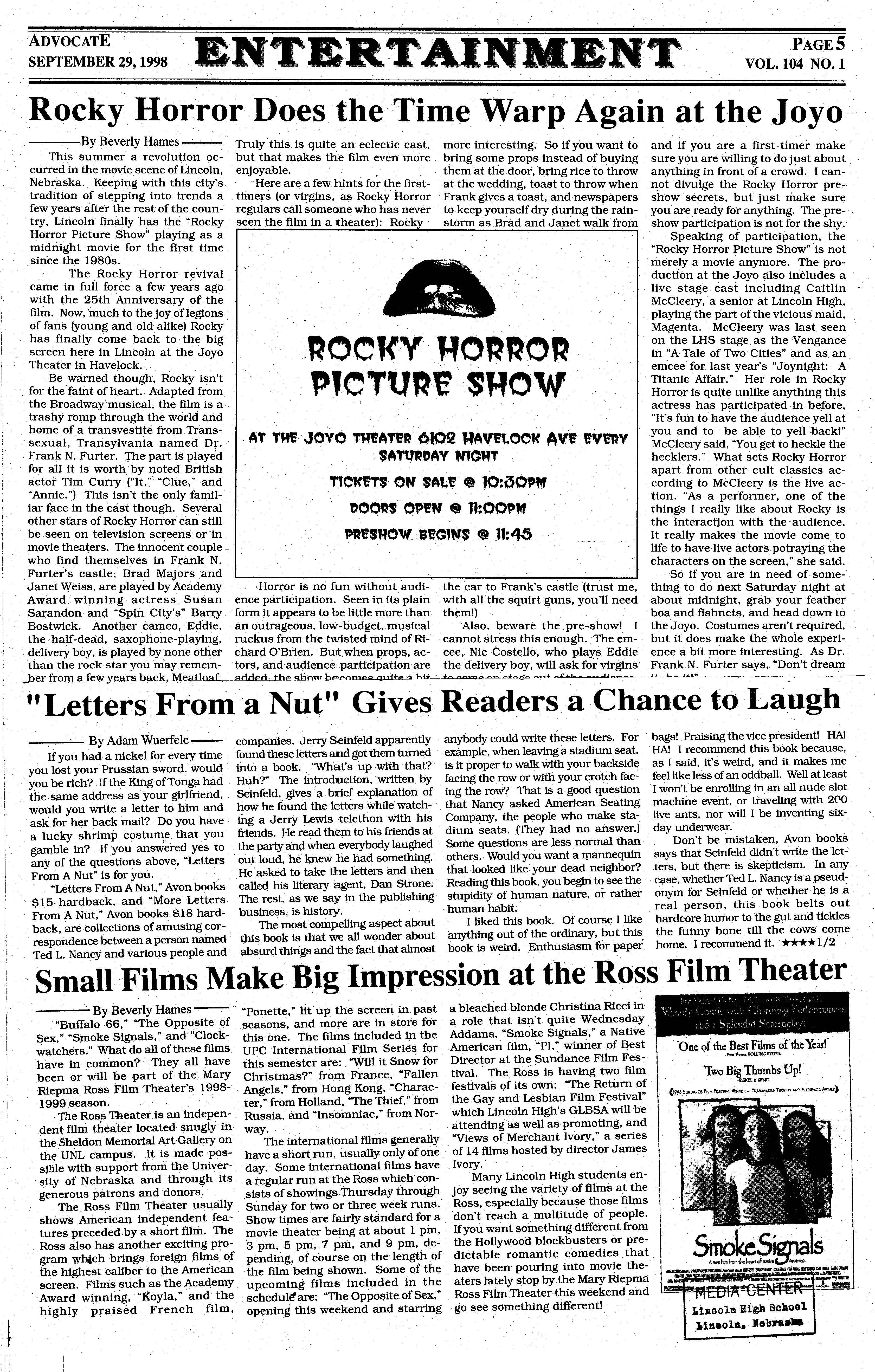 ----By Beverly Harnes - Truly this is quite an eclectic cast, ' This summer a re·volu-tion oc- b t th ak - more intereS t ing. So if you want to and if you are a first-timer makeu at m - es the film even more b · g · d f curred in the movie scene of Lincoln enjoyable.· - -rin some props InS t ea O buying sure you are willing to do just about Nebraska. Keeping with this city's' H , · th em at th e door, bring rice to throw anything in front of a crowd. I can- ere are a 1ew hints for the first- at the wedding, toast to throw when t d 1 - tradition of stepping into trends a timers (or •r__gins_, as Rocky- Horro-r no ivu ge the Rocky Horror pre- ' ·r Frank_ gives a toast, and newspapers show ·secrets b t· · t · k iew years a ter the rest of the coun- regulars call someone who has never , u JUS - ma e sure try, Lincoln final_ly has th_e "Rocky_ th r1 - h