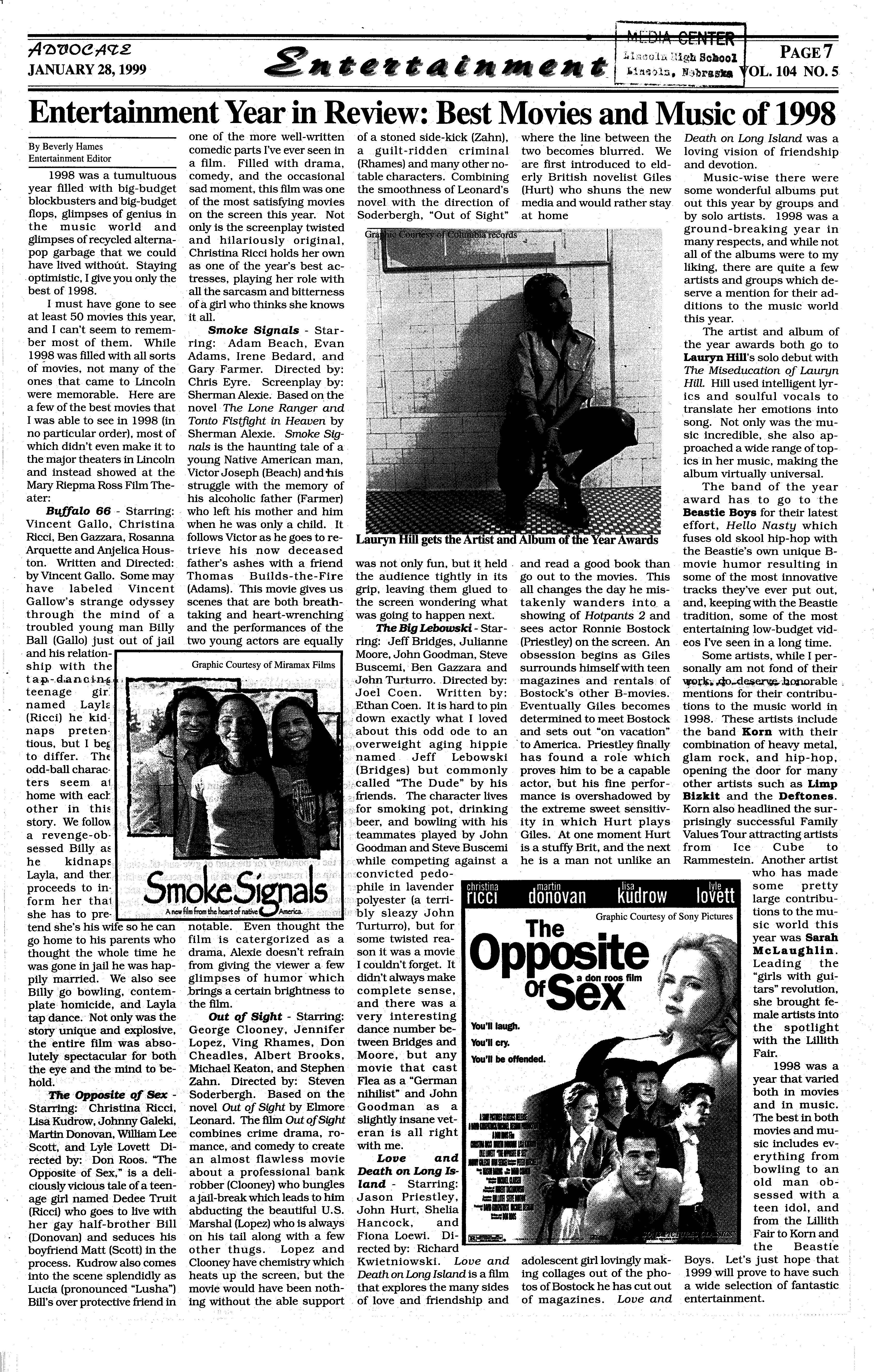Finally, the most ing for myself if I want to. over-reported story of the I feel it intrinsicto be- year... the MonicaLewinsky gin with the most wrongly scandal. Oh, and that imreported story, and oddly peachment thing. This enough the most recent, of hopefully, will go down in the year: the Littleton,Colo- history as the biggest piece rado high school shooting. of Republican propaganda Not only was the headline to ever hit Washington. blazed across the front page Moreover, President Willof the worldfamousLincoln· · iam Jefferson Clinton will Journal Star "25 Dead" go down in history as one wrong (authoritiesdid a re~ of the most publicized count and found 13), but the events ever. Although he is storiesprinted subsequently not the first president ever were inaccurateas well. The to be impeachedin office,he hearsay involved, like "it is the first to ever be acquitwas said that Klebold's ted while still in office. mother felt," and "the com- That's something to be remunityfeels the parentsare" memberedfor.
