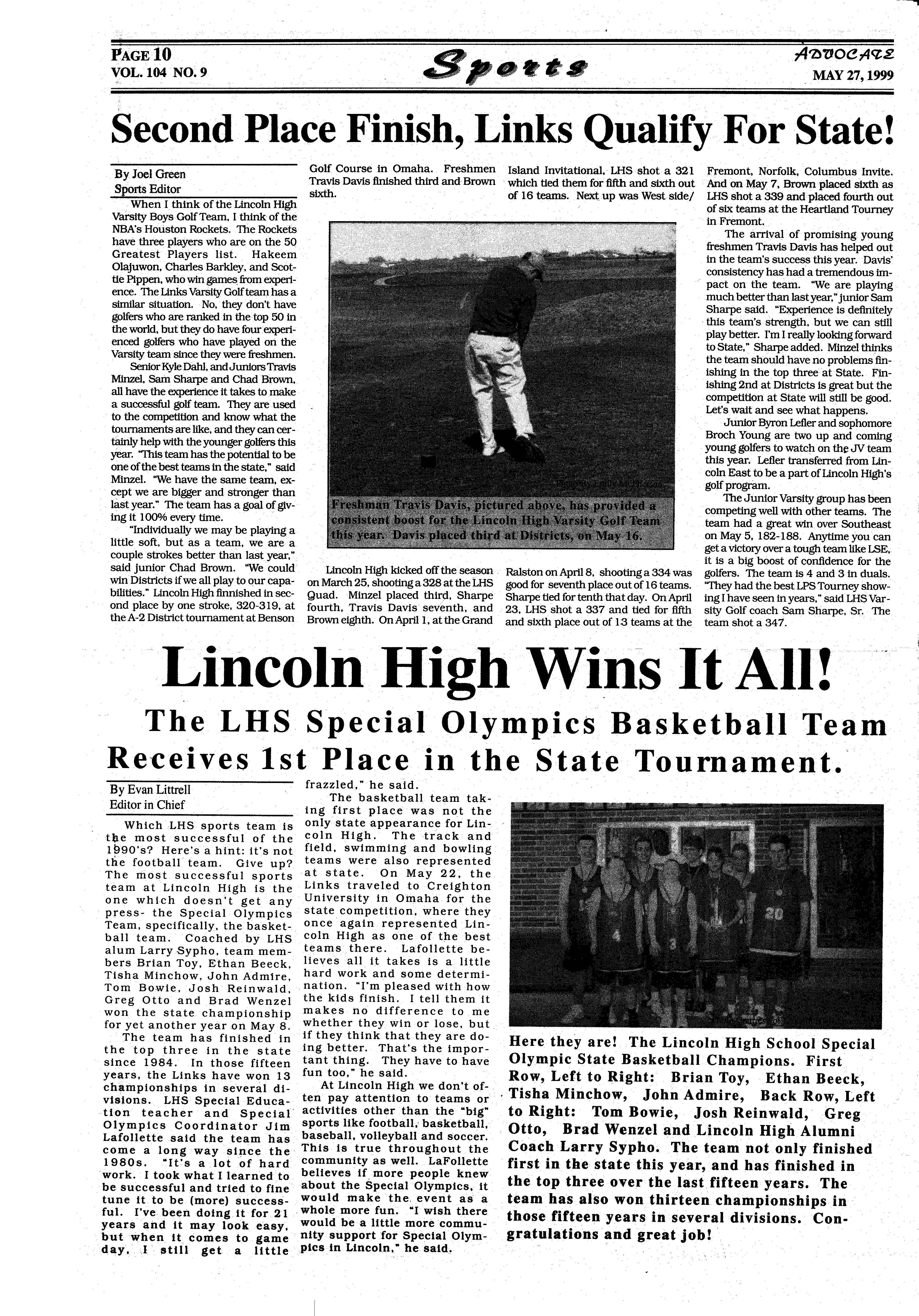 Which LHS sports team is only state appearance for Lintb,e most successful of the eoln High. The track and I 990's? Here's a hint: it's not field, swimming and bowling the football team. Give up? teams were also represented The most successful sports at state. On May 22, the team at Lincoln High is the Links traveled to Creighton one which doesn't get any· University in Omaha for the press- the Special Olympics state competition, where they Team, specifically, the basket- once· again represented Linball team. Coached. by LH.S coln High as one of the best alum Larry Sypho, team mem- teams there. Lafollette bebers Brian Toy, Ethan Beeck, lieves all it takes is a little Tisha Minchow, John Admire, hard work and some determiTom Bo.wie, Josh Reinwald, nation. "I'm pleased with how Greg Otto and Brad Wenzel the kids finish. I tell them it won the state championship makes no difference to. me for yet another year on May 8. whether they win or lose, but.