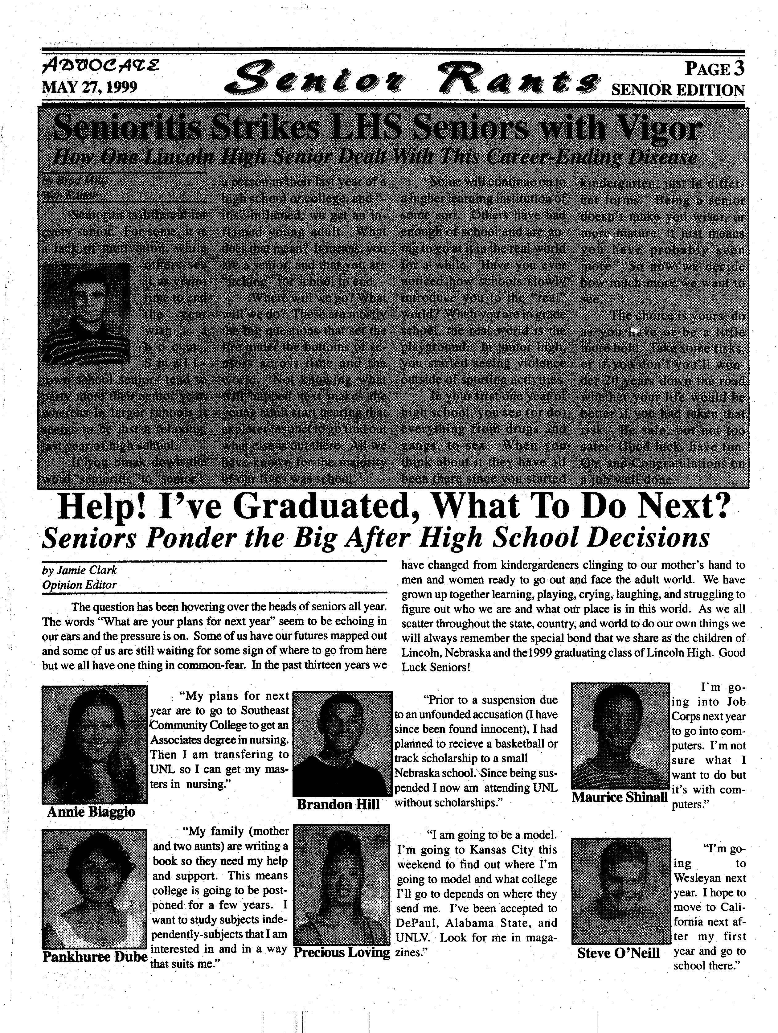 . _.. The question has been hovering over the heads of senior~all year. figure out who we are and what_otir_placeis in this world~ As we all . The.words "What are your plans f~·next yeaf.' seem to be echoing in ·_ scatter throughout the state, country; and-worldto.do our own things we our ears and the pressure is on. Some of us ha.veour futures mapped out will always re~emberthe special bond that we ~hare as the children of and someof us are still waiting for some sign of where to go from here · Lincoln, Nebraska and thel 999 graduatingclass of Lincoln ~igh. (lood ·but we all have one thing in cQmmon-fear.In the past thirte~n years we, _ Luck Seniors! _