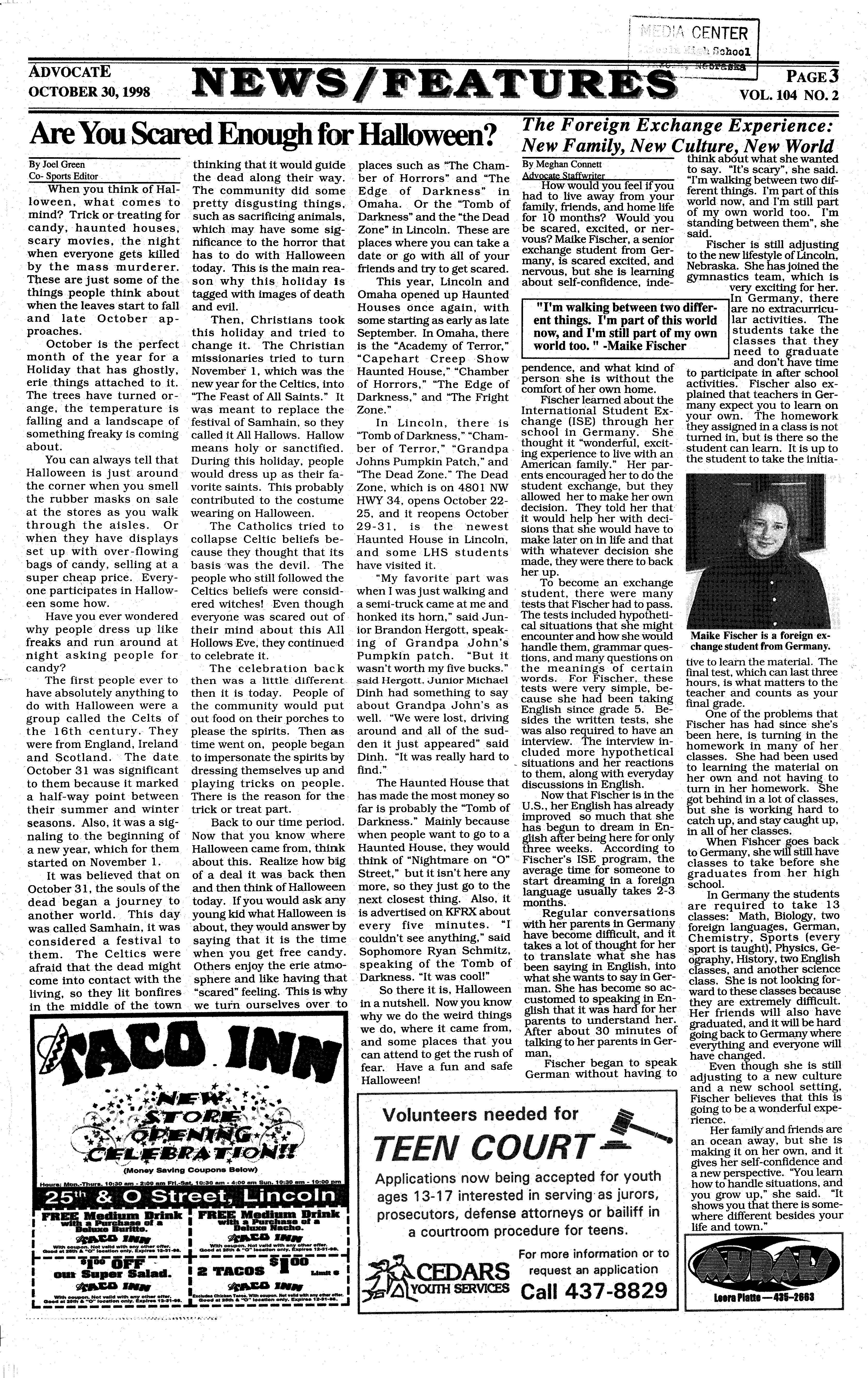 d ·M·ii G • entered. Lmcoln High · And of course the · coin High should be proud of - an o y e1ger · - confused. One of the number one complaint themselves for providing a comThey entered Lincoln High most confusing things that all sophomores have fortable environment for the new , unable to leave their 'middle about Lincoln High was is not being able to leave sophomores. As sophomores school' cliques, crowding the the location of classes campus for lunch. · preparedforthenewschoolyear, · ha11ways, and sneaking out to duetotheseparationof "Why can't 10th visions of vicious seniors lunch. We all know who they the even and odd class- graders go out to eat in- haunted them, but their nightare - scruffmores. Toe upper- .rooms. "Ifigothewrong stead of eating in the maresstoppeclafterthefirstday classmen try to scarethem from way I end up wa1king in smelly cafeteria and when they realized that seniors theha11sofLlncoui.High..Tohelp circles until I find my waiting in line for 20 didn't want to be caught dead understand what these sopho- room," said sophomore minutes?" asked Jessie even talking to a them.··· mores are going through we Tiffany McMeen. Sebek. If sophomores do · After overcomingtheir fears, asked them to share with us · .Also confusing to raphicByEric choose to leave campus and finding their classes, sophotheir views of Lincoln High. sophomores coming for lunch, they run the mores are beginning to enjoy