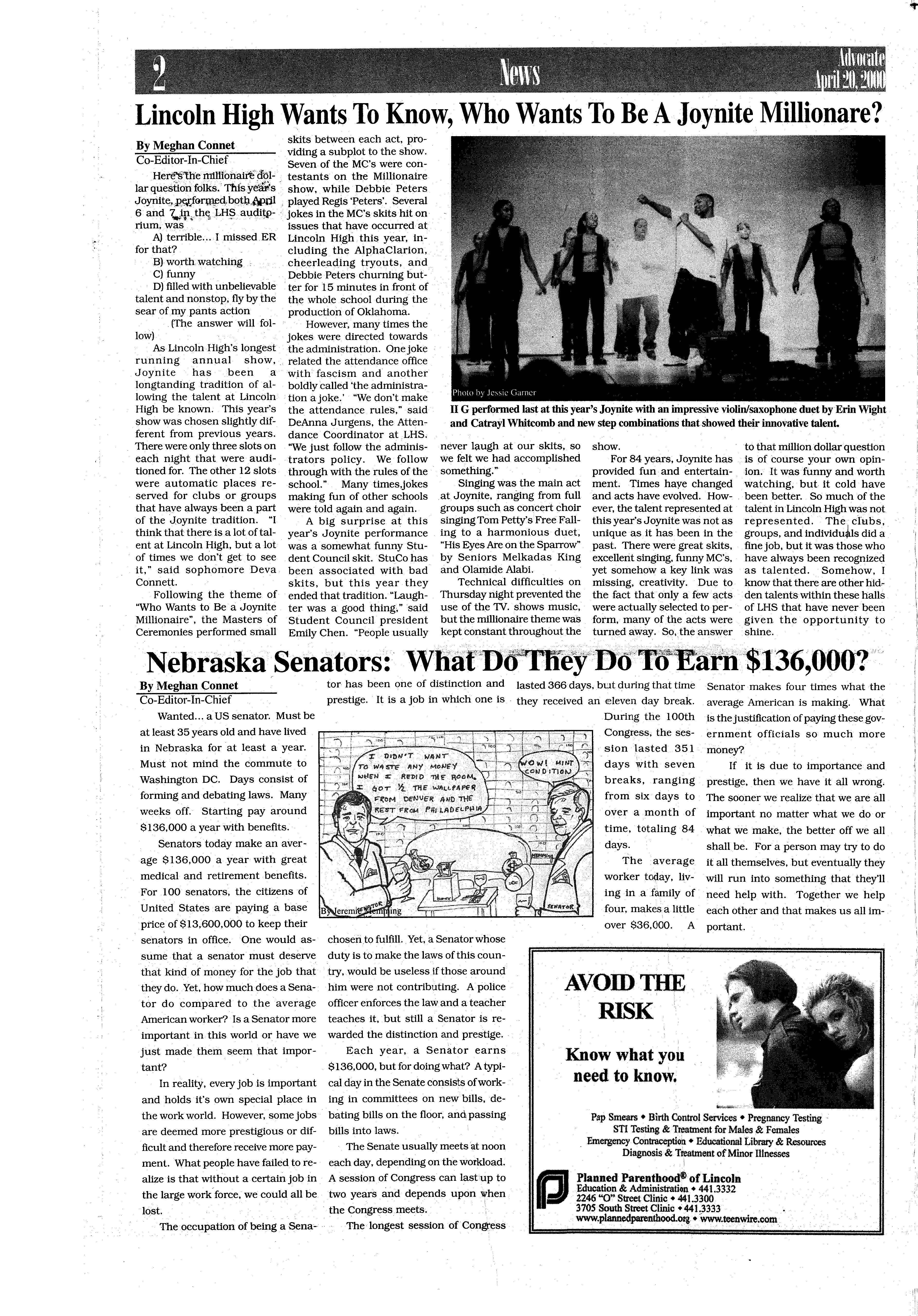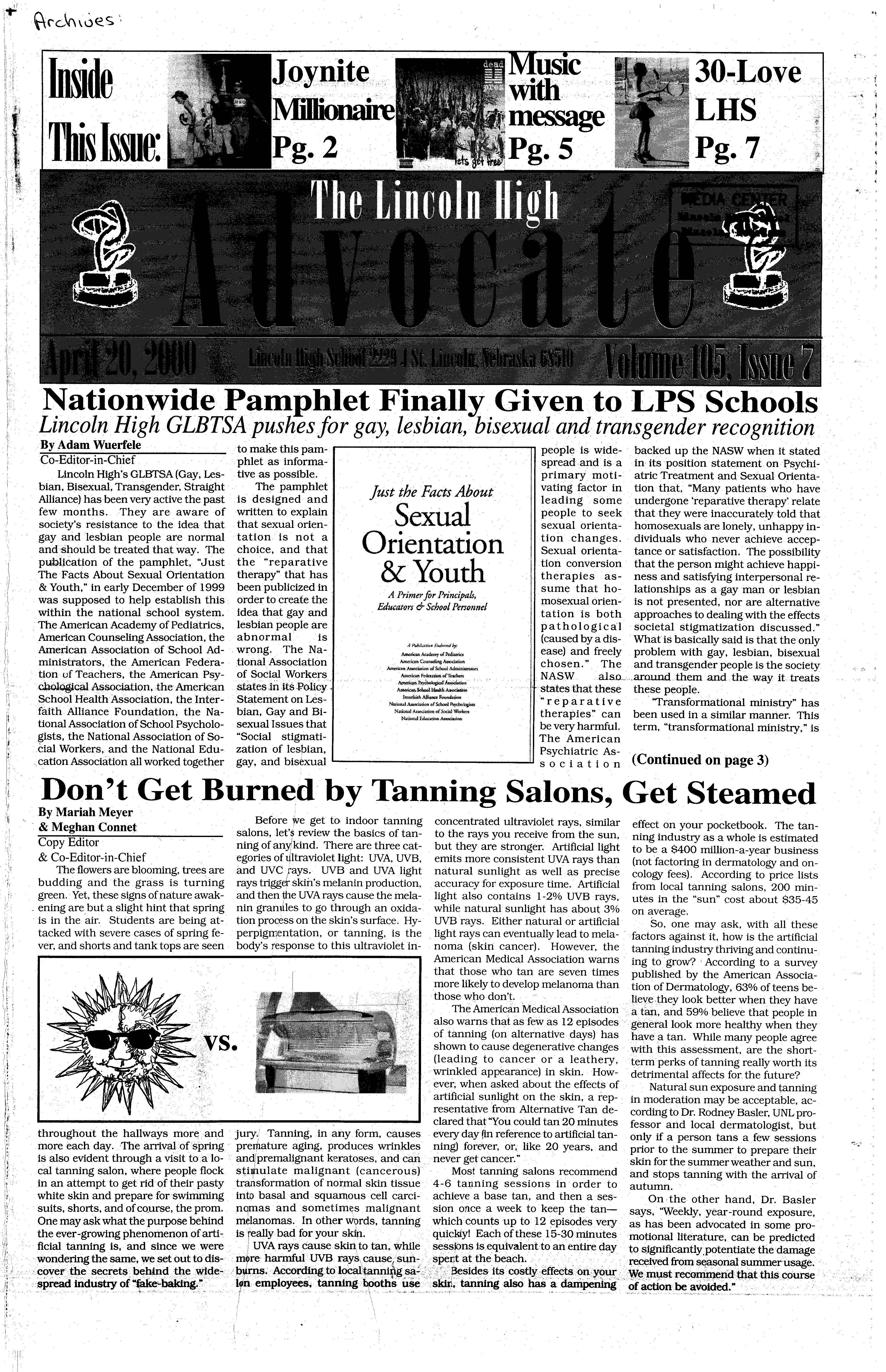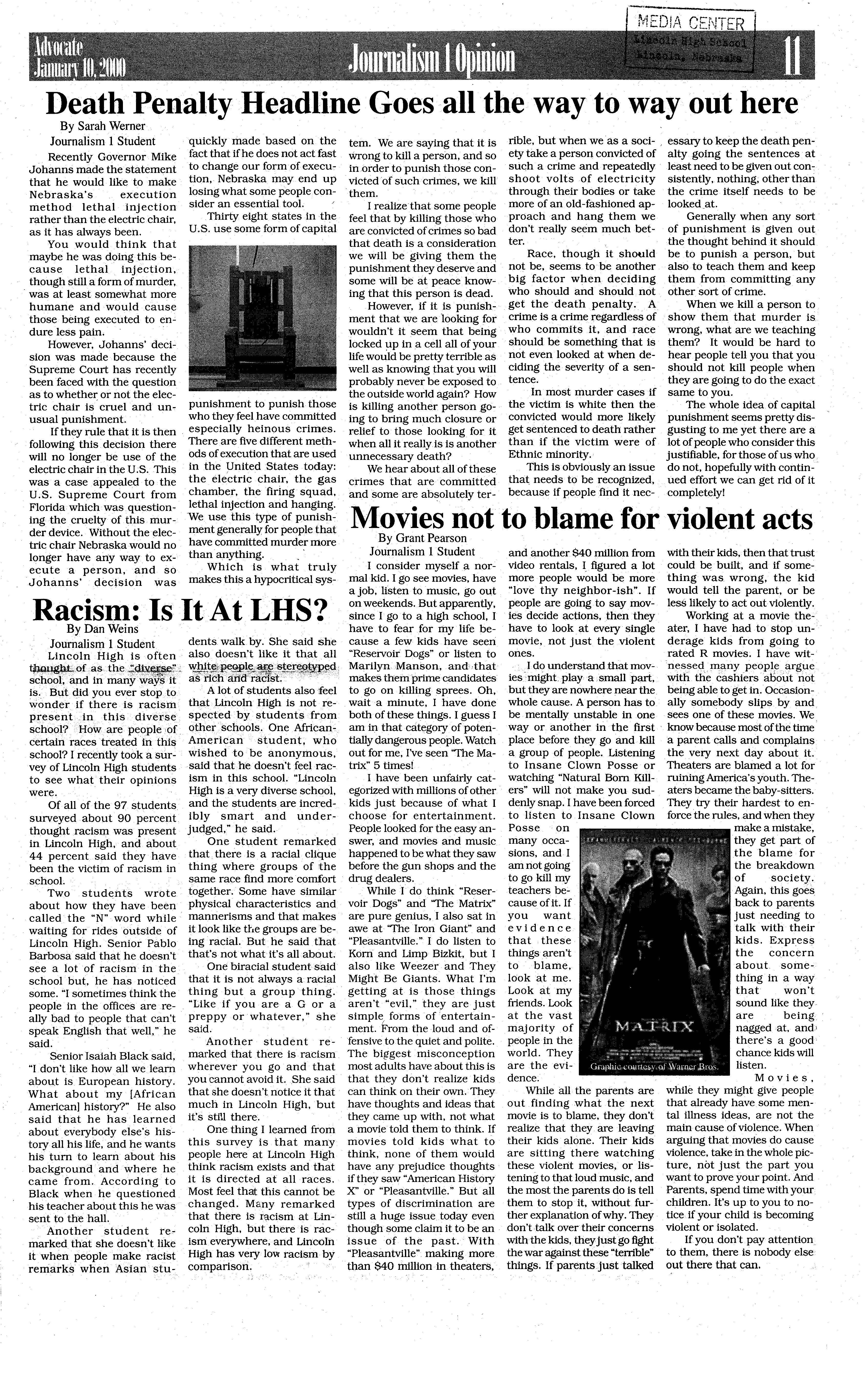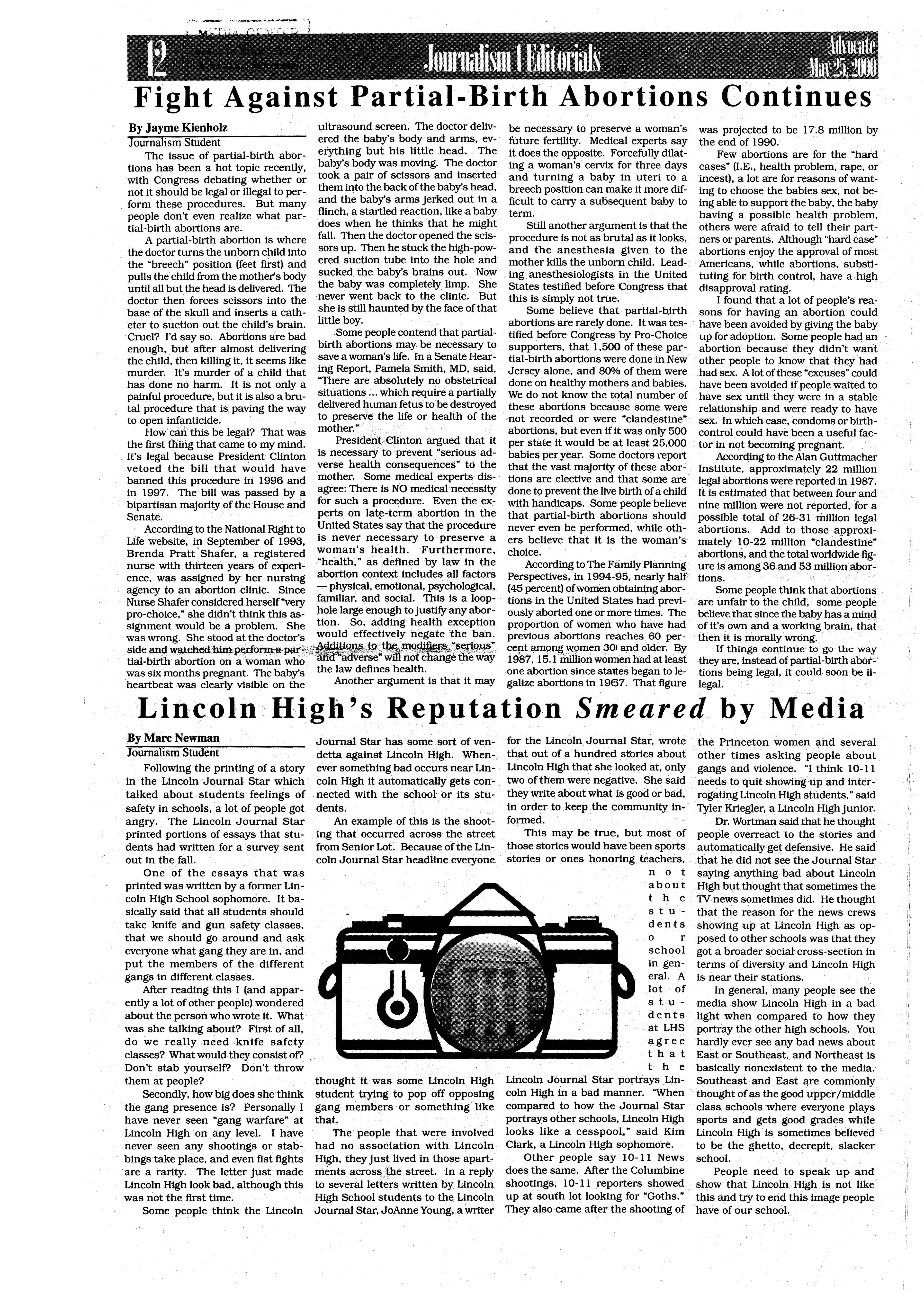 Following the printing of a story · ever something bad occurs near Lin- • Lincoln High that she looked at, only · gangs ·and violence. "I think l 0 11 iri ·the Lincoln Journal Star which ·.coln High it automatically gets con_ two of them were negative She said ·•needs to quit showing up and intertalked about students feelings of ·.nected with the school or its stu- theywriteaboutwhatisgoodorbad; rogatingLincoln Highstudents,"said safety in schools, a lot of people got dents. · · · in order to keep the ccommunity in~ Tyler Kriegler, a Lincoln High junior angry. · The Lincoln •Journal ·Star An example of this is the shoot- formed. Dr. Wortrrian said that he thought printed portions of essays that stu- ing that occurred across the street This may be true, but most of people overreact to the stories and · ·dents had written for a survey sent · from Senior Lot. · Because of the Lin- those stories would have been sports automatically get defensive. He said out in the fall. coin Journal Star headline everyone stories or ones llonoring teachers. · that he did not see the Journal Star