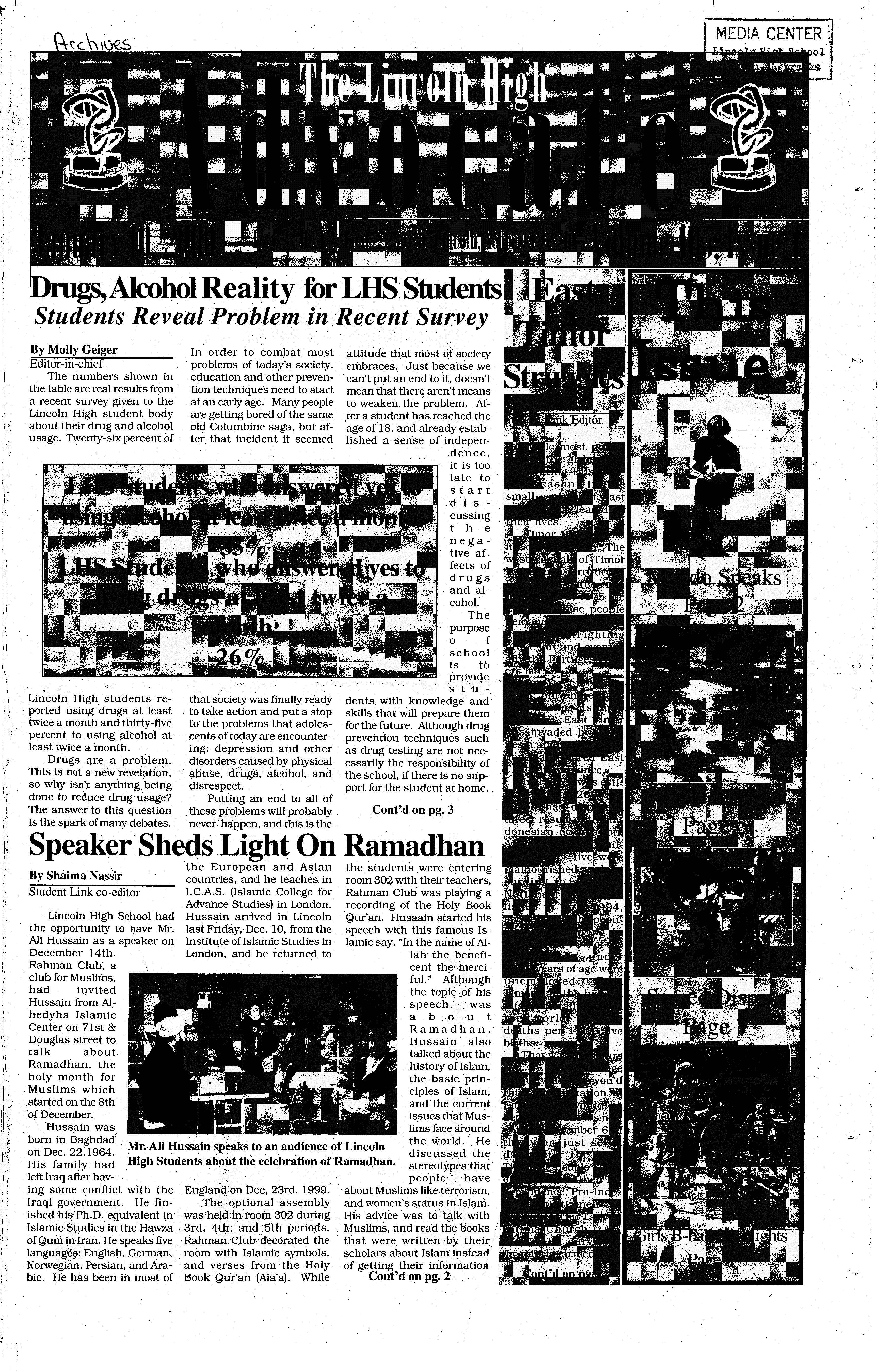 . was ·called "the ·region of Muslims in all of Bosnia, Al- cans d()n't know their Student Link Editor · Balkans," was u ,nder the b ;ania, - - Kosovo, and stoi:tes or the American Muslim's c-ontrol until the Ot- ·c :hechyanains is not less - government's rules in A year ago Albania was in - toman Empire began to be tJha.n 95°/o,' while 90o/o of their cases. _ - the _ news constantly .- There, weakened and the Russian --'-Serbs are Christians. There - -·Sophomore Hatixhe were very quick actiotl~ cm<JEmpire lnfluen<;ed the area. h :as never been a peace Govorl is a Lincoln High unclear information about All of those small countries there. student and an Alb a\ that regior in American me- were seized and put together · In 1998 the United Sates nian refugee. < She has dia. Most of the news was , · · been here - for four about American troops that - months. On March 3, went there. Now we hardly --.1999 a Serbian officer hear anything about Albania. ; came to her familiy's It seems that the war ended llouse warning them to and president Slobodan - · - leave immediately._ - At Milosivic acquiesced to the -- that time Govori lived world's voices. The general - with her mother and two image of the people is that ev- · other sisters, ' :Katlma, -_ erything is fine now, and the and Rukaia. They · Albanian people went back to - moved to another house their homes in peace · Actu- - - in a sma1l village called ·ally, more than 6QO/oof the Al- Brestena. Her brother banian people ended up as _ · Xhafgr Govori and _ his refuges in many countries, wife used to live there, including the United States. but they had already left We have about 25 -families in to another place They Lincoln, and we also have 6 - .·did not know where he - Albanians students here at was. · _ _ --·.Lincoln High School. · · On the March 31, Most of us don't even six more Serbian sol- - kn~w the Geography or the ···. ,· --· diers came telling them