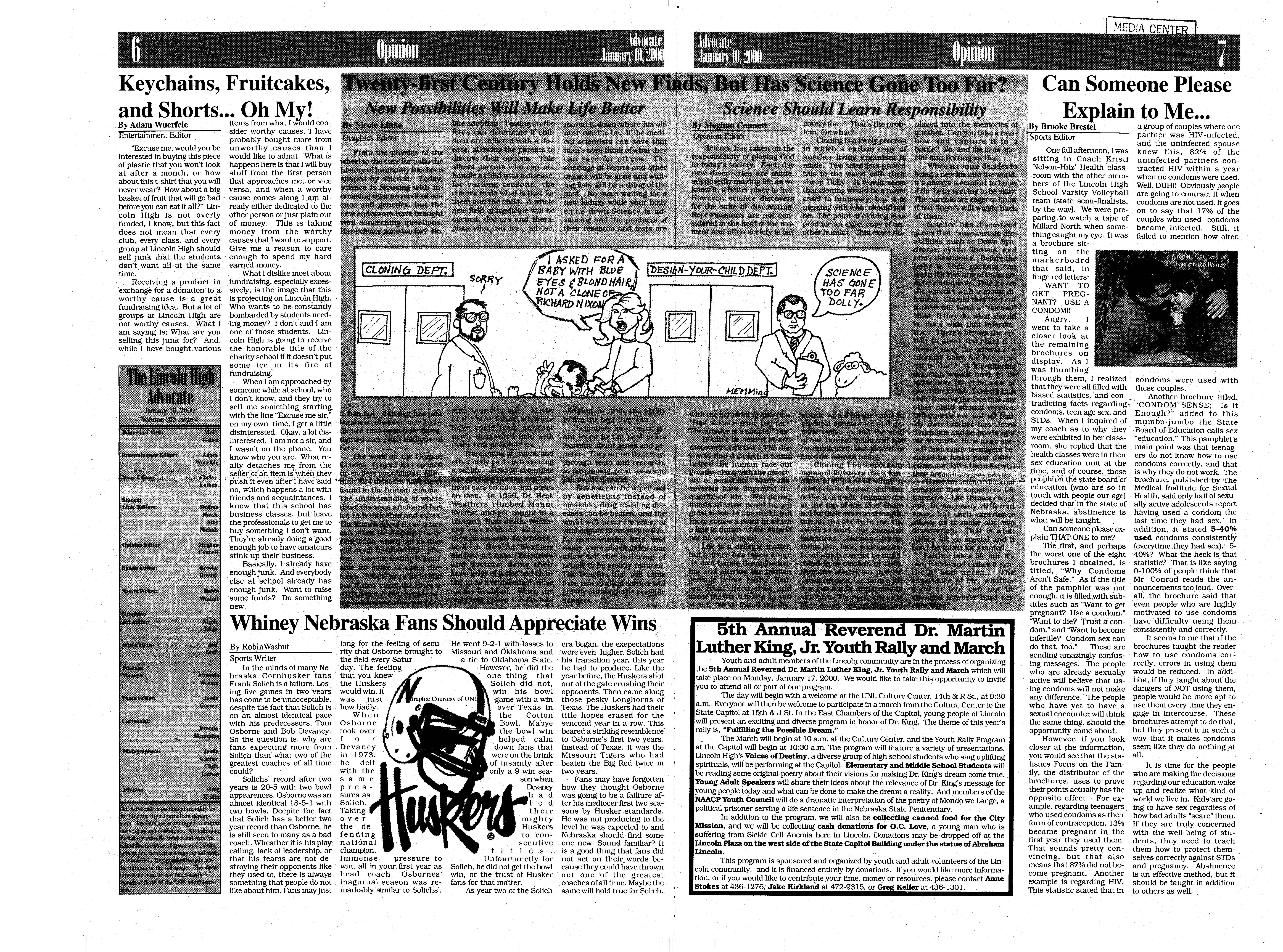 After reading this I (and appar- · lot of In general, many people see the ently a lot of other people) wondered s t u - media show Lincoln High in a bad about the person Who wrote it. What ·· de n ts light when compared to how they · · was she talking about? First of all, at LHS portray the other high schools. You do we really need -knife safety agree hardly ever see any bad news about classes? What would they consist of? , t ·h ·a t • East or Southeast, and Northeast is Don't stab yourself? Don't throw ·. · t h · e ·•basically nonexistent to the media. them at people? thought it was some Lincoln High · Lincoln Journal Star portrays Lin- Southeast and East are commonly · -