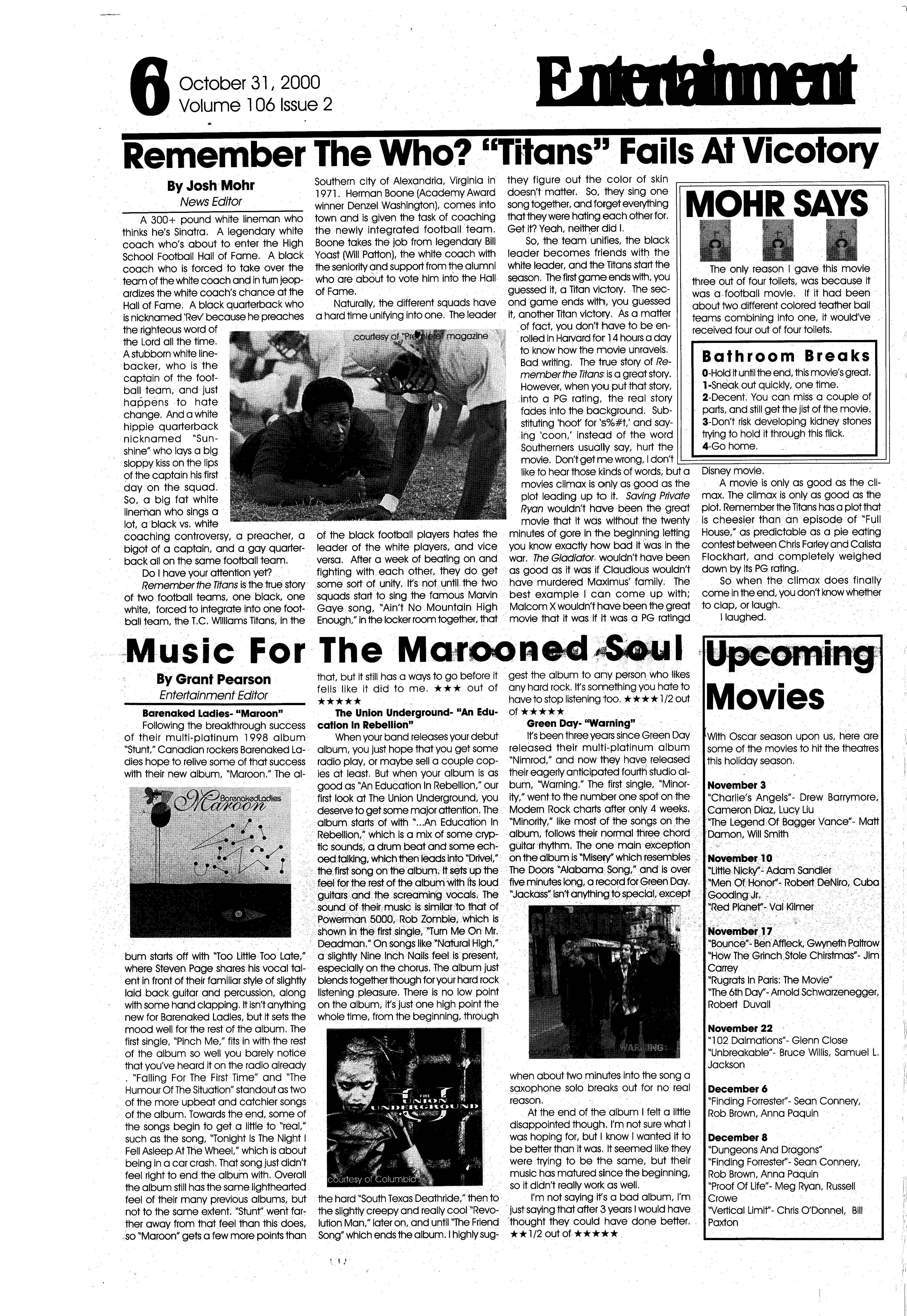 Thiswas the·first movie to be # l for the mind of another person. When a brufuture. If you missed this one in theat~rs, ·· pe·ned. This claymation film from the · ·two weeks in a row in nine weeks. That has· tal serial killeris caught after he goes into you should rent it when it comes out on ·· people who brought you "Wallace And to say something, right? "Hollow Man" is a coma, she is asked to go inside his video. It is O movie you can't miss · · Gromif'was one of the funniest movies··· another invisible man story, this time with mind in order to find his last victim before ''Shtaft''(R) of the summer, and could be enjoyed great special effects. Kevin Bacon goes · ifs too late. (Paramount). • June 16 · by all audiences. It opened back on· insane this time ·around, and seems to Thismovie isa wonder to look at, with · Shaft, the word just makes you think June 23 but sti.11hasn't finished itstheatri- have fun doing it. Thisdidn't fare to well · many ·stunning visual effects, but it also ·something is going to be cool. Samuel L. cal run: Ifs tentatively going to be re- · with critics, but I thought it was one of the tellsa very interestingstory.Ifs not a movie Jackson took on the legendary role (well, leased on video November 28, and if ' more enjoyable films this summer, and for QYO,ybod·,· c1 - +..,a., 9><9-Qool. 9 _;_,...,nephew of the legendary role ).·1tcen- · ·you can't catch it in theatres before that, has an explosion sequence that should violence, but if you can handle that, I ters around ,a racially motivated murder go and rerit it then. !Because this is one · go down in the record books. · highly recommend this one: .committed by Walter Wade Jr (Christian of the must~seemov,ies of the year. ''Space CoWboys''(PG-13)··. Therearemanymoremoviesthatde·Bale), who ends up getting off on ball.·. ''The Patriot'' (R)I (Warner Brothers) August 4 · serve some mention, but this is a top ten, Shaft must prove that he's' guilty, and (Sony) June 28 Who would have thought a movie · so I have to end it with that. beat up as many people· 05 possible in• Another war·movie, this one· focus-· about 4 old men getting a chance to.go In recap, this summer ·brought some the process. It won't be winning any 05 ing on the Revolutionary war, is about a into space could be really funny? Well, I good movies,some bad movies,and very cars for best picture; but hey, ifs Shatt, father (Mel Gibson) who is forced into · sure didn't, and thafs why .1was so sur- few great movies. Hopefully next year will what did you expect? battle alohg with his son (Heath Ledger). prised at this movie. Clint Eastwood plays be better.
