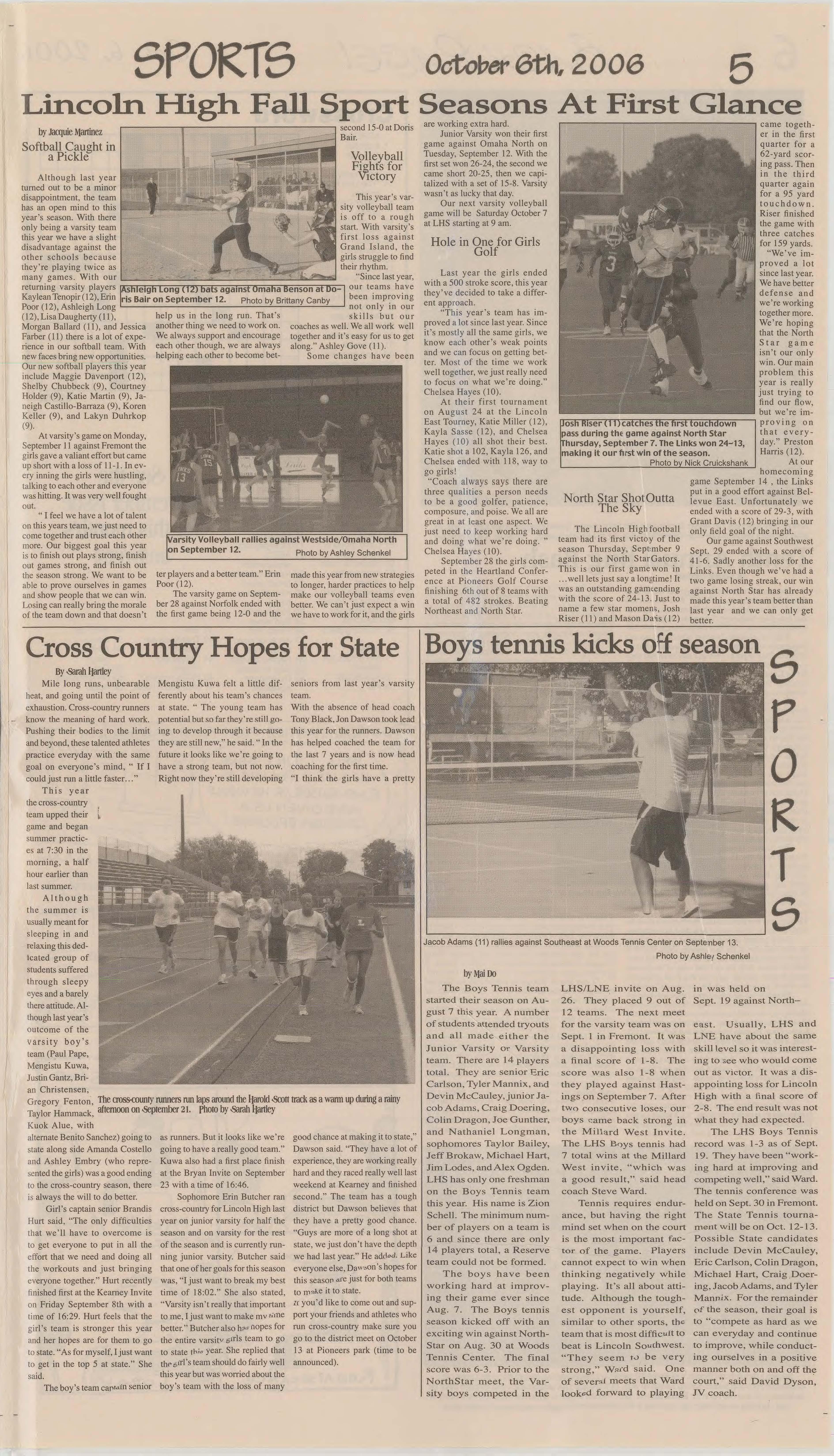 The girl's tennis season was over before we knew it. Varsity had a great season with a dual record of 4-3 and the girls placed l 8', 2 nd 7 th and 8 th in their tournaments. Junior varsity and reserves also did an amazing job this year. The varsity dual match against East on May 1, was here at Lincoln High. The girl's beat East 6-3. The day before on April 30 at the East Invite, Lincolrt High and East tied for 1st place. It all came down to wins vs. loses and Lincoln High won more games and placed 1st Varsity player senior Erica Anderson said, ''Everyone played really great. We knew we had to play rough, we did and we won. This was a huge win for the season." Currently the girls are 2 nd in the city, Lincoln Southwest is 1st •Throughout the season the girls have beat quality teams like East, Southeast, and Northeast. The girls played one of three singles on May 3 against Columbus. They couldn't finish due to the rain. However the match against North Star on May 7 didn't get rained out and the Links won 8-1.