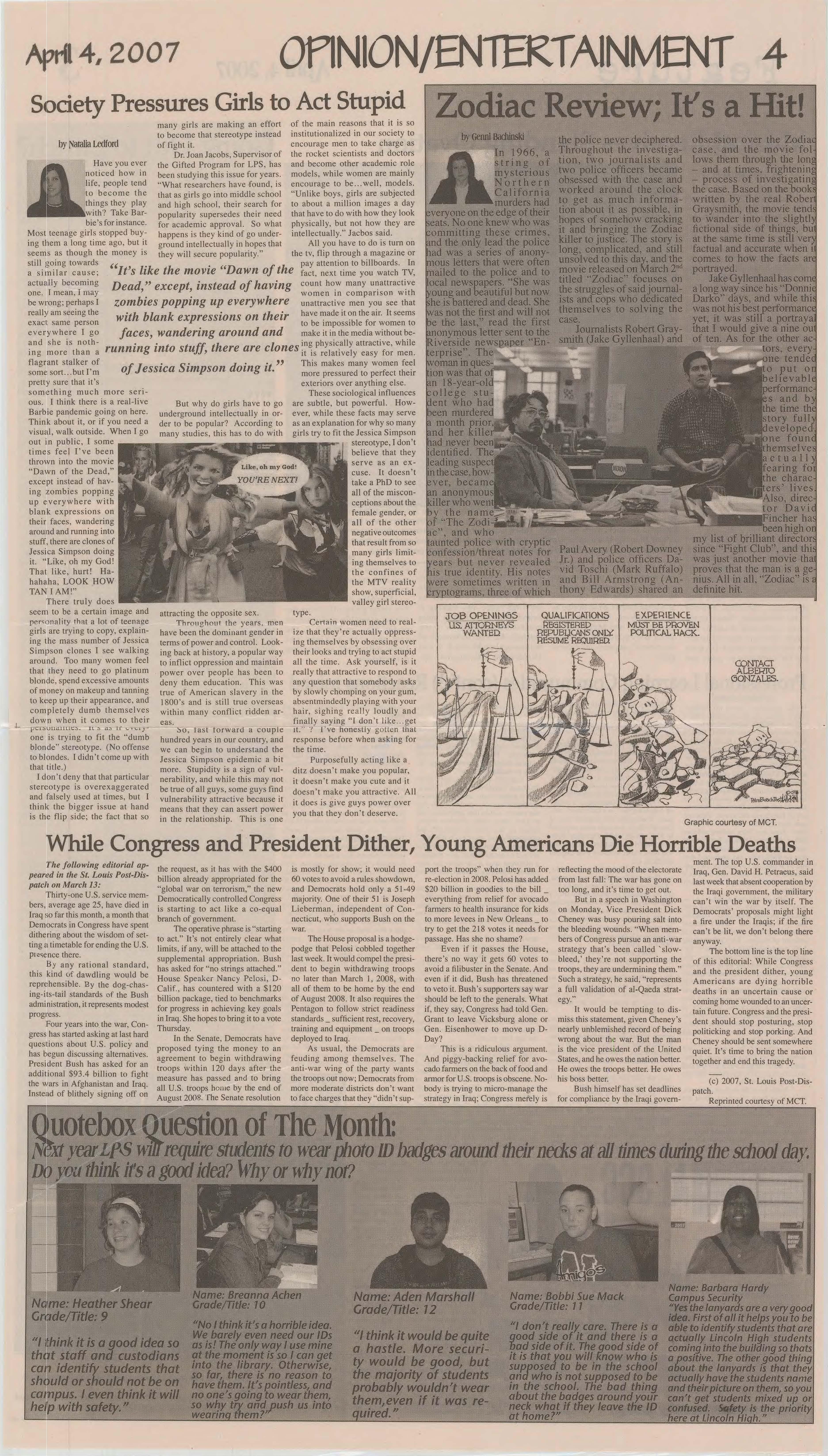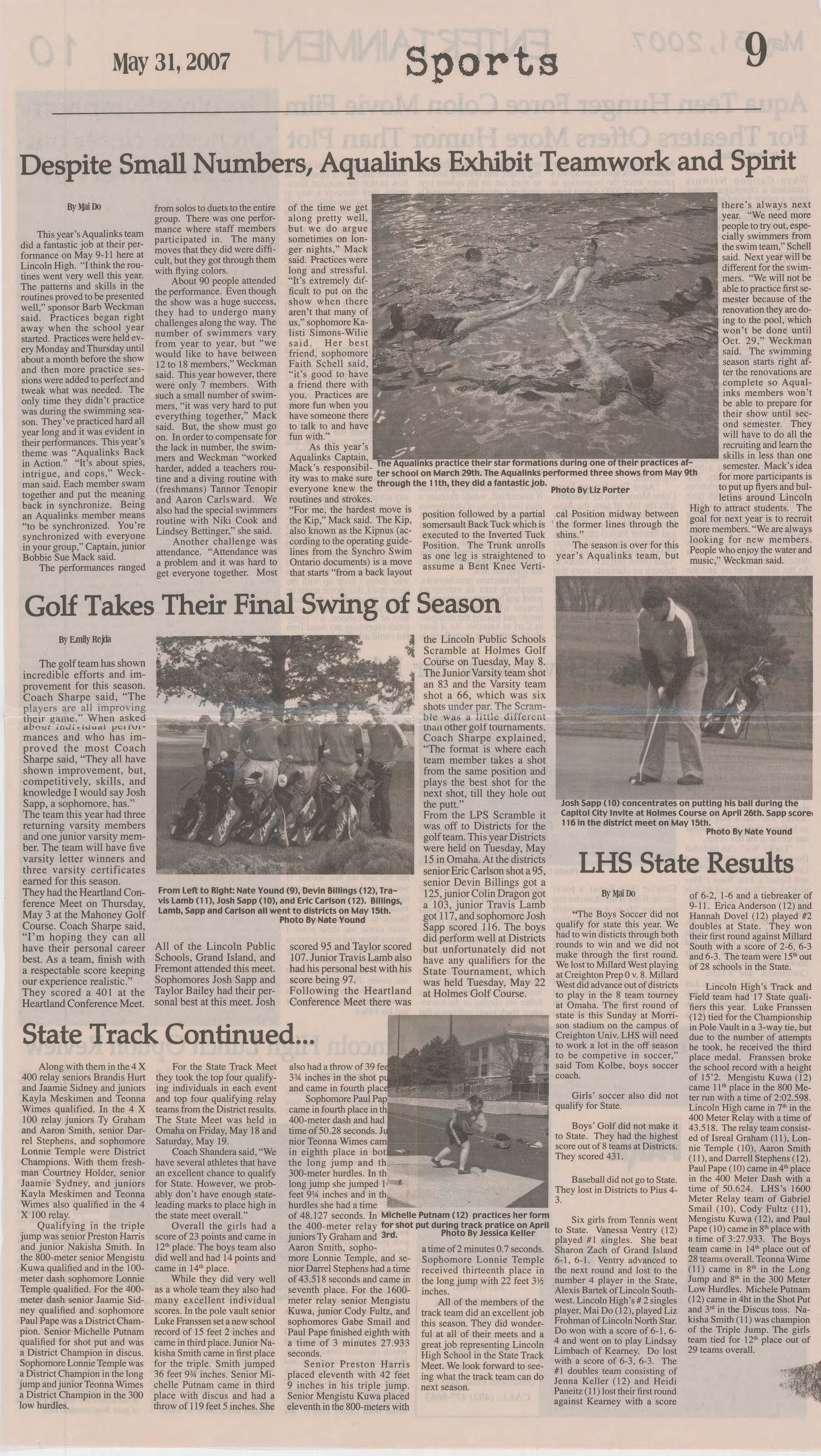 This year'sAqualinks team did a fantastic job at their performance on May 9- 11 here at Lincbln High. ''I think the routines went very well this year. The patterns and skills in the routines proved to be presented well," sponsor Barb Weckman said. Practices began right away when the school year started. Practices were held every Monday and Thursday until · about a month before the show and then more practice sessions were added to perfect and tweak what was n eeded. The only time they didn't practice was during the swimming season. They've practiced hard all year long and it was evident in their performances. This year's theme was "Aqualinks Back in Action." "It's about spies, intrigue, and cops," Weckman said. Each member swam together and put the meaning back in synchronize. Being an Aqualinks member means ''to be synchronized. You're synchronized with everyone in your group," Captain,junior Bobbie Sue Mack said. The performances ranged