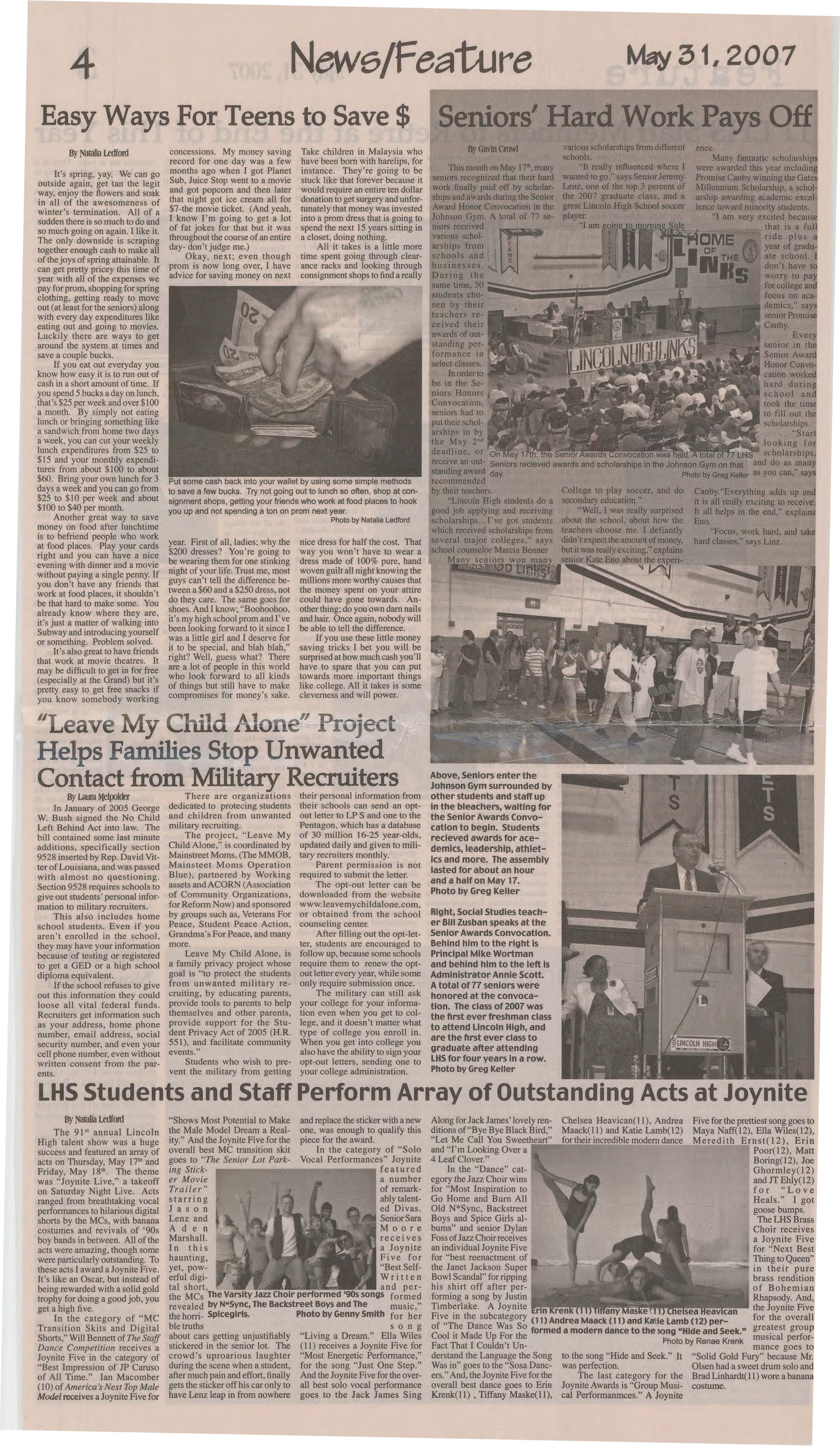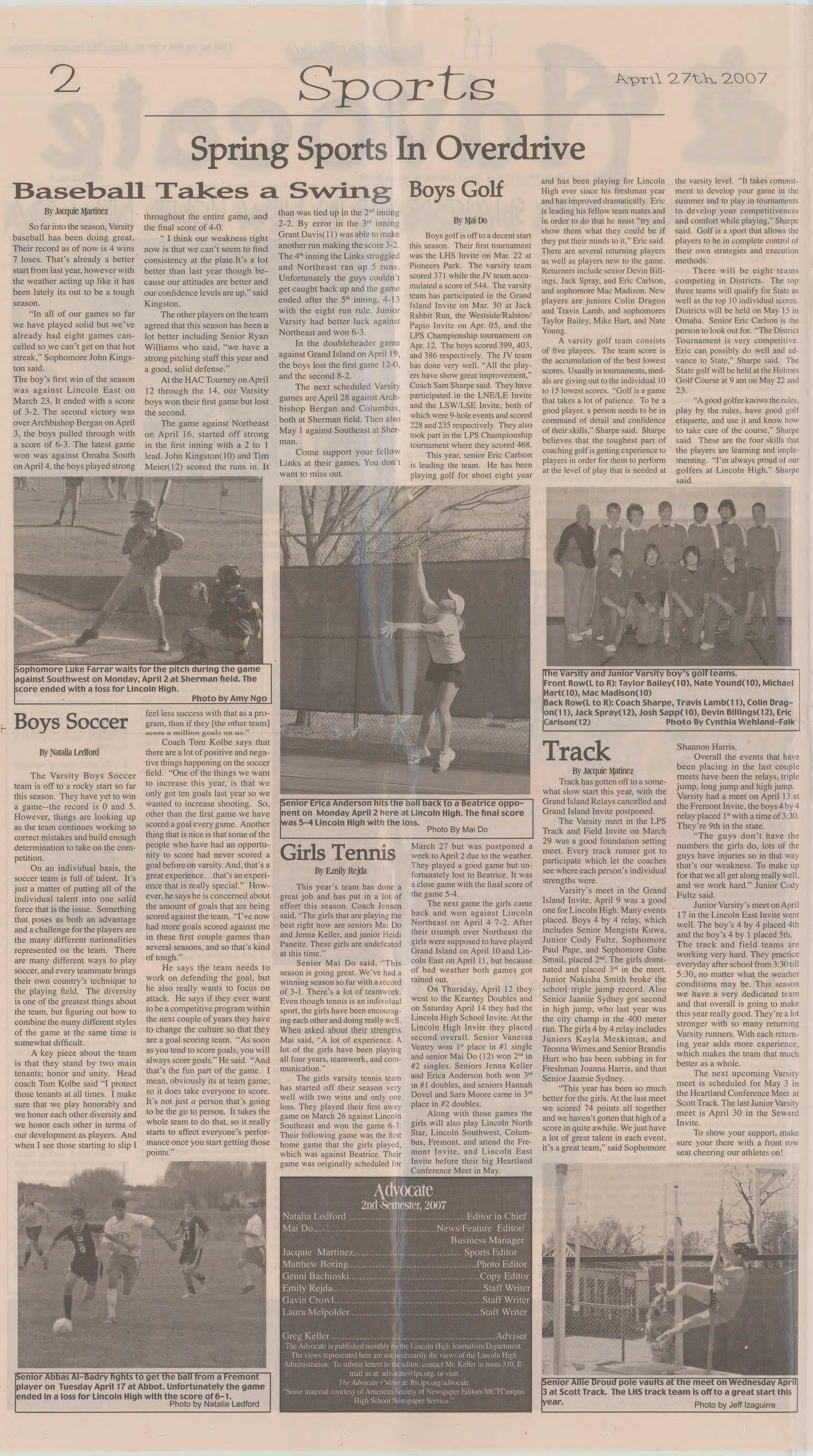 on April juniors Ty Graham and 3rd. Photo By Jessica Keller Aaron Smith, sopho- · a time of2 minutes 0.7 seconds. more Lonnie Temple, and se- Sophomore Lonnie Temple nior Darrel Stephens had a time received thirteenth place in of 43.518 seconds and came in the long jump with 22 feet 3½ seventh place. For the 1600- inches. meter relay senior Mengistu All of the members of the Kuwa, junior Cody Fultz, and · track team did an excellent job sophomores Gabe Smail and this season. They did wonderPaul Pape finished eighth with ful at all of their meets and a a time of 3 minutes 27. 933 great job representing Lincoln seconds. High School in the State Track Senior Preston Harris Meet. We look forward to seeplaced eleventh with 42 feet ing what the track team can do 9 inches in his triple jump. next season. Senior Mengistu Kuwa placed eleventh in the 800-meters with
