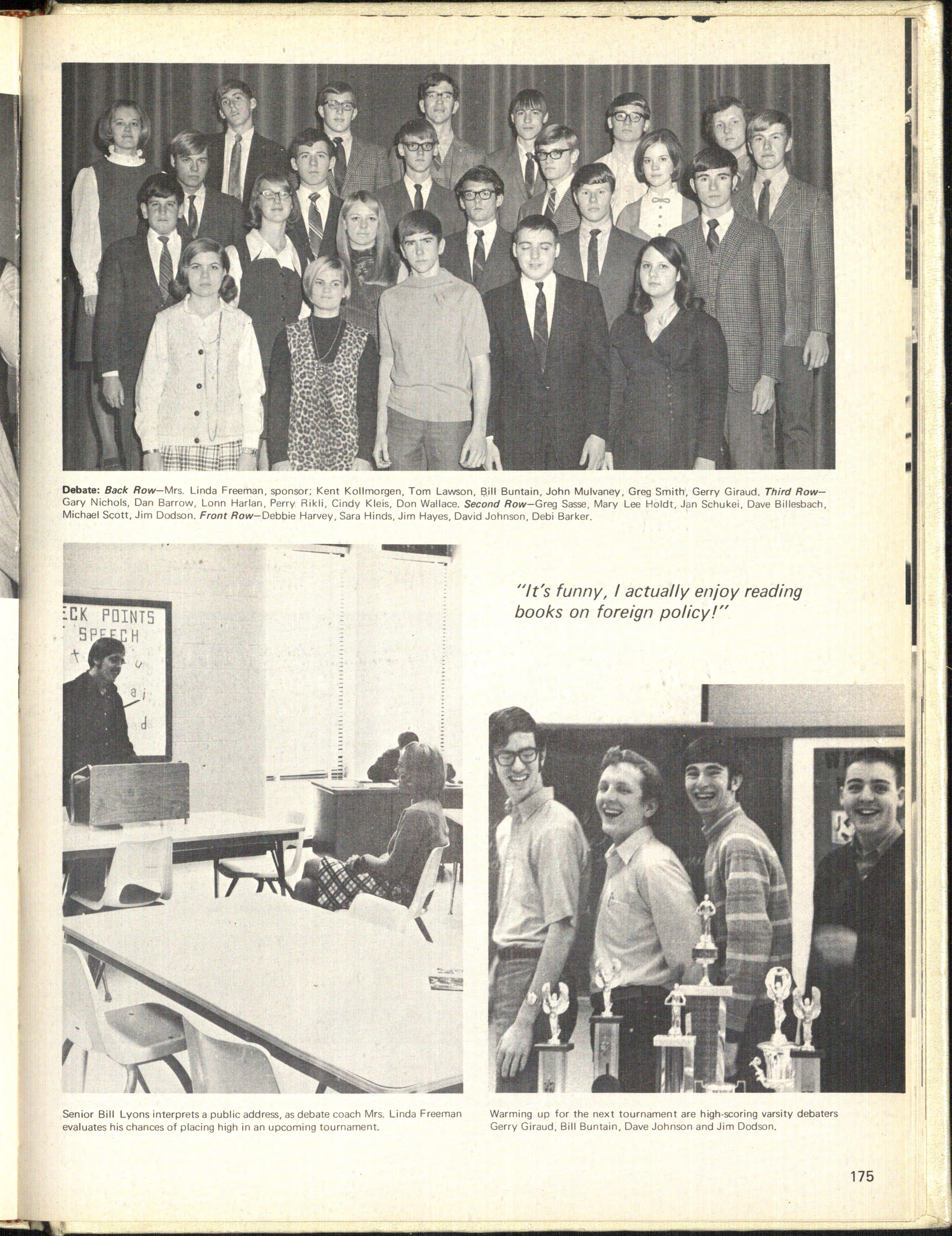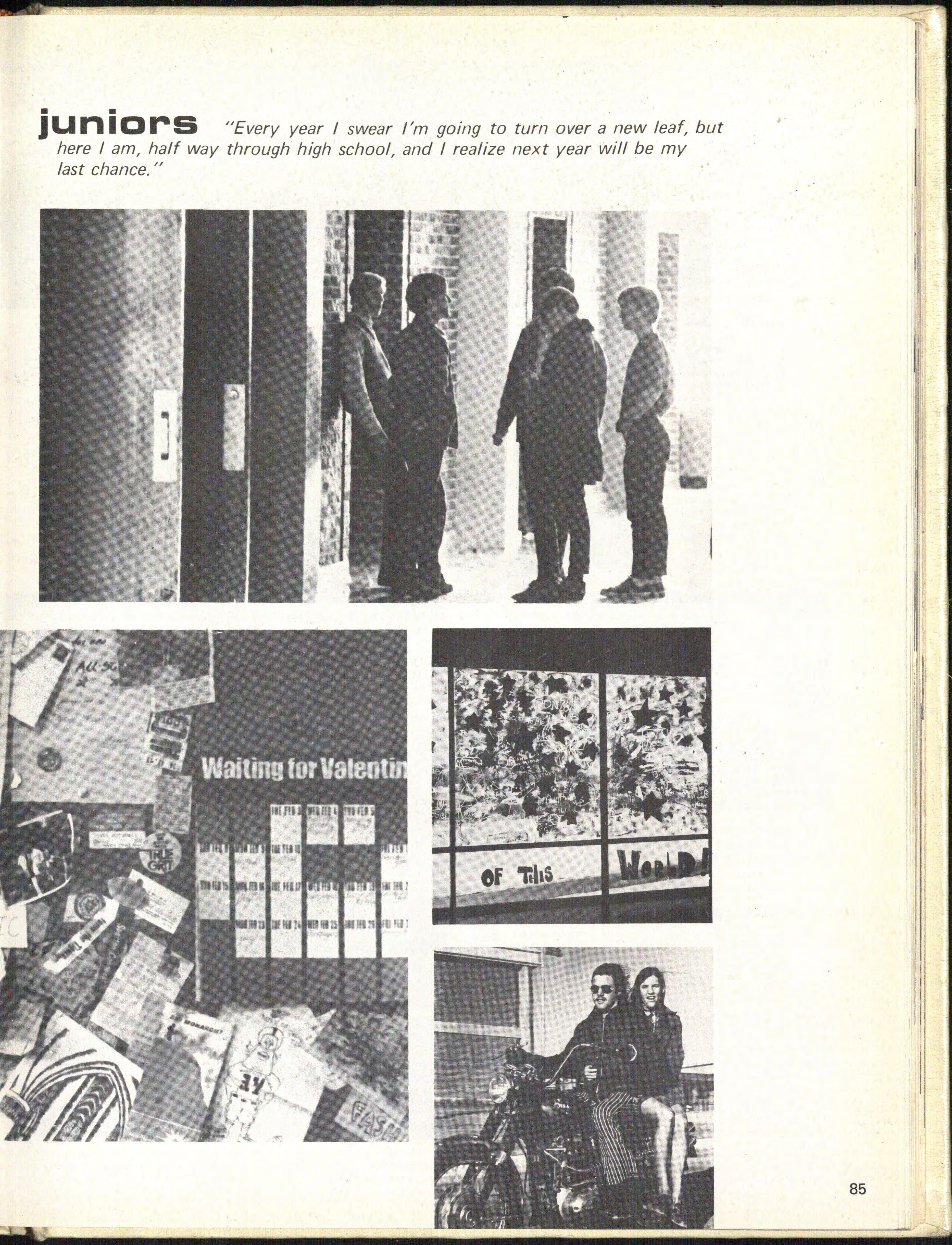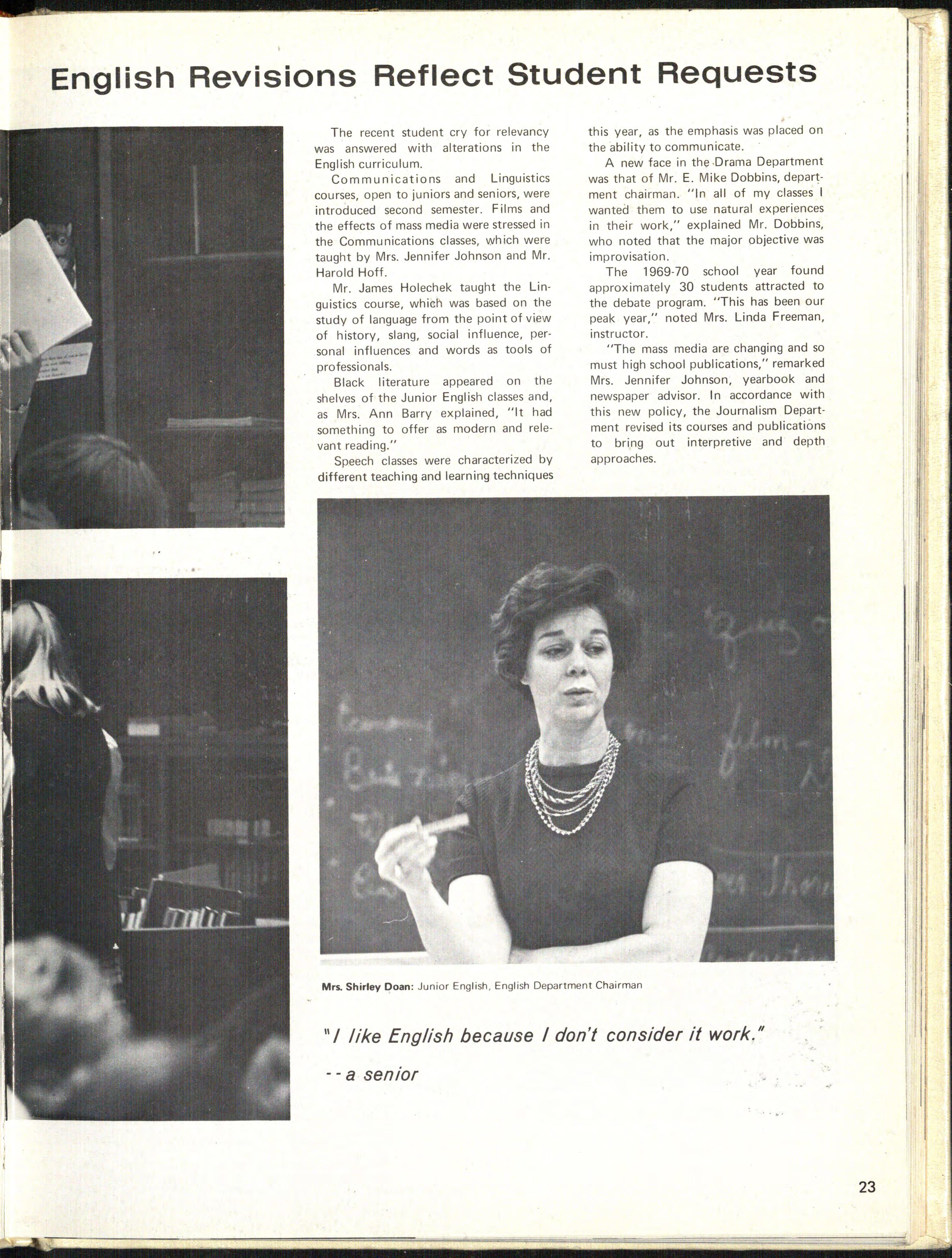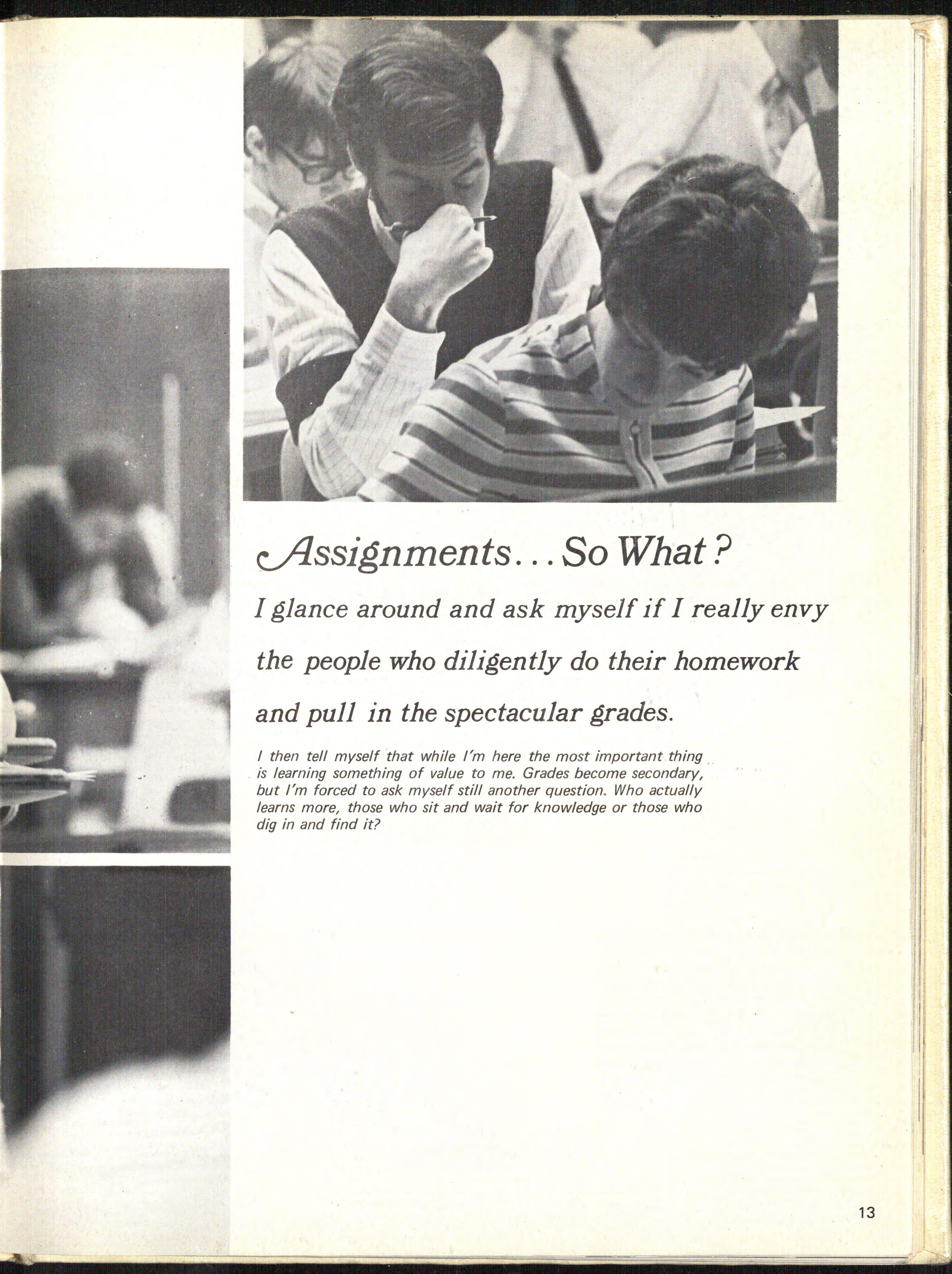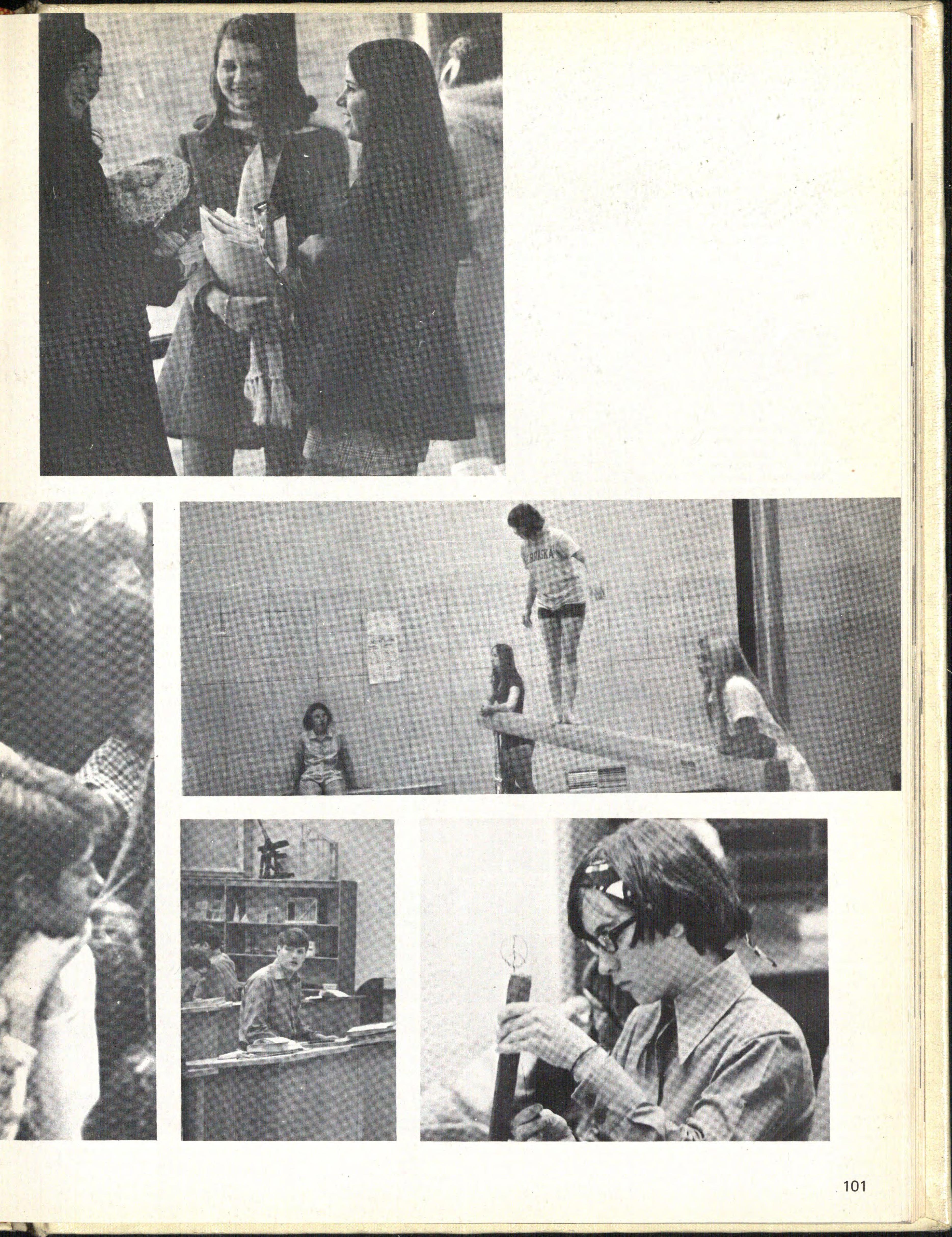 end of the day, others looked forward to a class. "In Philosophy-you talk about problems relevant to us right now; the teacher is well-read, humorous, talks on our level, understands our problems and keeps the class' attention," a senior said. Class discussions replaced lectures more and more. Performance classes and other methods were put into effect to create "a change of pace."